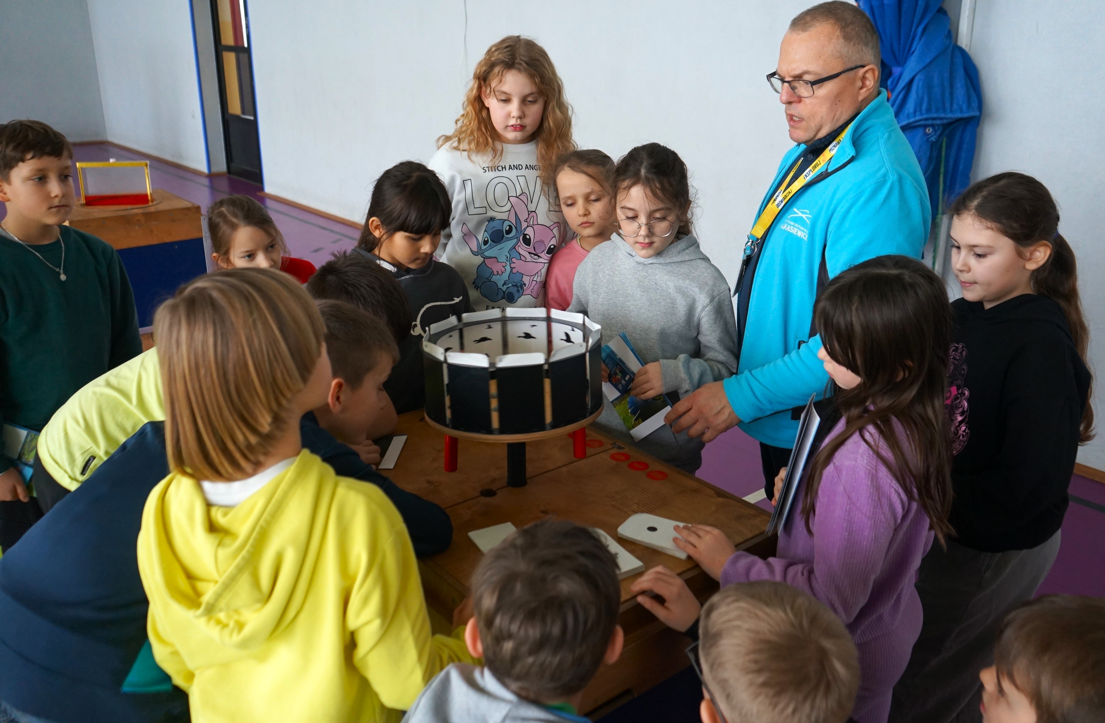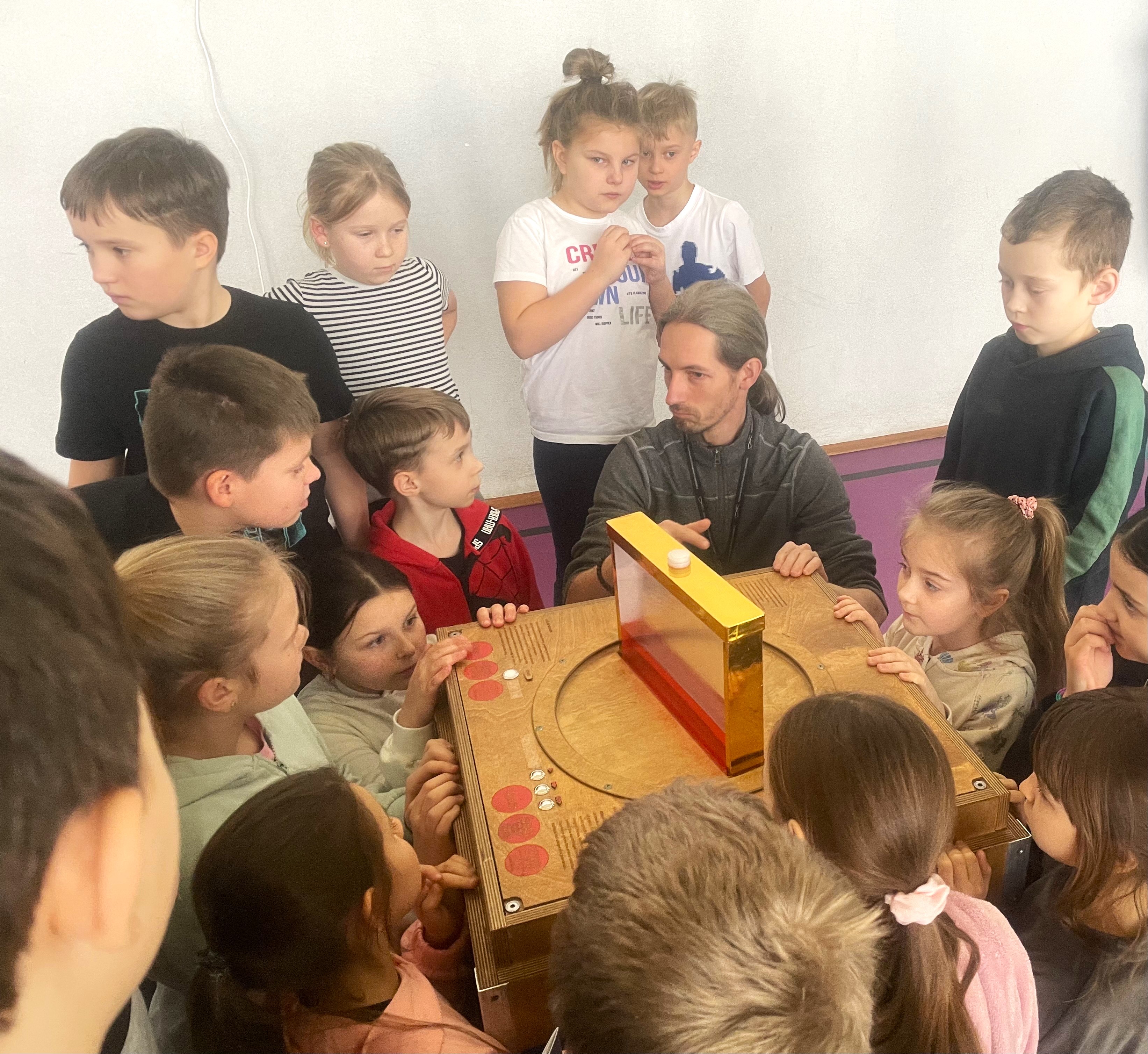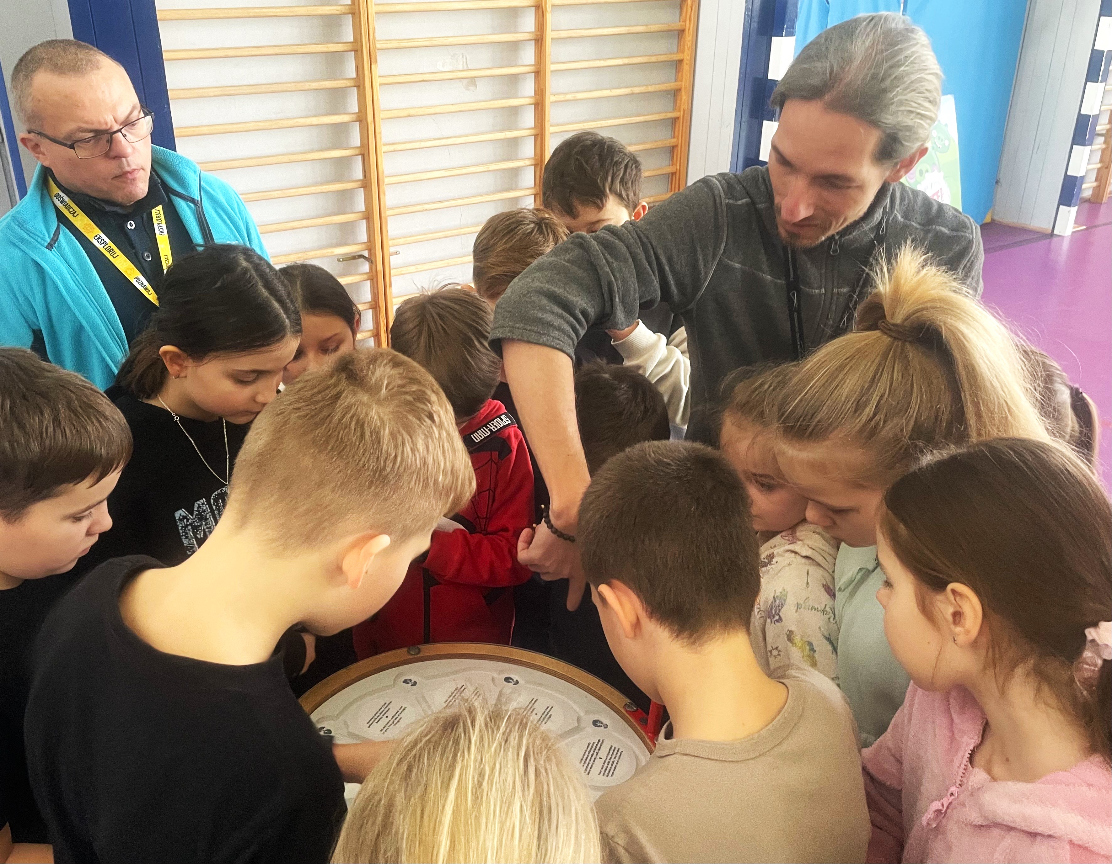 Nasz Partner Programu Aktywni – Błękitni Szkoła Przyjazna Wodzie - PCN Łukasiewicz - przyjechał ze swoją ciekawą mobilną wystawą, gdzie większość eksponatów była interaktywna i zachęcała do samodzielnego eksperymentowania. Wśród eksponatów, największym zainteresowaniem cieszył się ten, odpowiadający na pytanie: „Czy w wodzie można "wykopać" dół? Doświadczenie z wirującym akwarium pokazało, że tak - jest to możliwe, ponieważ woda pod wpływem grawitacji przyjmuje kształt naczynia, do którego została wlana (powierzchnia jest pozioma). Ale w momencie wprawienia akwarium w ruch wirowy woda, dzięki sile odśrodkowej, „rozsuwa się” w kierunku ścianek naczynia. Tak więc na środku akwarium powstaje „dół”.