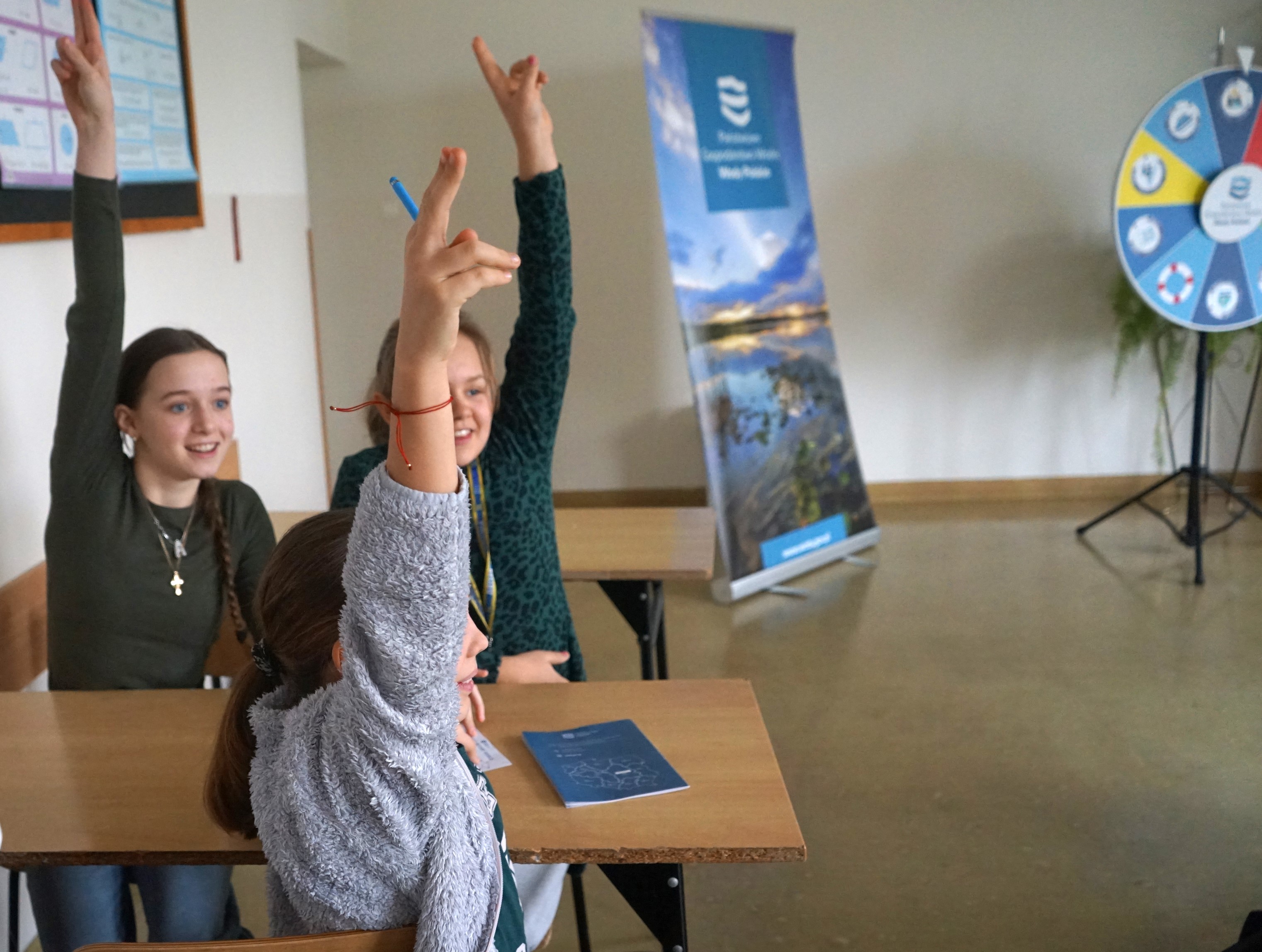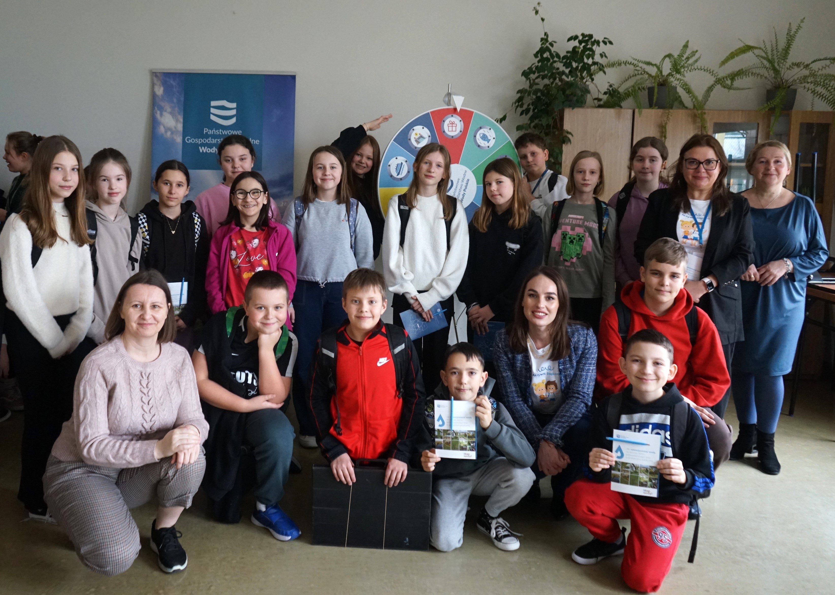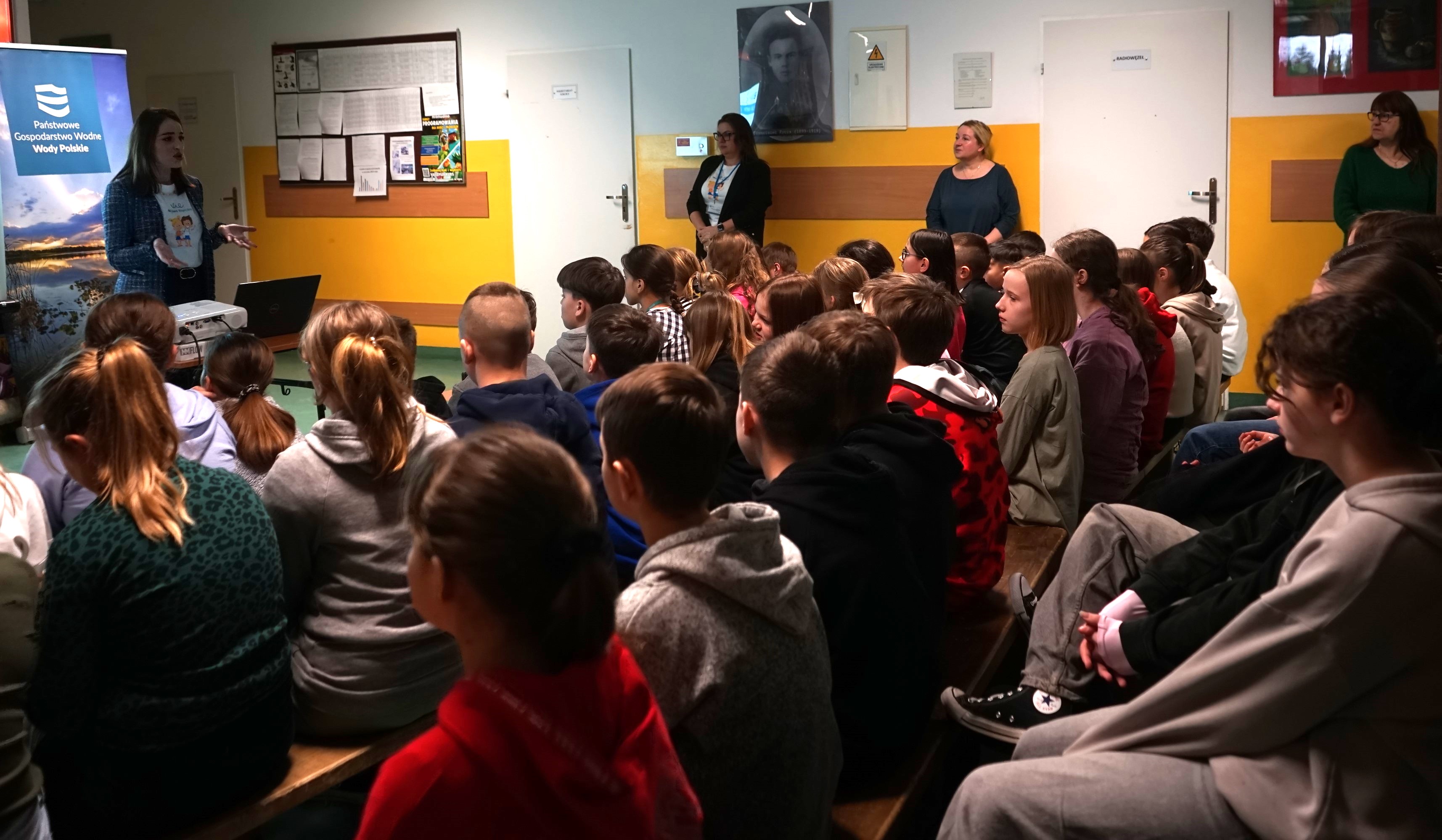 Poranek rozpoczęliśmy od prelekcji, jak aktywnie dbać o zasoby wodne i stan gospodarki wodnej w Polsce. Poruszyliśmy także dwa ważne tematy: suszę i powódź. Jesteśmy pełni zachwytu nad zaangażowaniem dzieciaków podczas części teoretycznej! Młodzież chętnie odpowiadała na pytania i dzieliła się pomysłami jak troszczyć się o wodę.