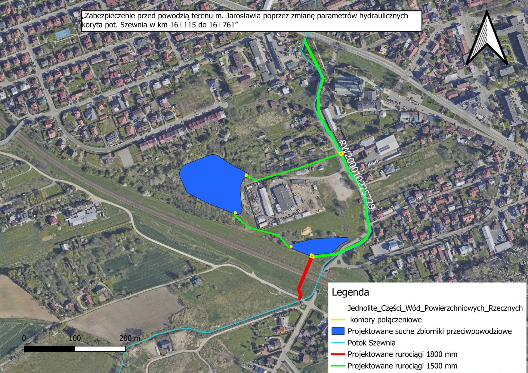 - budowę dwóch suchych zbiorników przeciwpowodziowych o łącznej pojemności 20 835 m3 zlokalizowanych w układzie kaskadowym w sąsiedztwie nasypu PKP,
