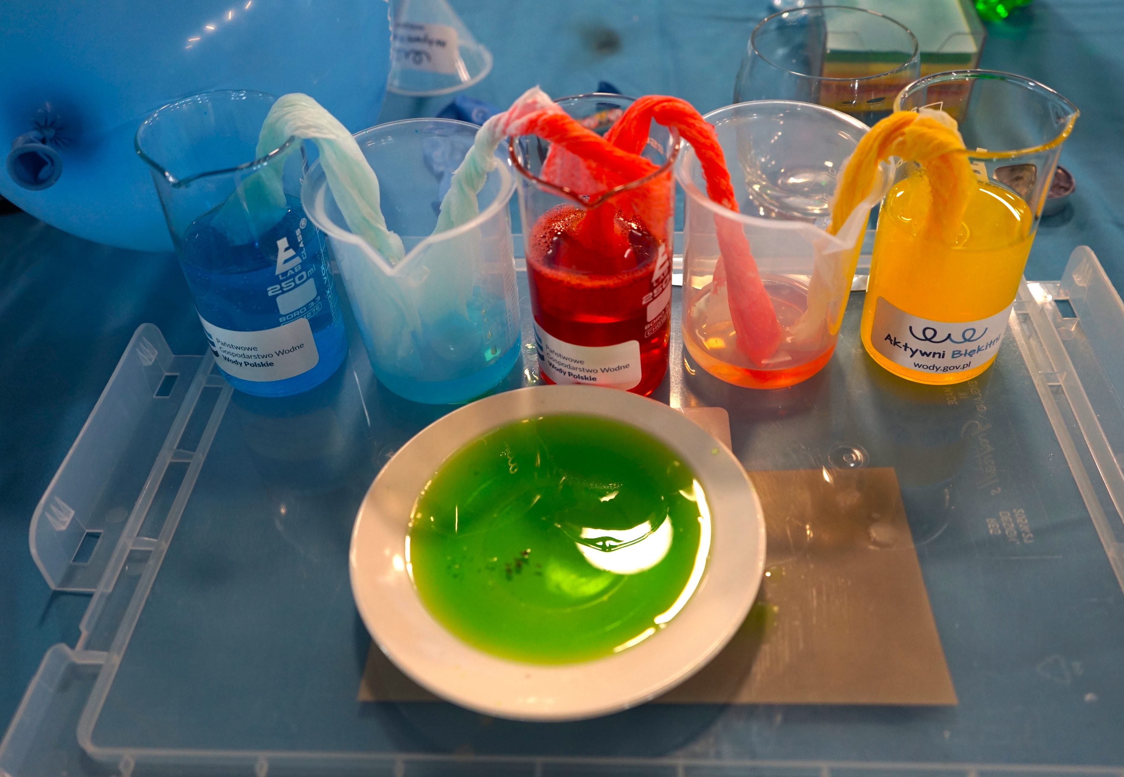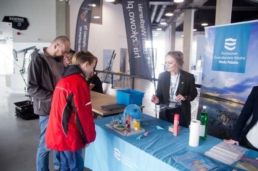 Tematem spotkania były „Wodne eksperymenty to jest to!” z edukatorami RZGW w Rzeszowie. Dodatkowo utworzona została specjalna strefa edukacji, z aktywnościami naukowymi i quizem pod nazwą „Wodne koło fortuny”. Wodne eksperymenty cieszyły się ogromnym zainteresowaniem. Podczas warsztatów uczestnicy dowiedzieli się czym jest woda, jakie ma właściwości i do czego jest nam potrzebna. Między innymi, sprawdzaliśmy dlaczego woda migruje? To kolorowe doświadczenie pokazuje, że woda może się w łatwy sposób przemieszczać, ponieważ w papierze znajdują się kapilary, służące do jej transportu, co czyni ten eksperyment zjawiskiem widowiskowym i długotrwałym. Aby wykonać je w warunkach domowych, potrzebujemy jedynie 5 przezroczystych szklanek, 3 barwników spożywczych i kawałek papierowego ręcznika. Naczynia ustawiamy obok siebie, co drugie naczynie wypełniamy wodą z barwnikiem. Z ręcznika papierowego składamy pasek. Paski zanurzamy jedną stroną w barwnikach, a drugą w pustym naczyniu. I już po chwili zaczynamy obserwować na paskach papieru kolorową wilgoć, a po kilku minutach woda dosłownie przechodzi do drugiej - pustej dotychczas szklanki. Po chwili puste szklanki zapełniają się kolorową, migrującą wodą, a po kilku godzinach poziom wody we wszystkich naczyniach wyrównuje się i można zaobserwować w nich nowo powstałe kolory tęczy.