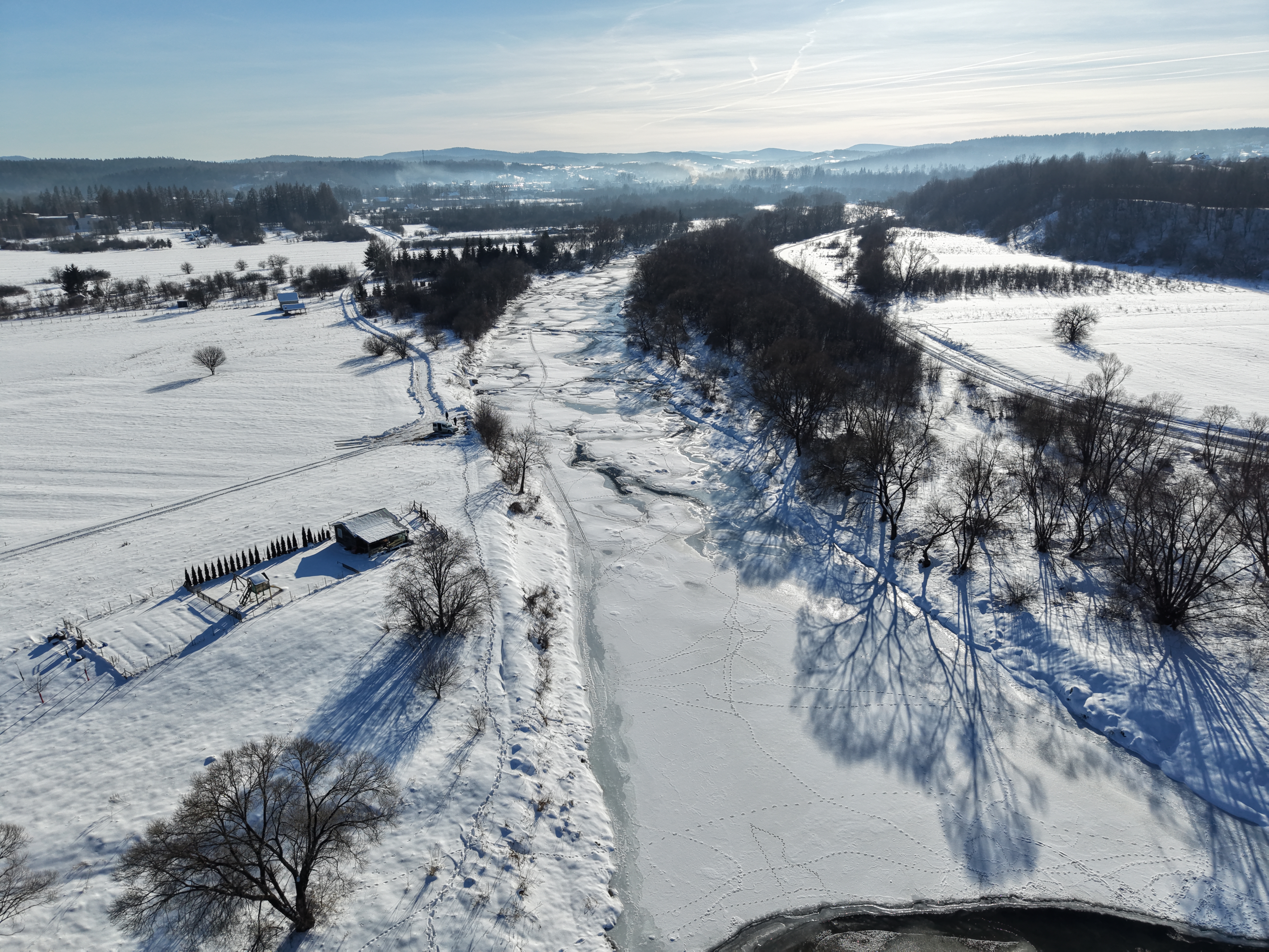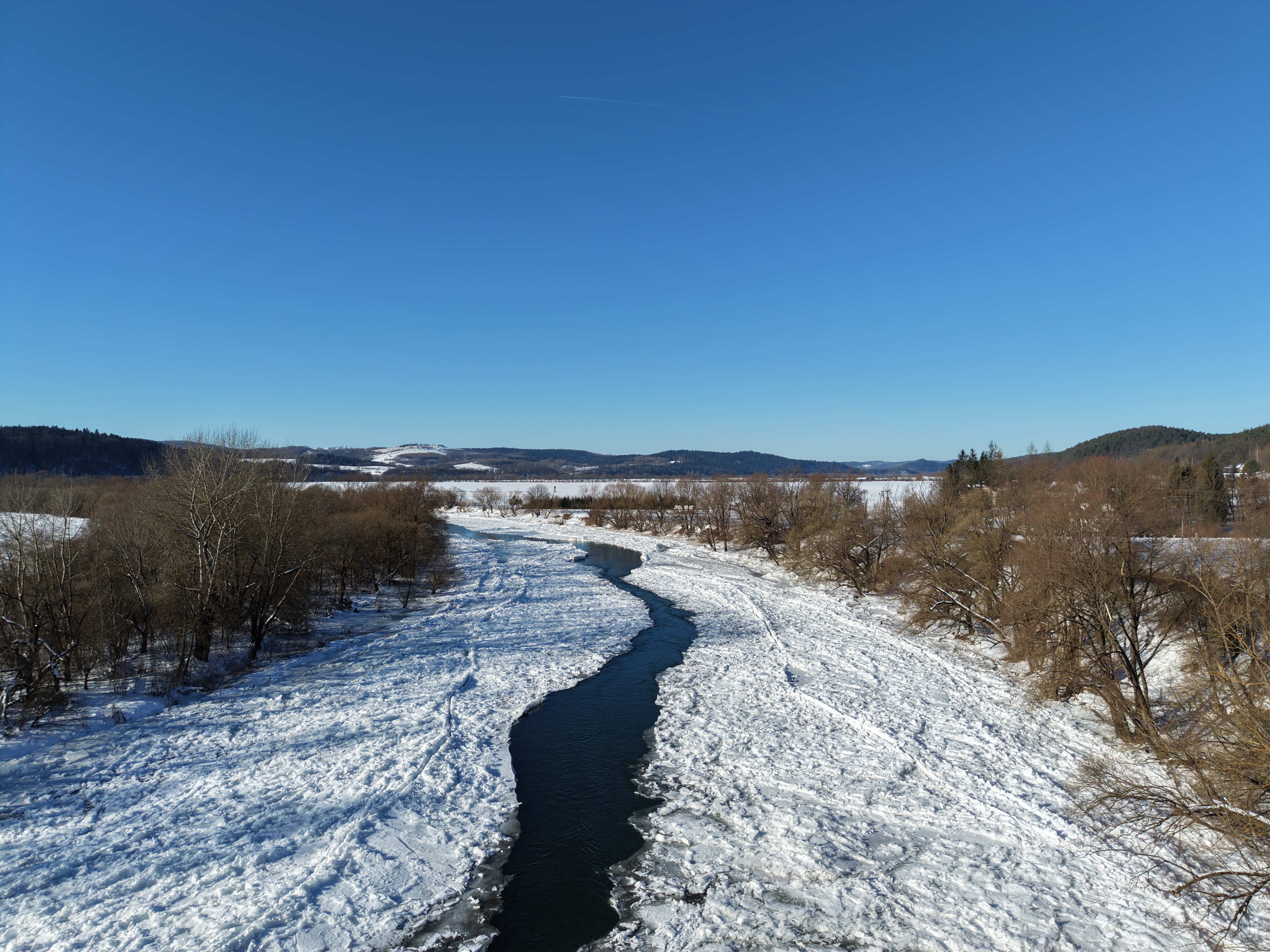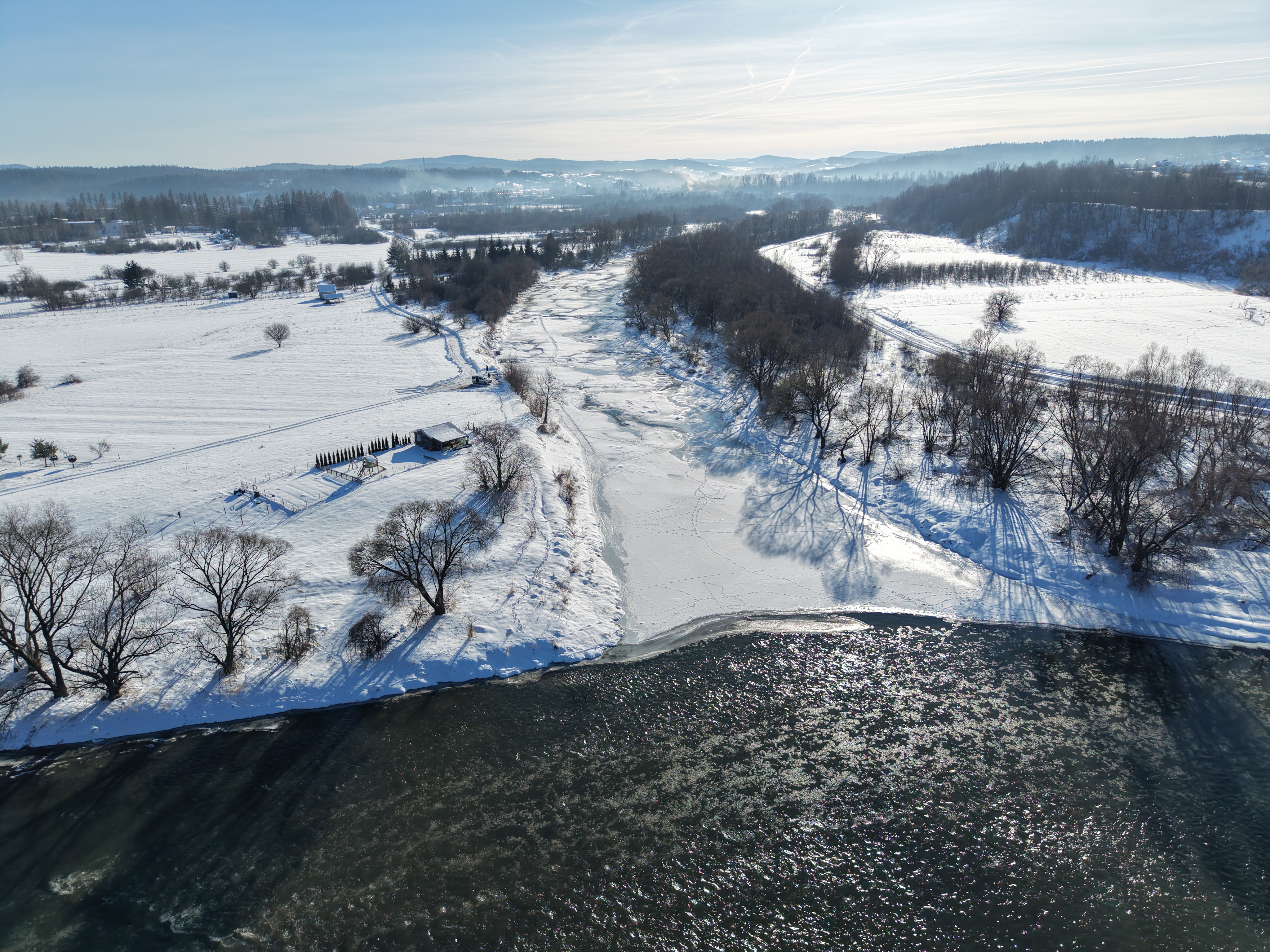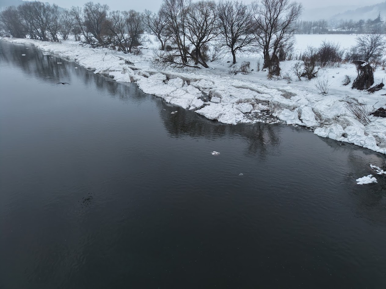 Spływający lód i śryż, osiadający na wypłyconych odcinkach rzeki wywołał lokalne, niegroźne podtopienia na terenach niezurbanizowanych.