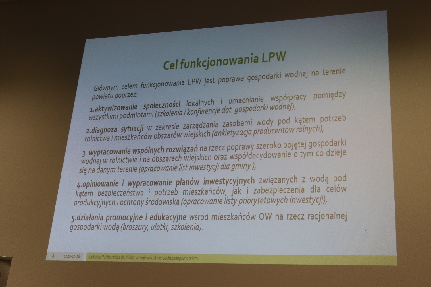 W spotkaniu założycielskim LPW w Gryficach w dniu 28 października br. wzięła udział Dyrekcja Zarządu Zlewni PGW Wody Polskie w Gryficach oraz Kierownik Nadzoru Wodnego. Spotkanie zorganizowane zostało przez ZODR w Barzkowicach i zgromadziło licznych rolników, przedstawicieli władz samorządowych, spółek wodnych, Lasów Państwowych oraz inne osoby związane z gospodarką wodną.