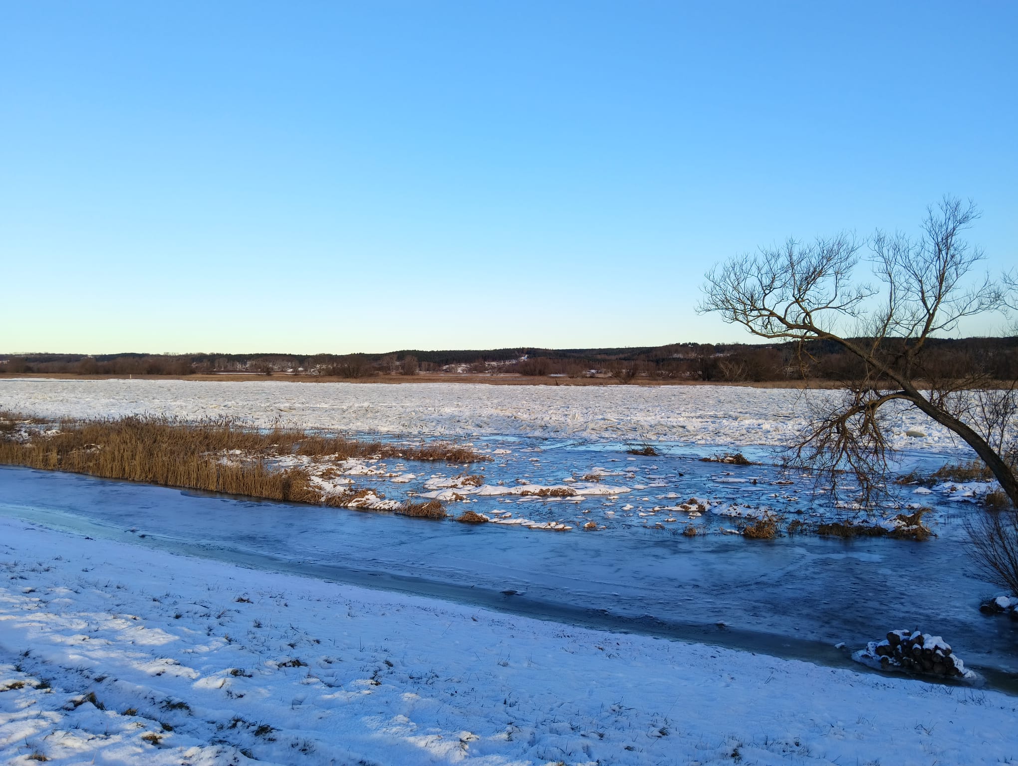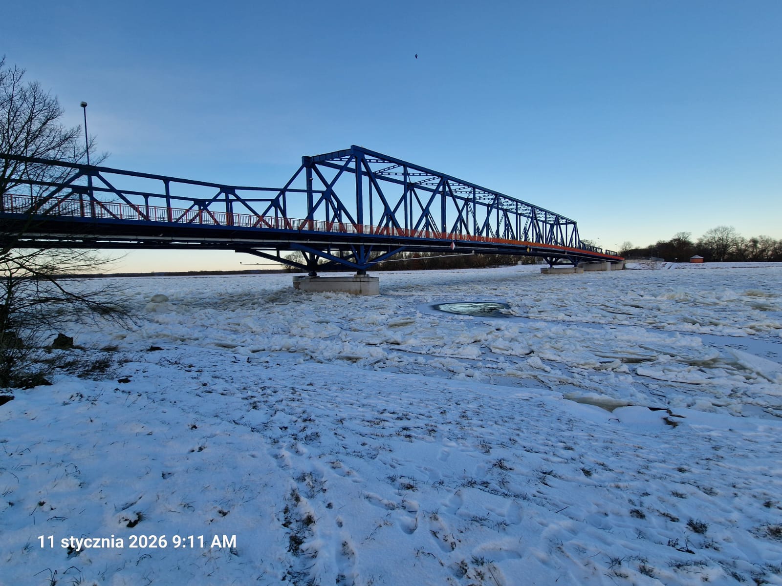 - W Gozdowicach przy ujściu Warty na odcinku do miejscowości Bielinek (pomiary wodowskazów na wysokości km 645 i km 672), obok zagęszczonego śryżu lodowego w postaci luźno skupionych ze sobą krążków lodu, notujemy przyrost stałej pokrywy lodowej na rzece.