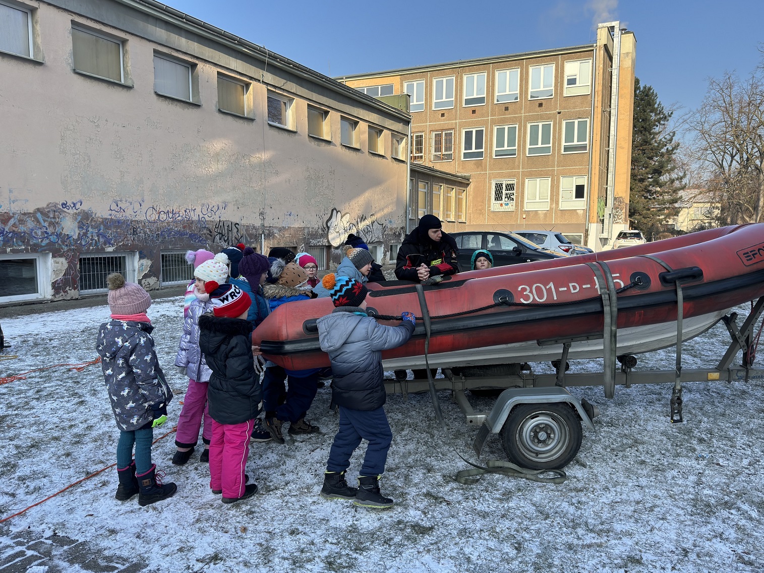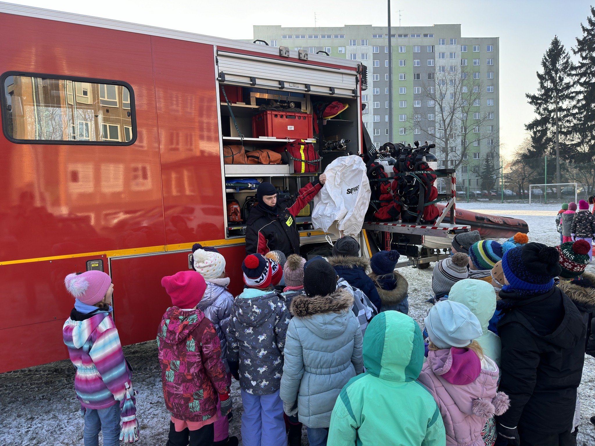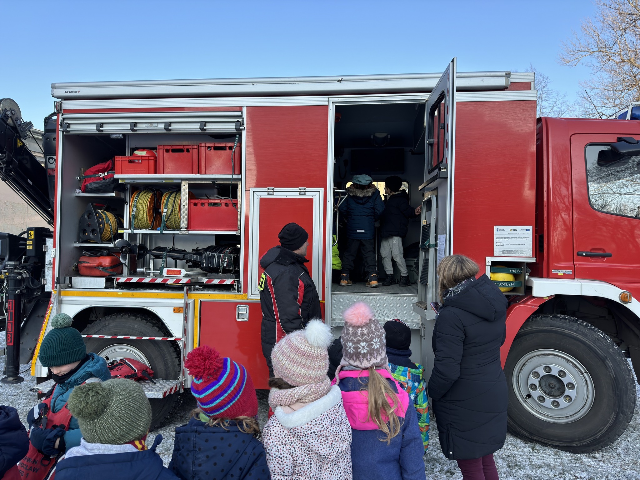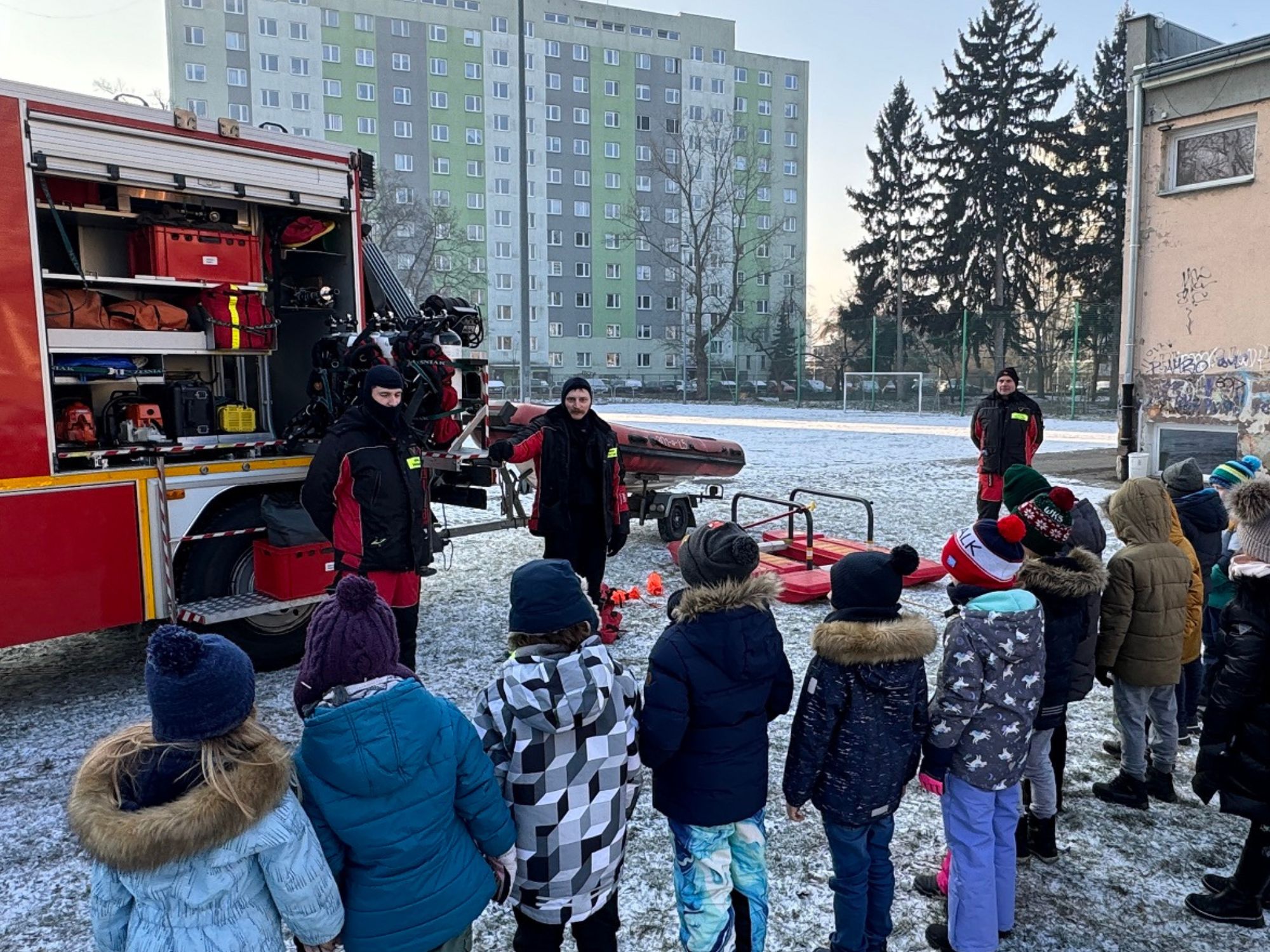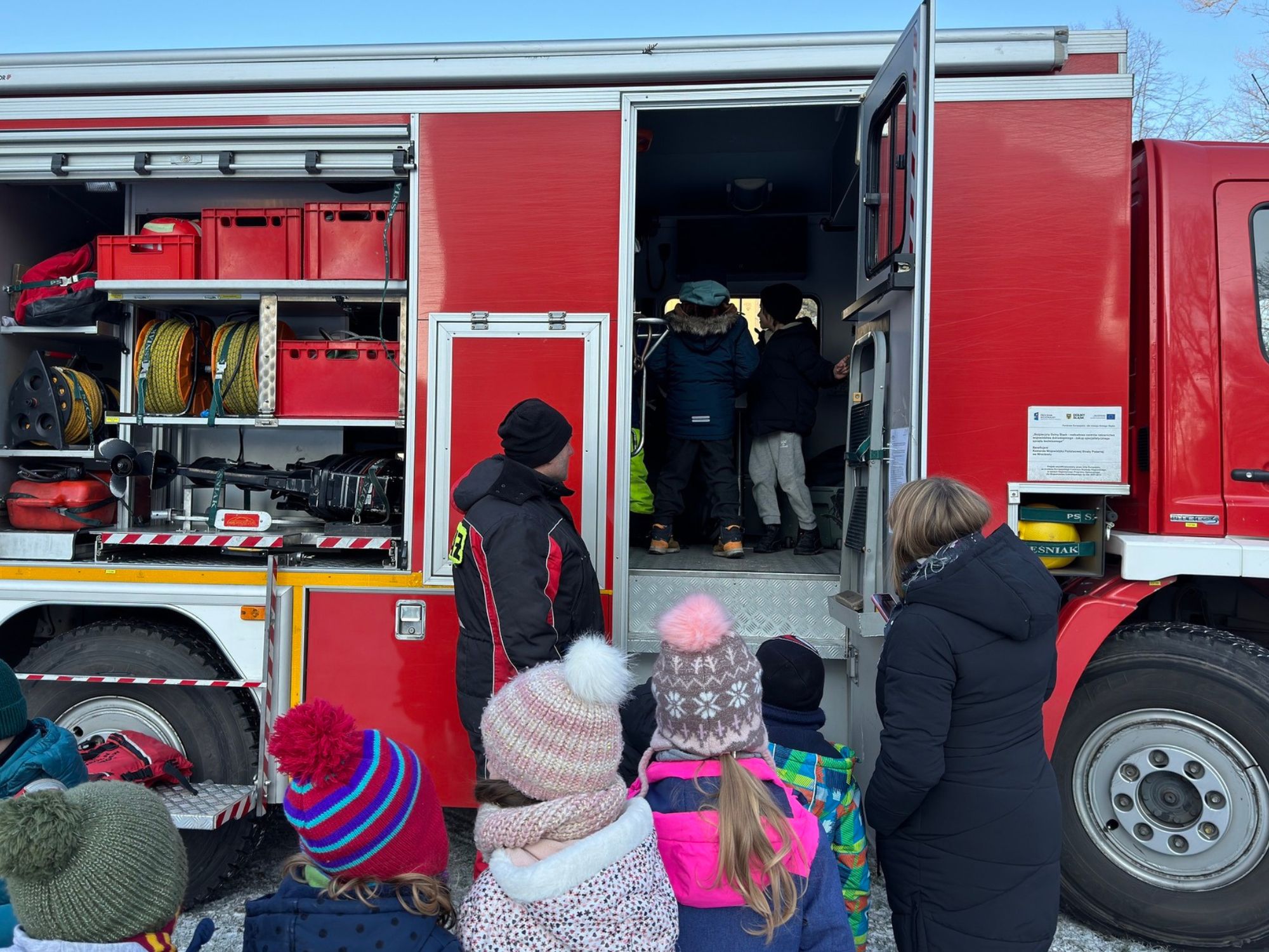 Strażacy wytłumaczyli uczniom, na czym polega ich praca, szczególnie zimową porą. Niejednokrotnie podejmują oni akcje ratowania osób uwięzionych pod powierzchnią lodu lub w zatopionych pojazdach czy łodziach. Aktywni obcowali ze specjalistycznym sprzętem Grupy Ratownictwa Wodno-Nurkowego. Wóz ratownictwa wodnego zawiera wiele przyrządów, służących do ratowania naszego życia i zdrowia, m.in. kompresor powietrza, agregaty prądotwórcze, sprzęt medyczny, sprzęt ratowniczy, sprzęt burzący, zestawy nurkowe czy ponton ratowniczy. Dzieci poczuły się jak prawdziwy strażak na służbie przywdziewając kamizelkę taktyczną, zasiadając za kierownicą auta i rzucając rzutką ratowniczą.