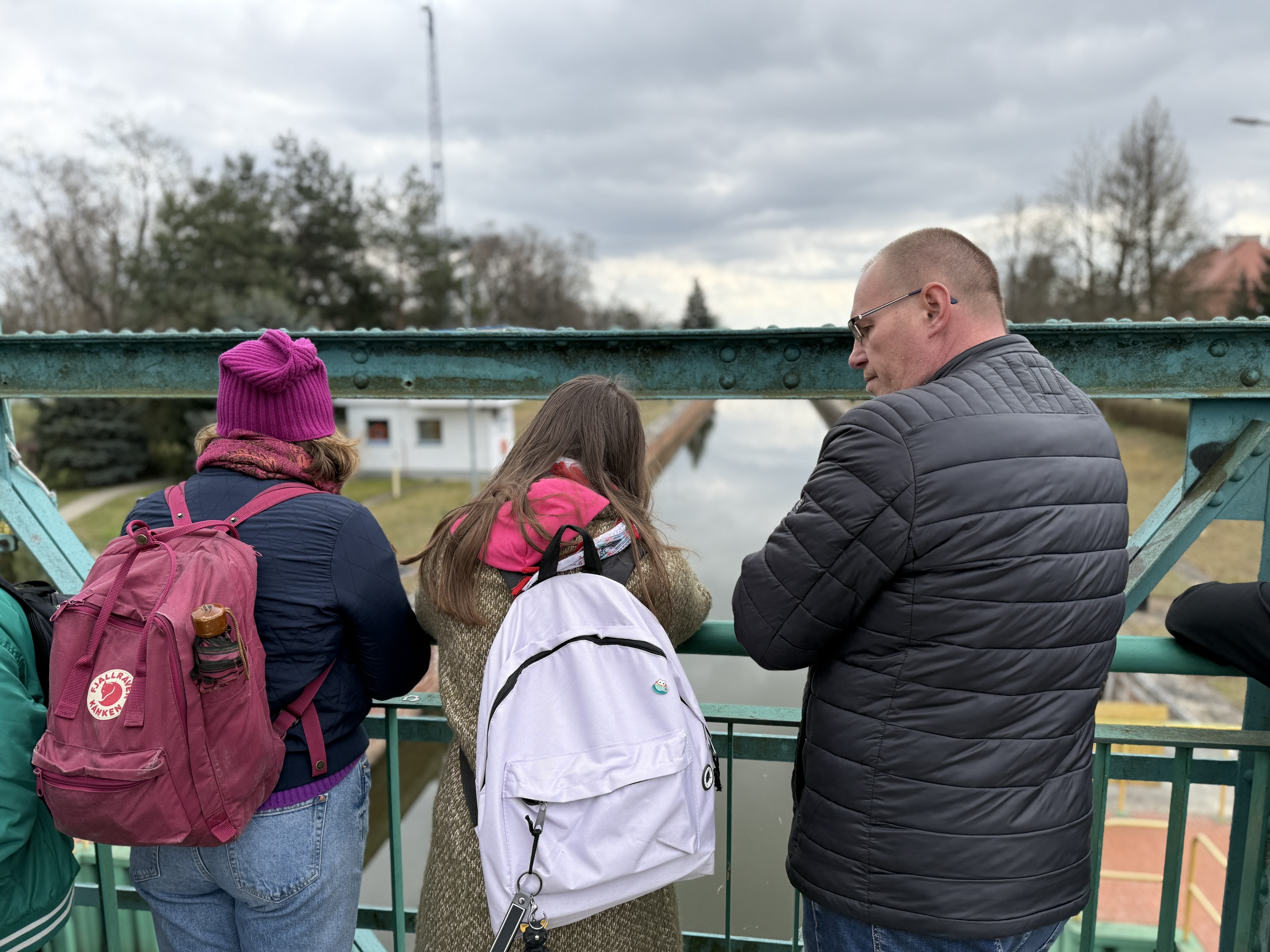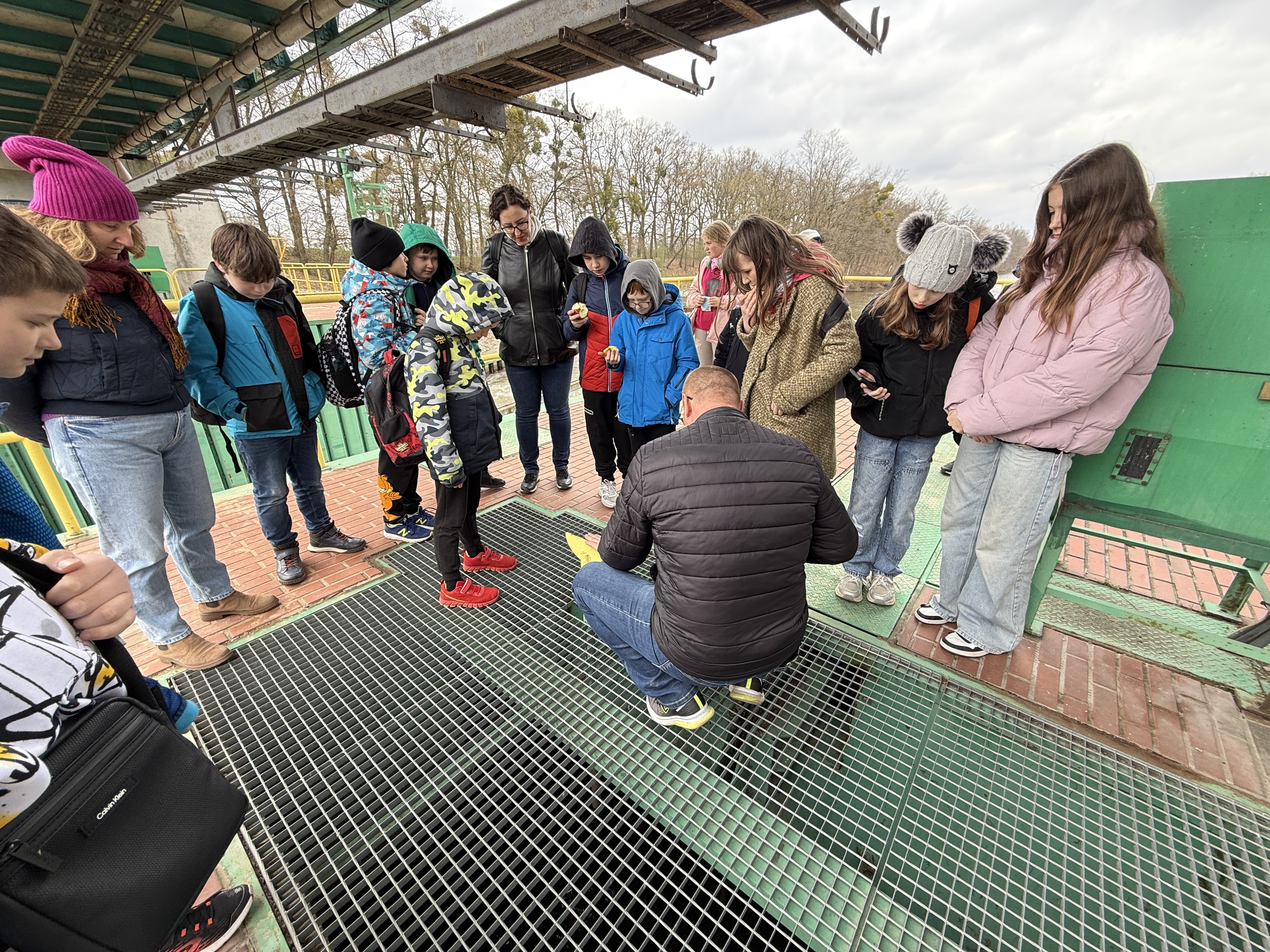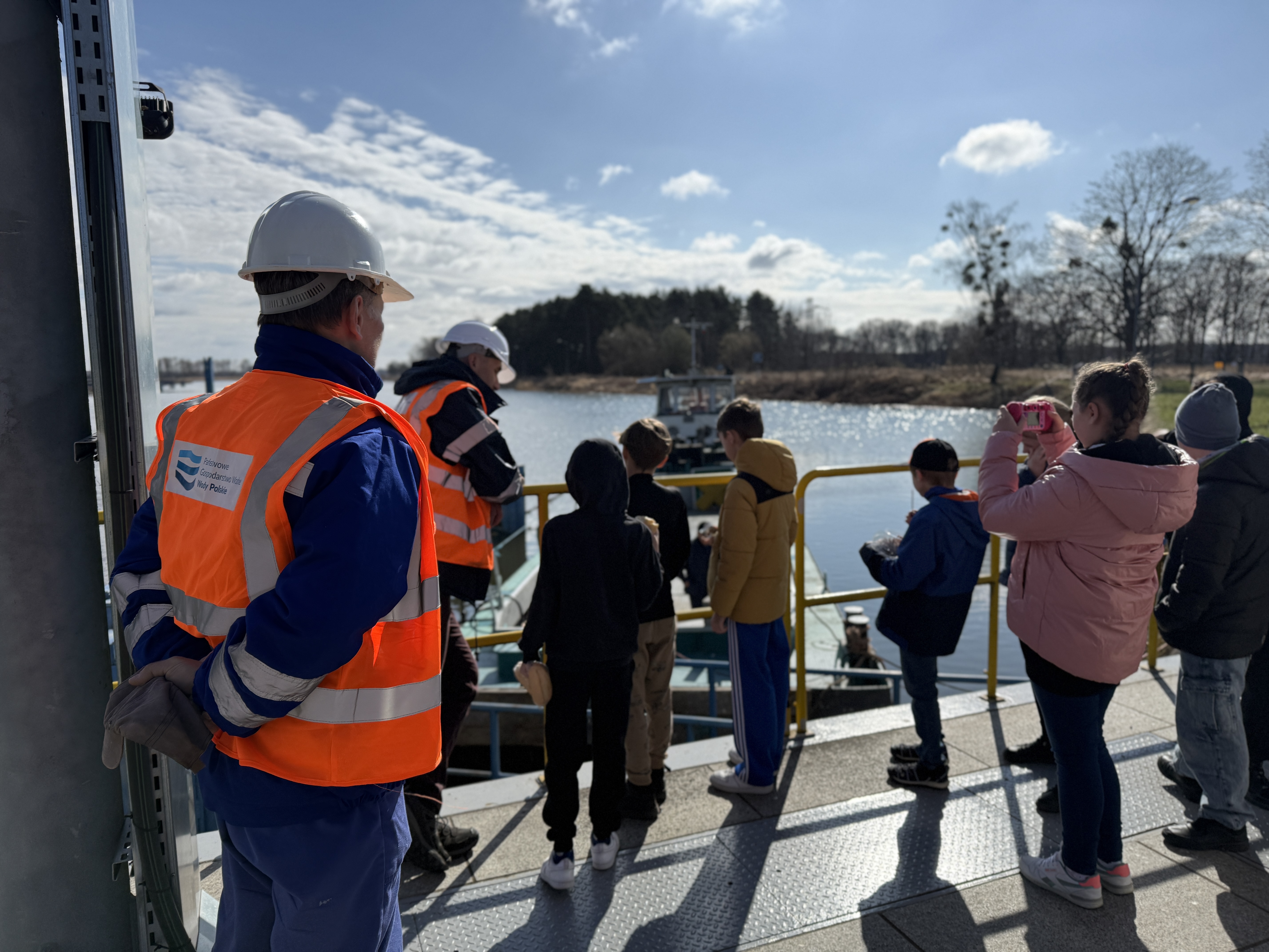 Wycieczkę rozpoczęliśmy od wejścia na jaz, który jest obiektem pięcioprzęsłowym, wyposażonym w zamknięcia zasuwowe. Dzieci obserwowały, w jaki sposób konstrukcja piętrzy i reguluje przepływ wody poprzez mechanizm umożliwiający podnoszenie lub opuszczanie zasuw.