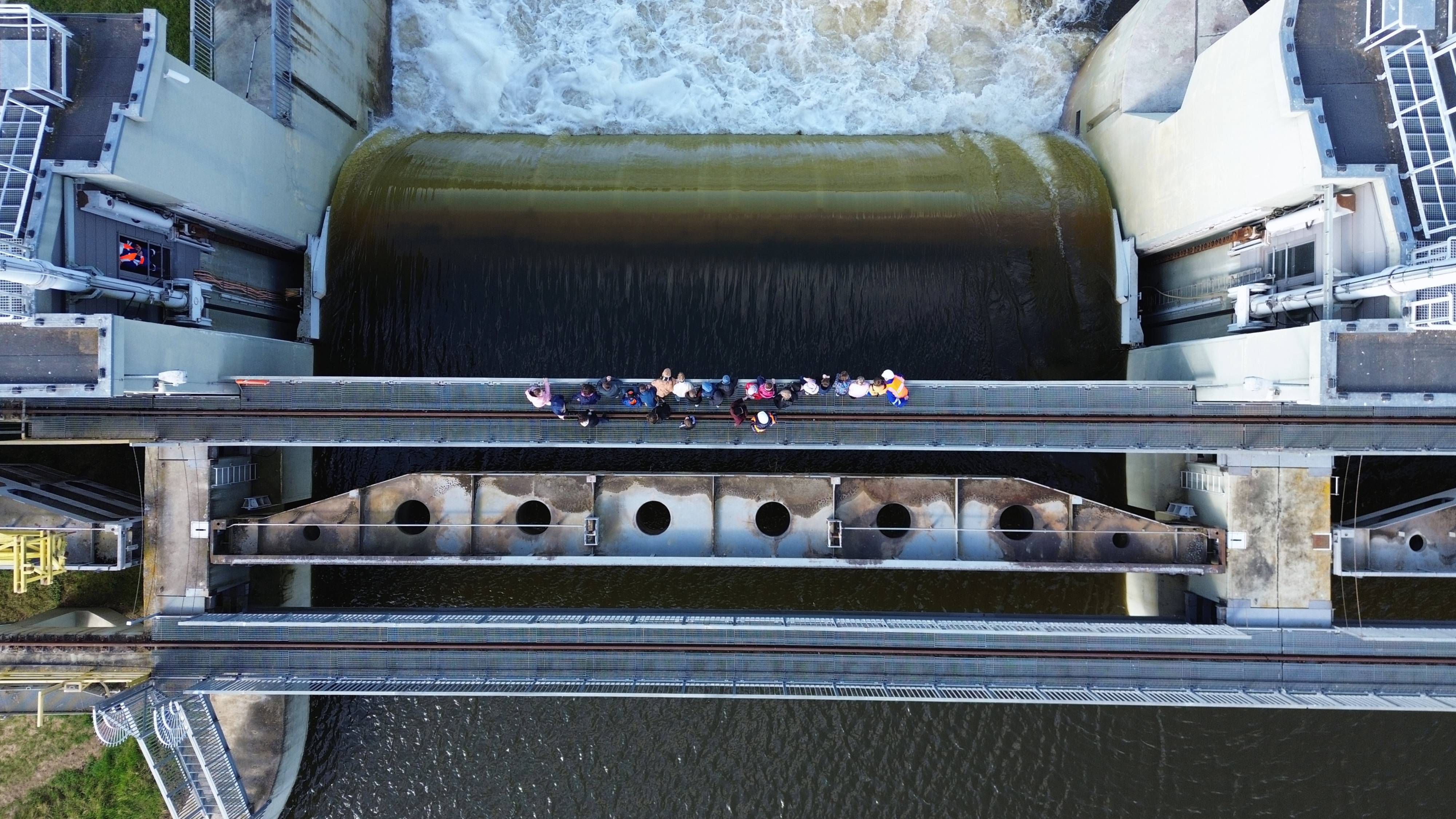 Później Aktywni przeszli do odnowionej śluzy żeglugowej, gdzie przeprowadzono pokazowe śluzowanie. Krok po kroku uczestnicy mogli śledzić, jak poziom wody zaczął się zmieniać – najpierw rozpoczęło się opróżnianie śluzy, które odbywa się za pomocą kanałów obiegowych, a następnie jej ponowne napełnianie. To właśnie w ten sposób jednostki mogą przepływać pomiędzy odcinkami rzeki o różnym poziomie wody.