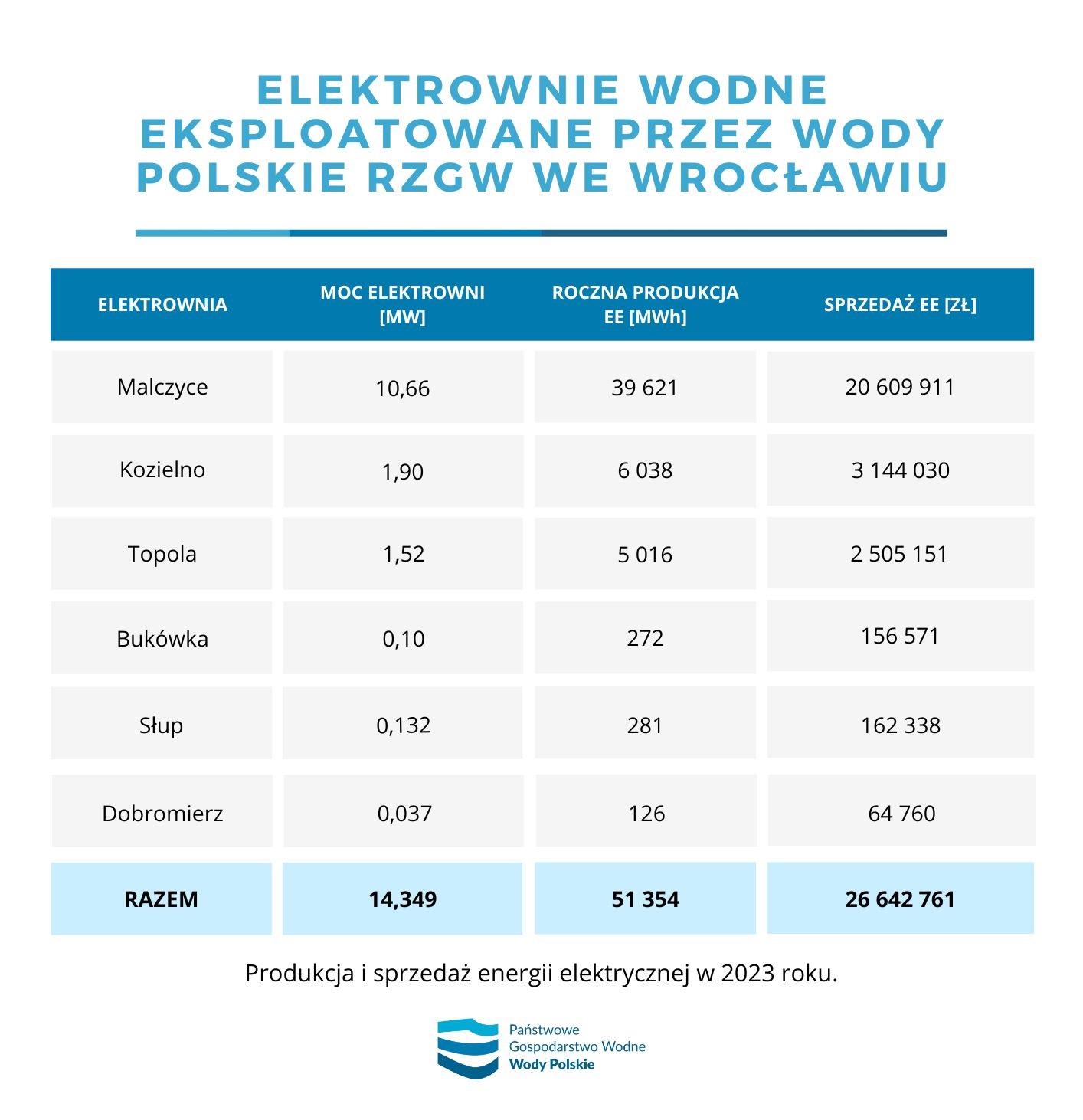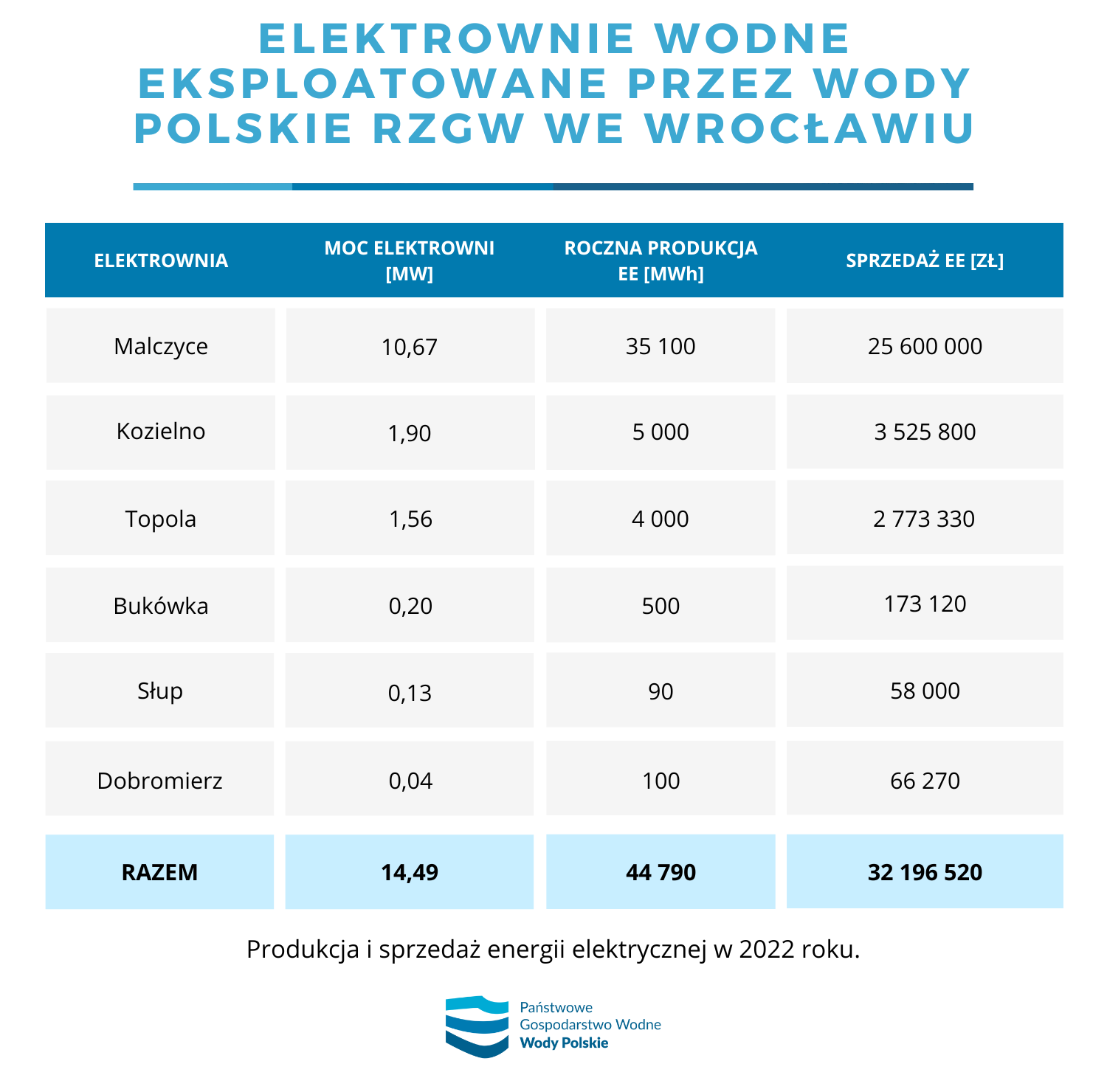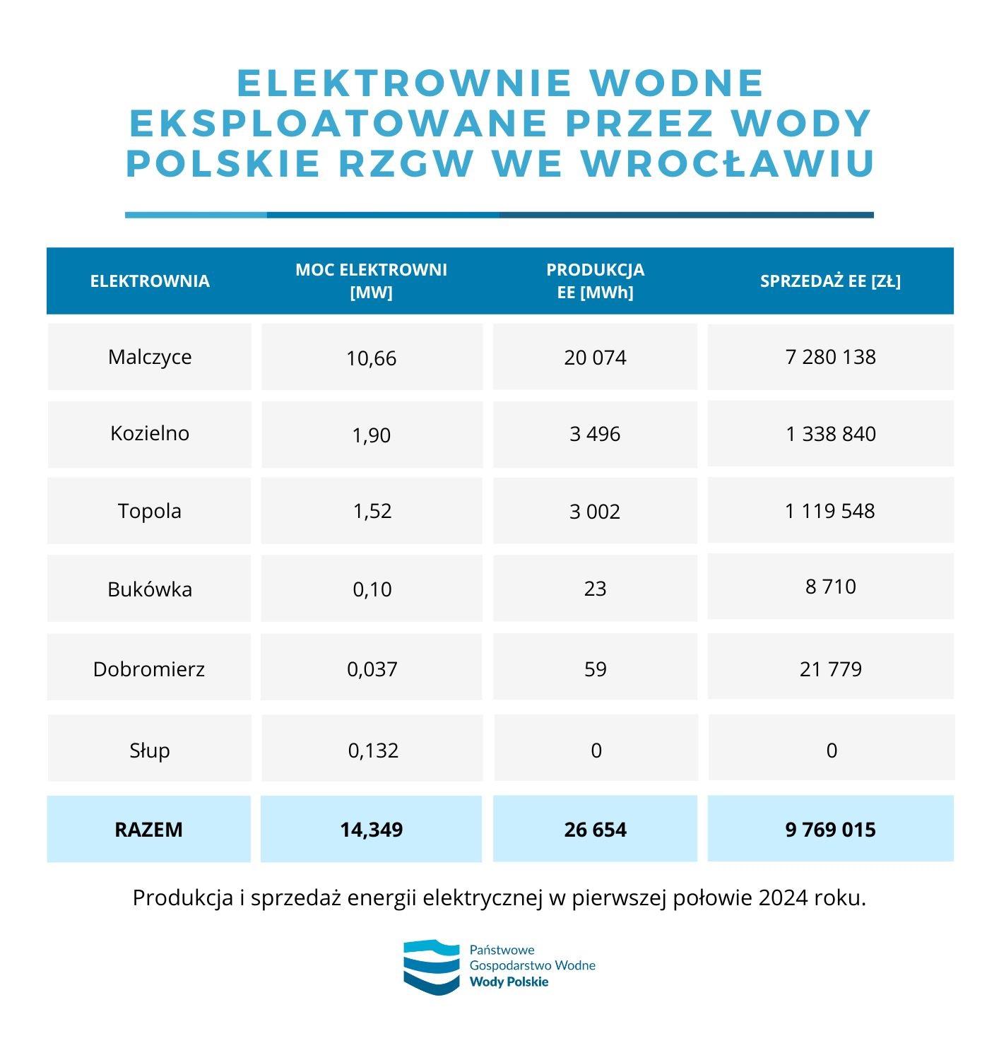 Oddany do eksploatacji w 2021 roku obiekt wchodzący w skład stopnia wodnego Malczyce o mocy 10,66 MW wyprodukował w pierwszej połowie 2024 roku 20 074 MWh. Wszystkie hydroelektrownie będące w eksploatacji RZGW we Wrocławiu wyprodukowały w okresie od stycznia do czerwca 26 654 MWh energii o łącznej wartości 9 769 015 zł.