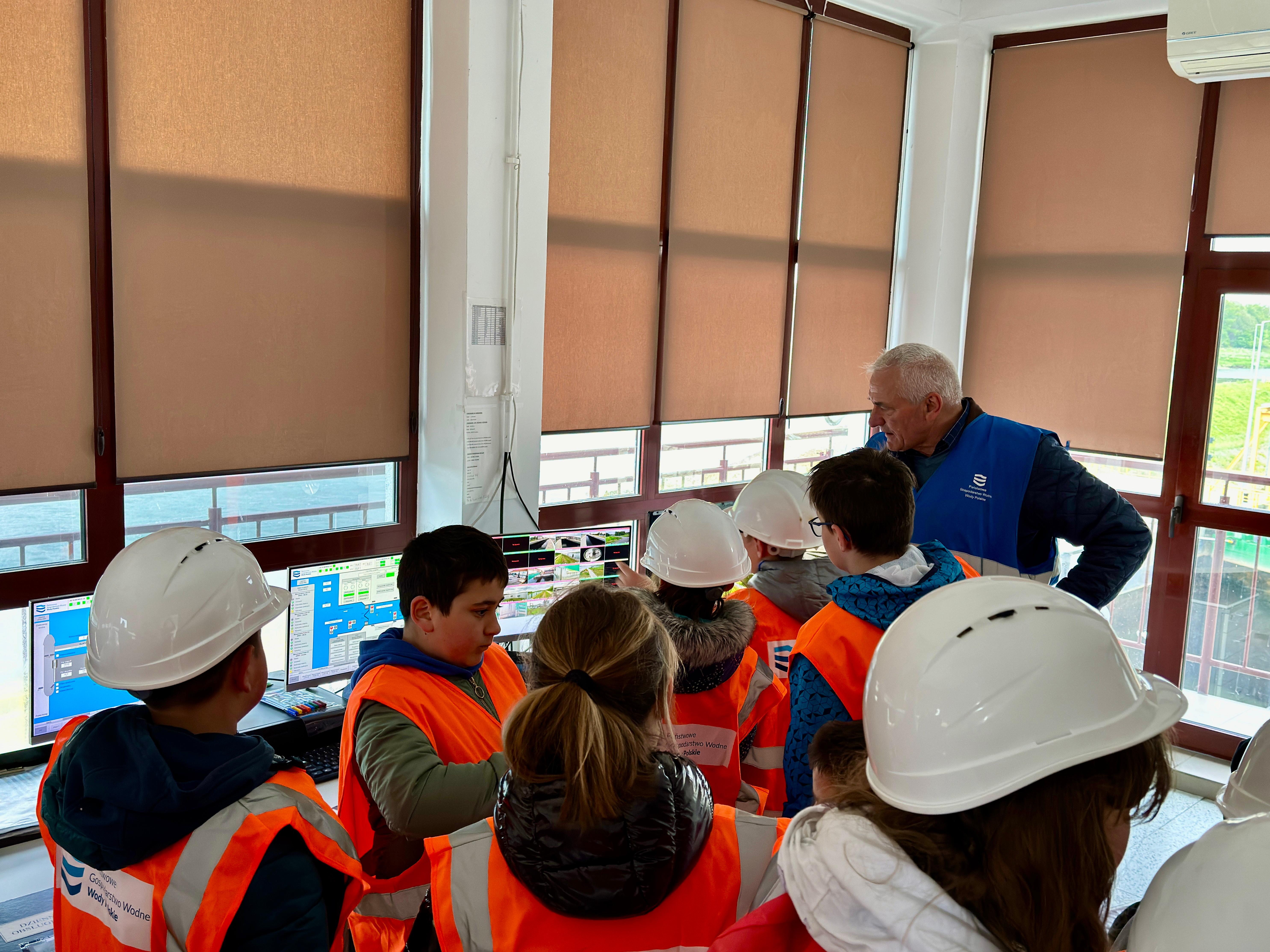 Na sam koniec przyszła pora na serce stopnia wodnego Malczyce, czyli sterownię. W tym miejscu przy pomocy panelu sterującego można kontrolować wszystkie urządzenia wchodzące w skład obiektu oraz monitoring. Młodzi hydrolodzy wykazali się dużym zaangażowaniem i zadawali celne pytania, za co w nagrodę otrzymali upominki od Wód Polskich.
