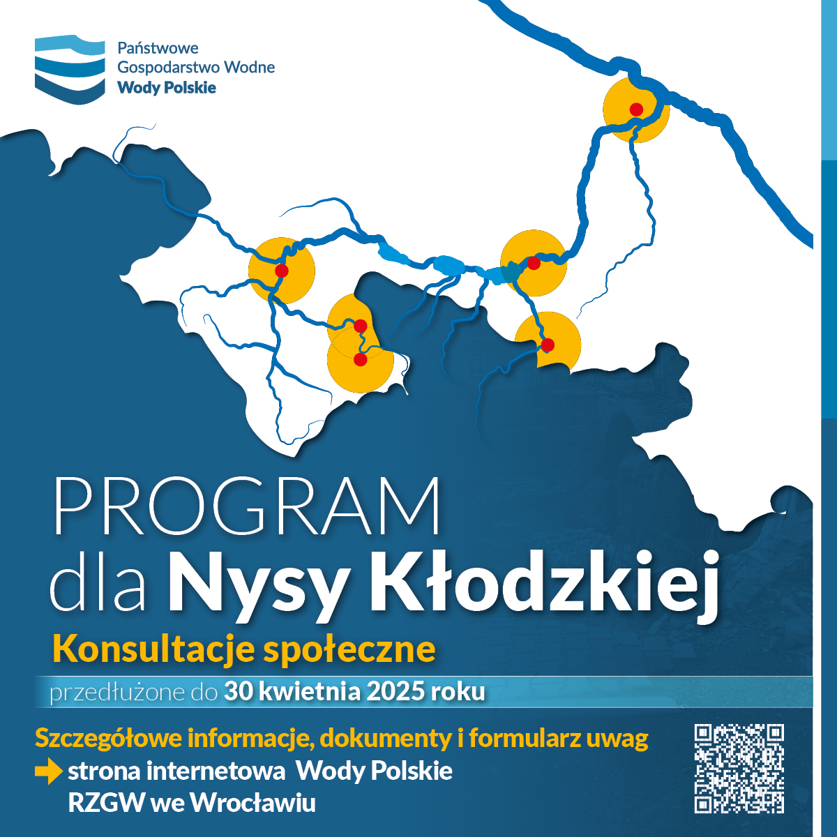 W odpowiedzi na duże zainteresowanie społeczne, informujemy, że konsultacje dotyczące Programu redukcji ryzyka powodziowego w zlewni Nysy Kłodzkiej, które rozpoczęły się 27 lutego we Wrocławiu, będą prowadzone do 30 kwietnia 2025 r.