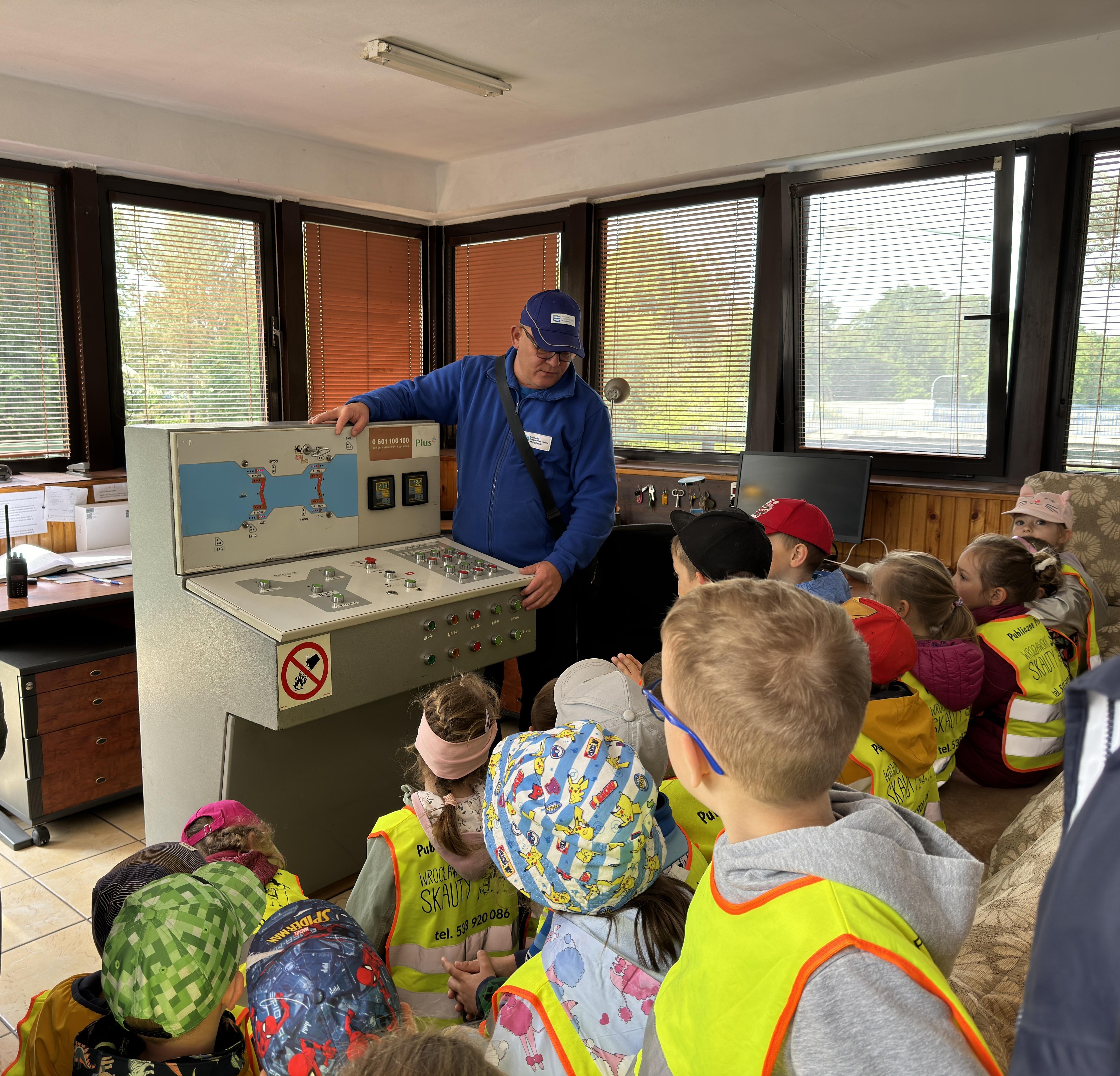 Następnie przeszliśmy do głównego punktu wycieczki. Śluza Zacisze umożliwia kontrolowane podnoszenie i opuszczanie poziomu wody, zapewniając żeglugę na Kanale Żeglugowym. Podczas naszej wizyty dzieci miały okazję nie tylko poznać budowę i mechanizmy działania śluzy, ale także odkryć, jak wiele zależy od odpowiedniego zarządzania zasobami wodnymi. Po przebyciu wrót śluzy, przyszła pora na zwiedzenie serca tego obiektu, czyli budynku sterowni. To tutaj za pomocą specjalnej konsoli zarządza się wszystkimi elementami śluzy. Przedszkolaki zadawały wiele trafnych i ciekawych pytań, przede wszystkim związanych z codziennymi obowiązkami operatora śluzy.