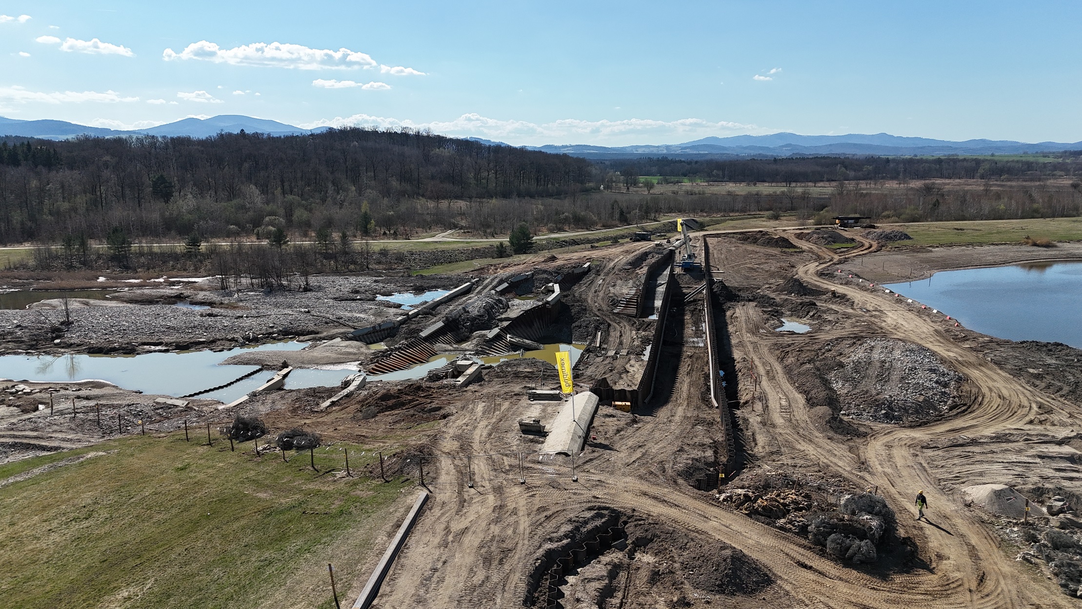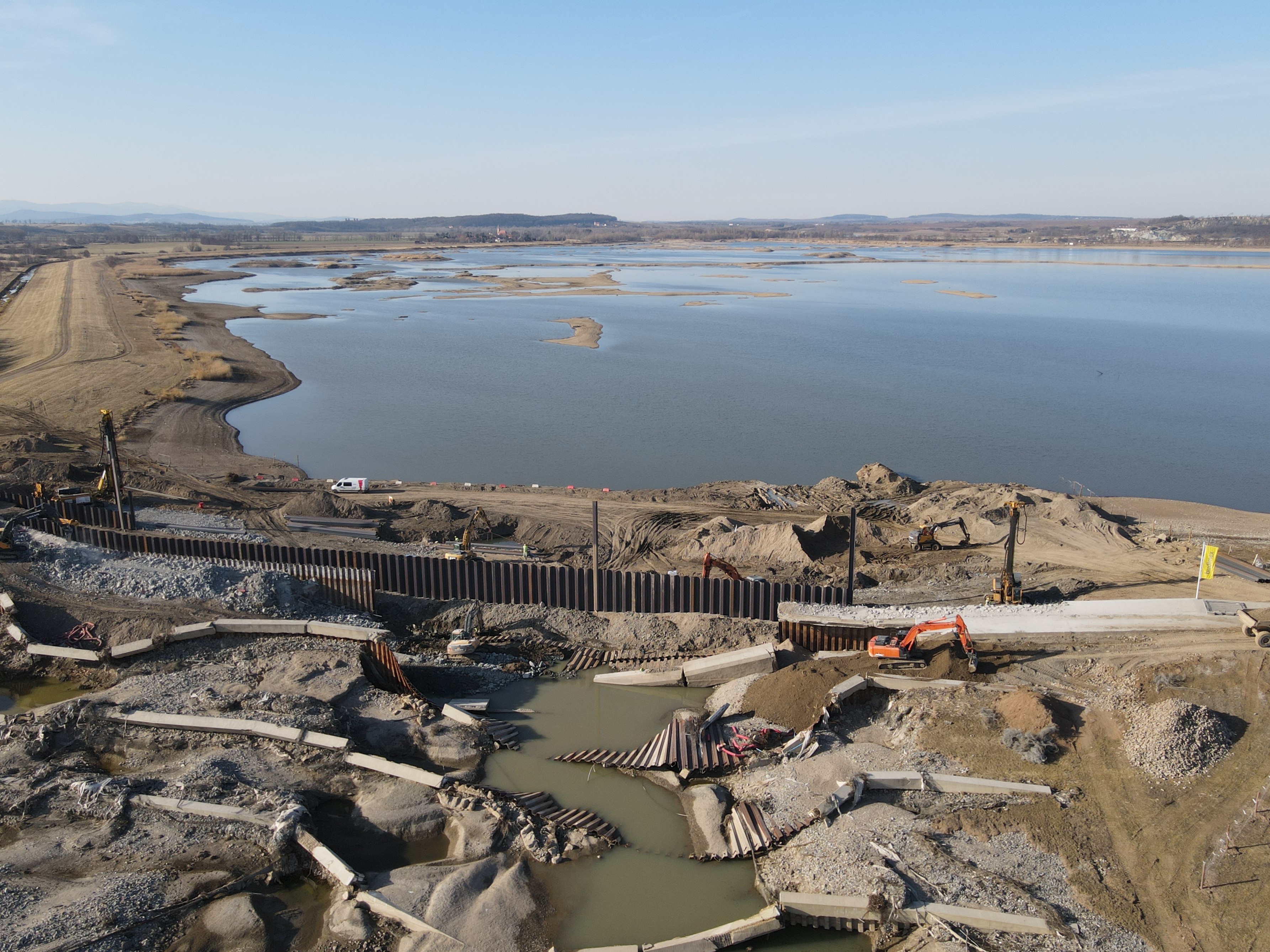 W ubiegłym tygodniu kontynuowana była rozbudowa platformy technologicznej oraz nasypu pod platformę roboczą w śladzie planowanej kaszycy. Montowane są specjalne stalowe elementy wzmacniające konstrukcję zapory. Trwa scalanie ich za pomocą ściągów, które dodatkowo zwiększą stabilność. Od strony zbiornika wykonywany jest nasyp. Na miejscu cały czas pracuje sprzęt wraz z obsługą – koparki, palownice, dźwigi, wozidła i walec oraz podnośnik koszowy.