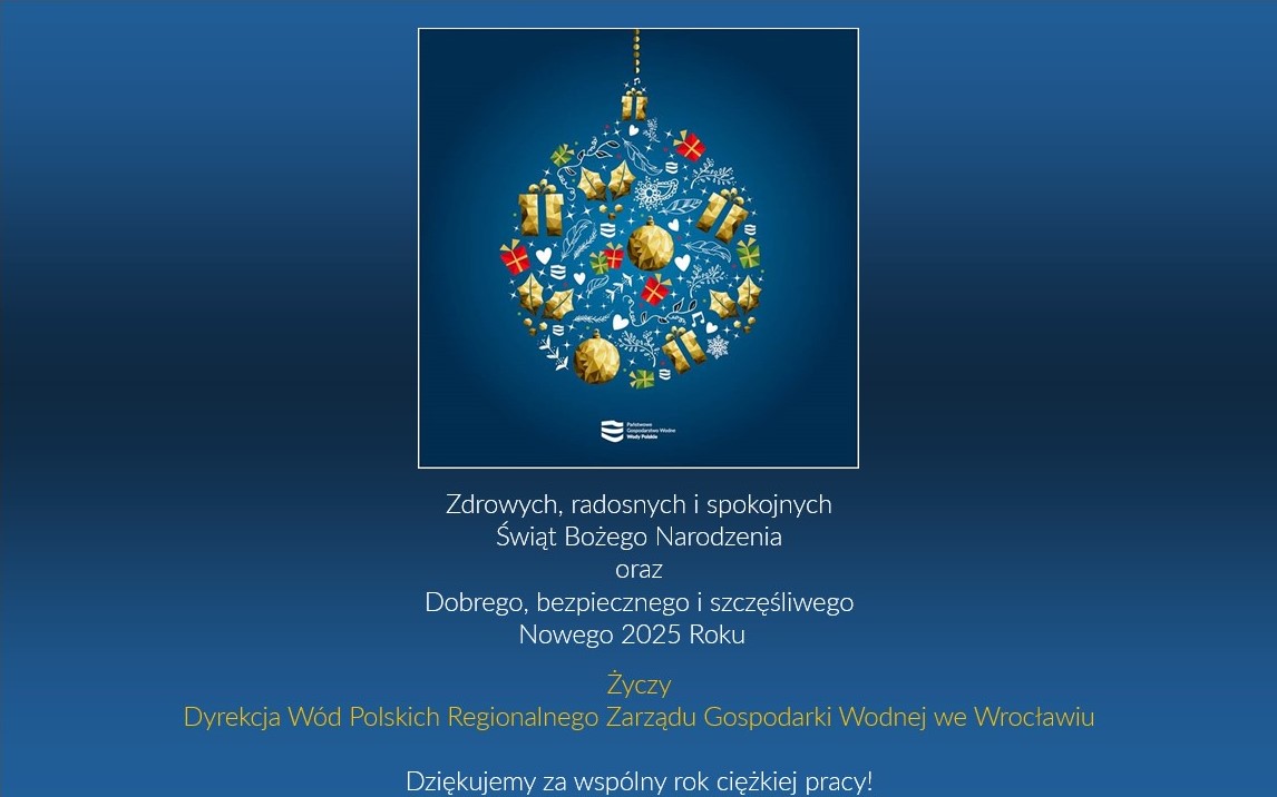Zdrowych, radosnych i spokojnych Świąt Bożego Narodzenia oraz dobrego, bezpiecznego i szczęśliwego Nowego 2025 Roku życzy Dyrekcja Wód Polskich Regionalnego Zarządu Gospodarki Wodnej we Wrocławiu. Dziękujemy za wspólny rok ciężkiej pracy!