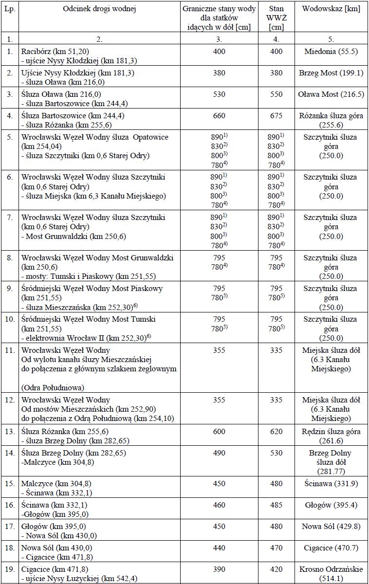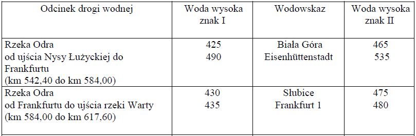 Ponadto na wymienionych drogach wodnych obowiązują przepisy prawa miejscowego w postaci Zarządzenia nr 1/2021 Dyrektora Urzędu Żeglugi Śródlądowej we Wrocławiu z dnia 25 maja 2021 r. w sprawie szczegółowych warunków bezpieczeństwa ruchu i postoju statków. Załączniki do przedmiotowego Zarządzenia określają m.in. graniczne wartości wodowskazowe WWŻ dla poszczególnych odcinków Odrzańskiej Drogi Wodnej: