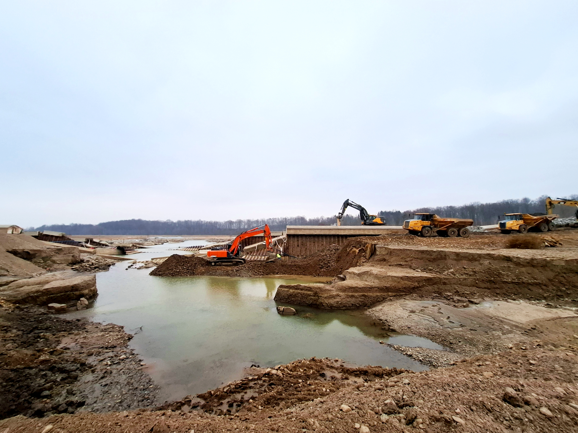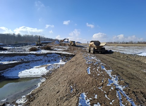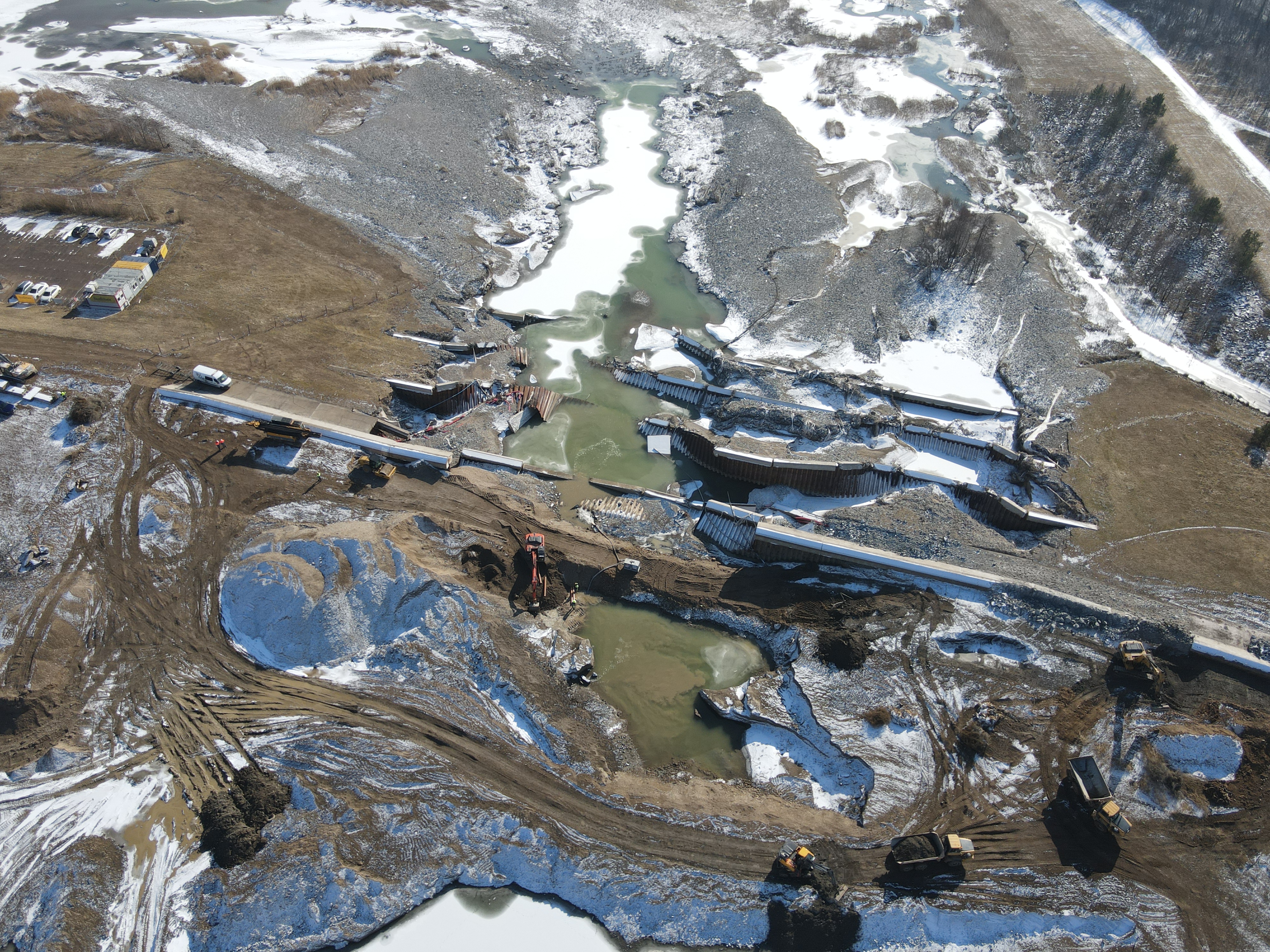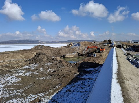 W ostatnim czasie na placu budowy prowadzono między innymi prace oraz roboty związane z uporządkowaniem terenu, utworzeniem dróg dojazdowych, wykonaniem nasypu pod platformę roboczą, wykonaniem tymczasowej grodzy technologicznej i platformy technologicznej, a także rozbiórką gabionów od strony elektrowni wodnej. W bieżącym tygodniu wykonawca rozpocznie pogrążanie grodzic ścianki szczelnej.