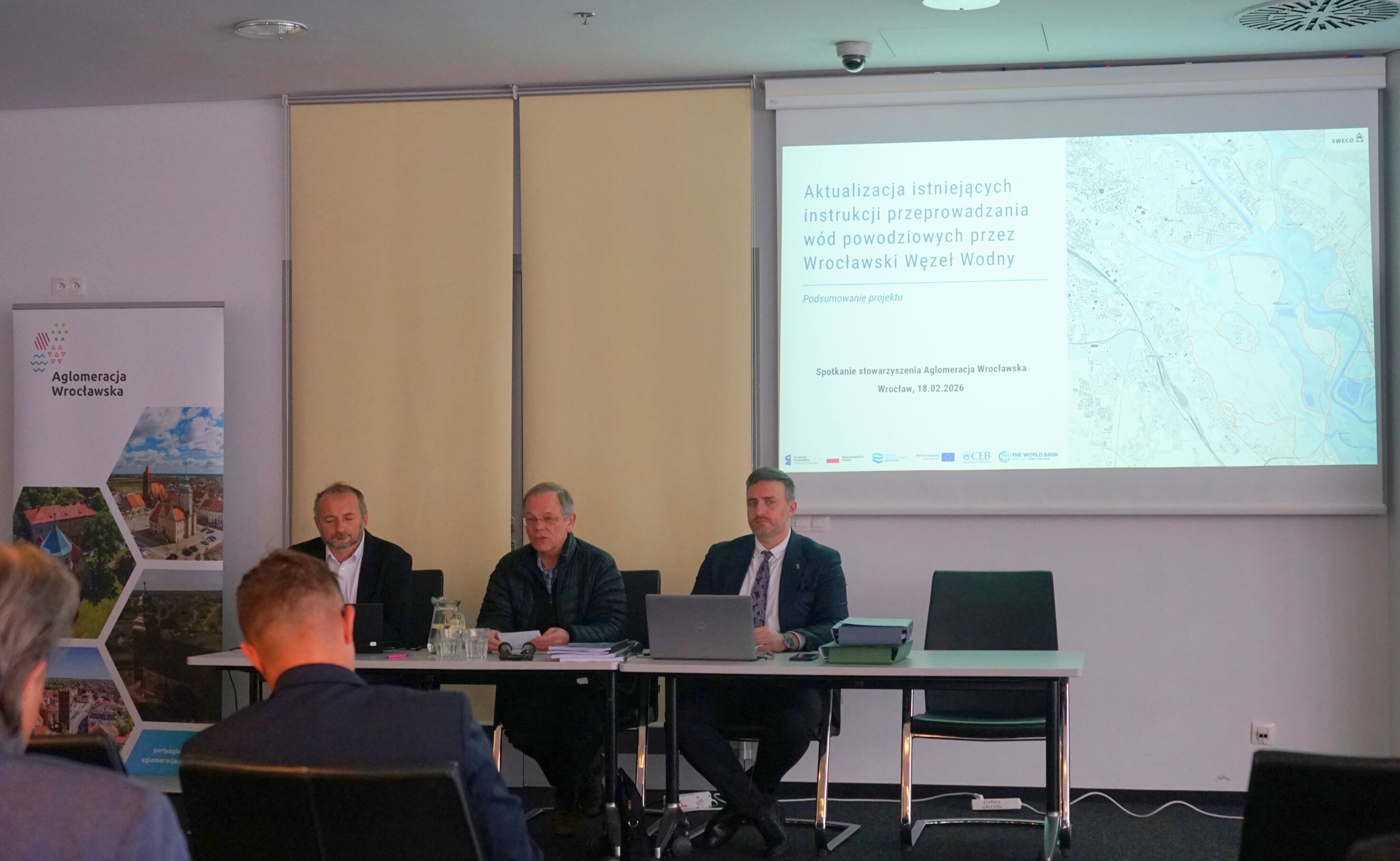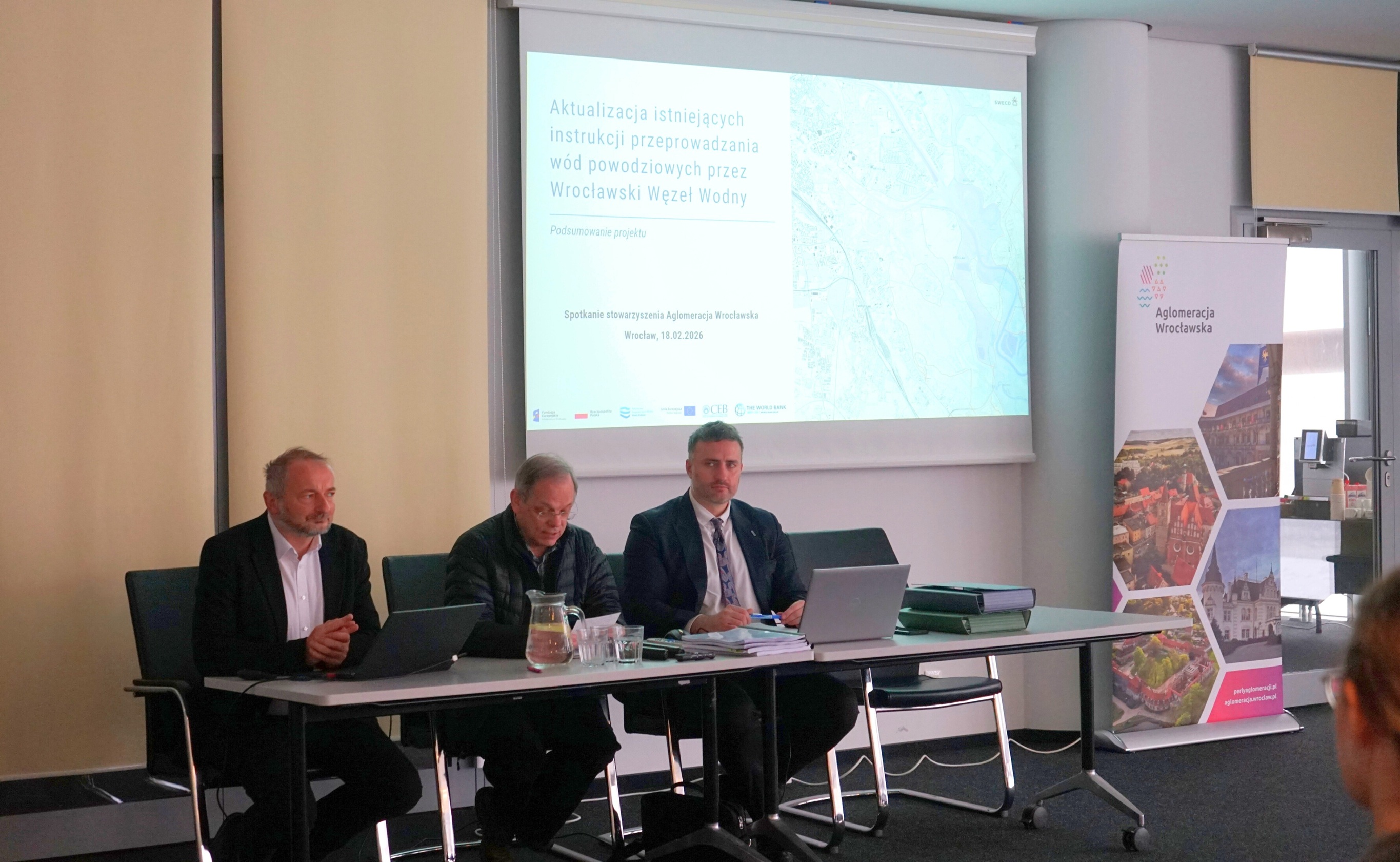 Przedstawiciele Regionalnego Zarządu Gospodarki Wodnej we Wrocławiu uczestniczyli w spotkaniu z reprezentantami stowarzyszenia Aglomeracja Wrocławska. Zgromadzenie odbyło się 18 lutego 2026 r. na Stadionie Tarczyński Arena we Wrocławiu. Podczas spotkania zaprezentowano wyniki ekspertyzy pn. „Aktualizacja istniejących instrukcji przeprowadzania wód powodziowych przez Wrocławski Węzeł Wodny”.