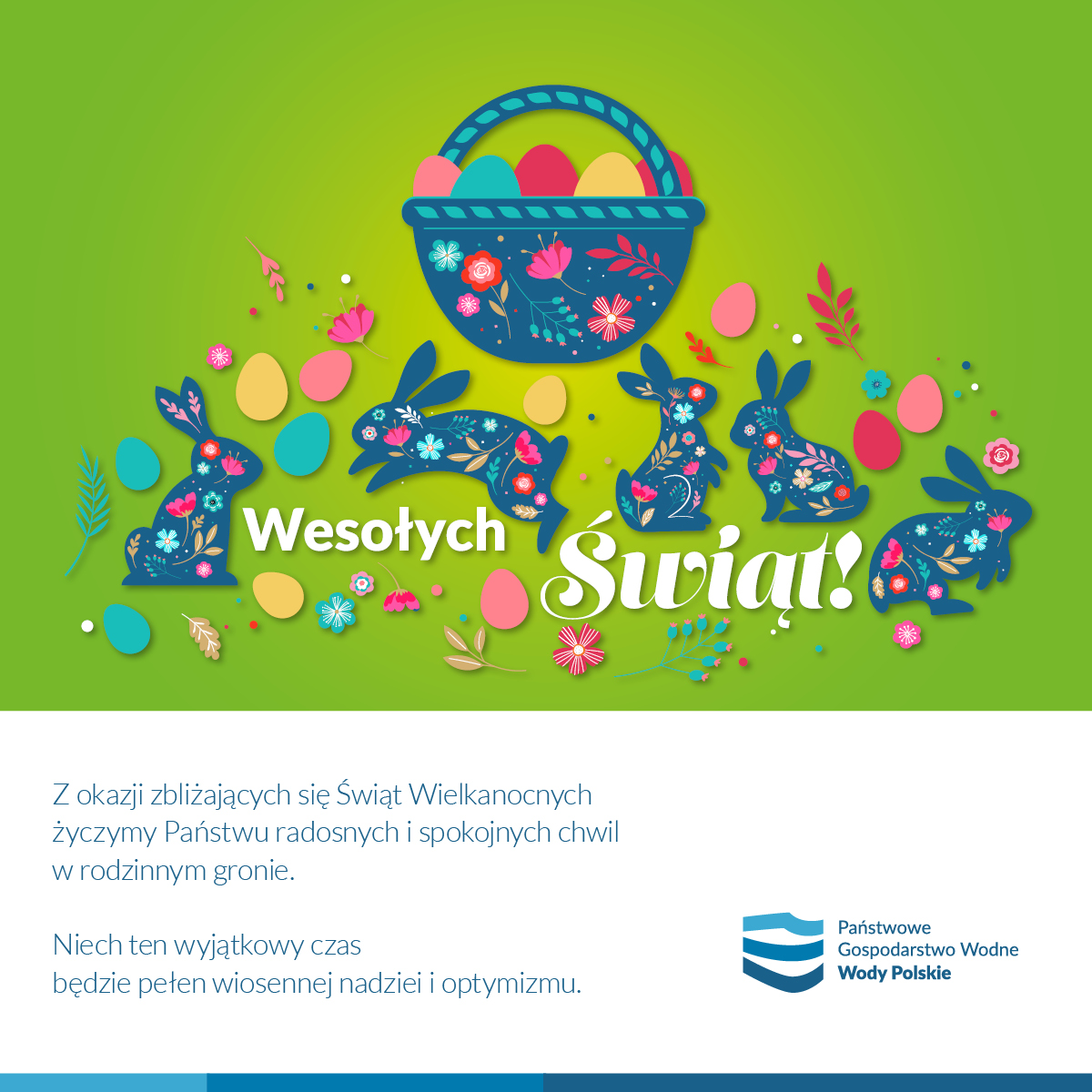 Niech nadchodzące święta Wielkiej Nocy napełnią wszystkich nas wiarą, nadzieją i miłością, a najbliższe dni będą okazją do spędzenia samych radosnych chwil w gronie najbliższej rodziny. Zdrowych, spokojnych i pięknych świąt oraz niezmiennej dbałości o dobro gospodarki wodnej w całym regionie – wszystkim klientom, partnerom i współpracownikom życzą Dyrekcja oraz Pracownicy RZGW we Wrocławiu.