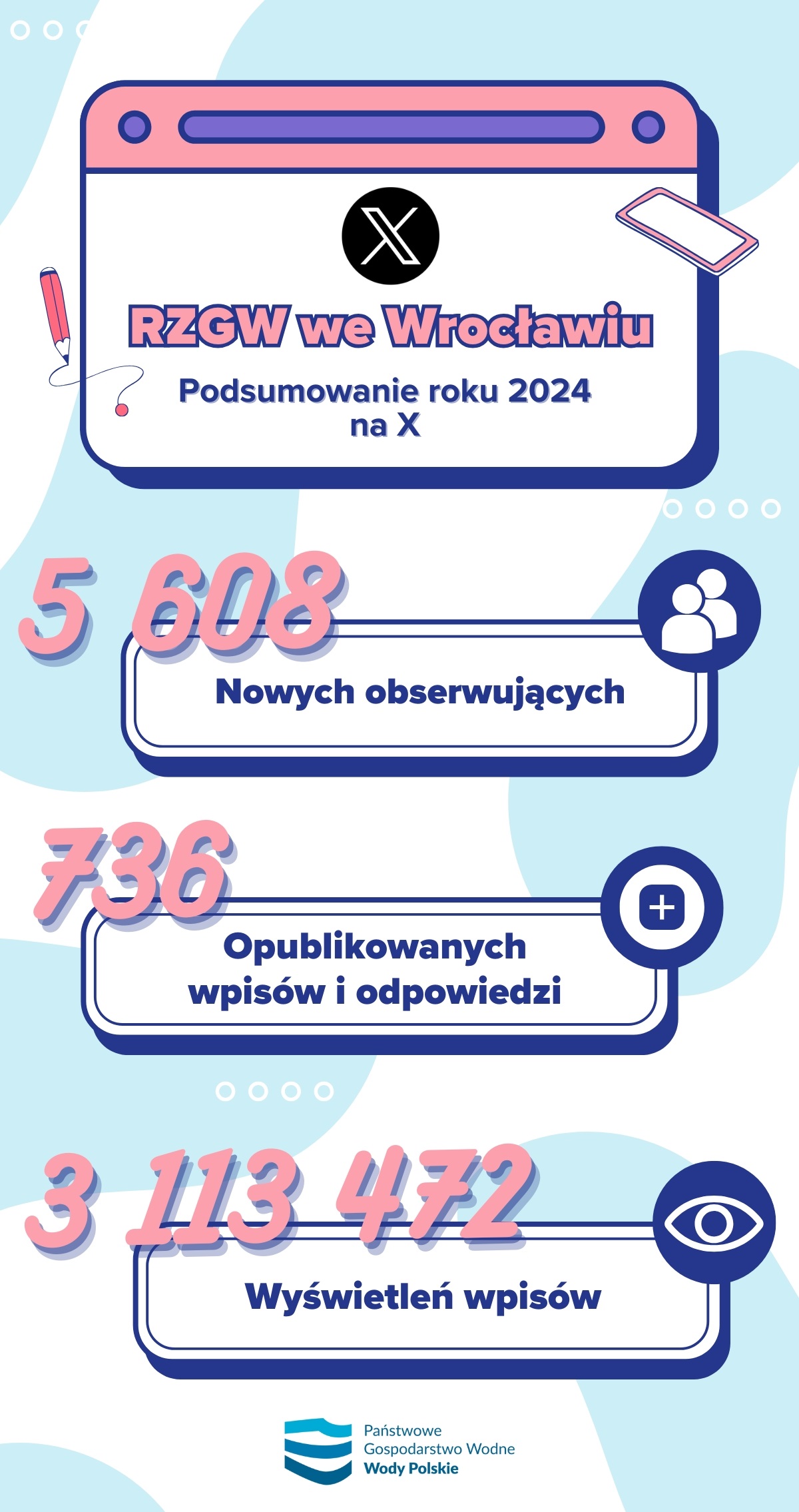 W 2024 roku na profilu wrocławskich Wód Polskich ukazało się 736 wpisów i odpowiedzi, które wyświetlono łącznie ponad 3,1 mln razy. Konto zyskało 5 608 nowych obserwujących na przestrzeni ostatnich 12 miesięcy.