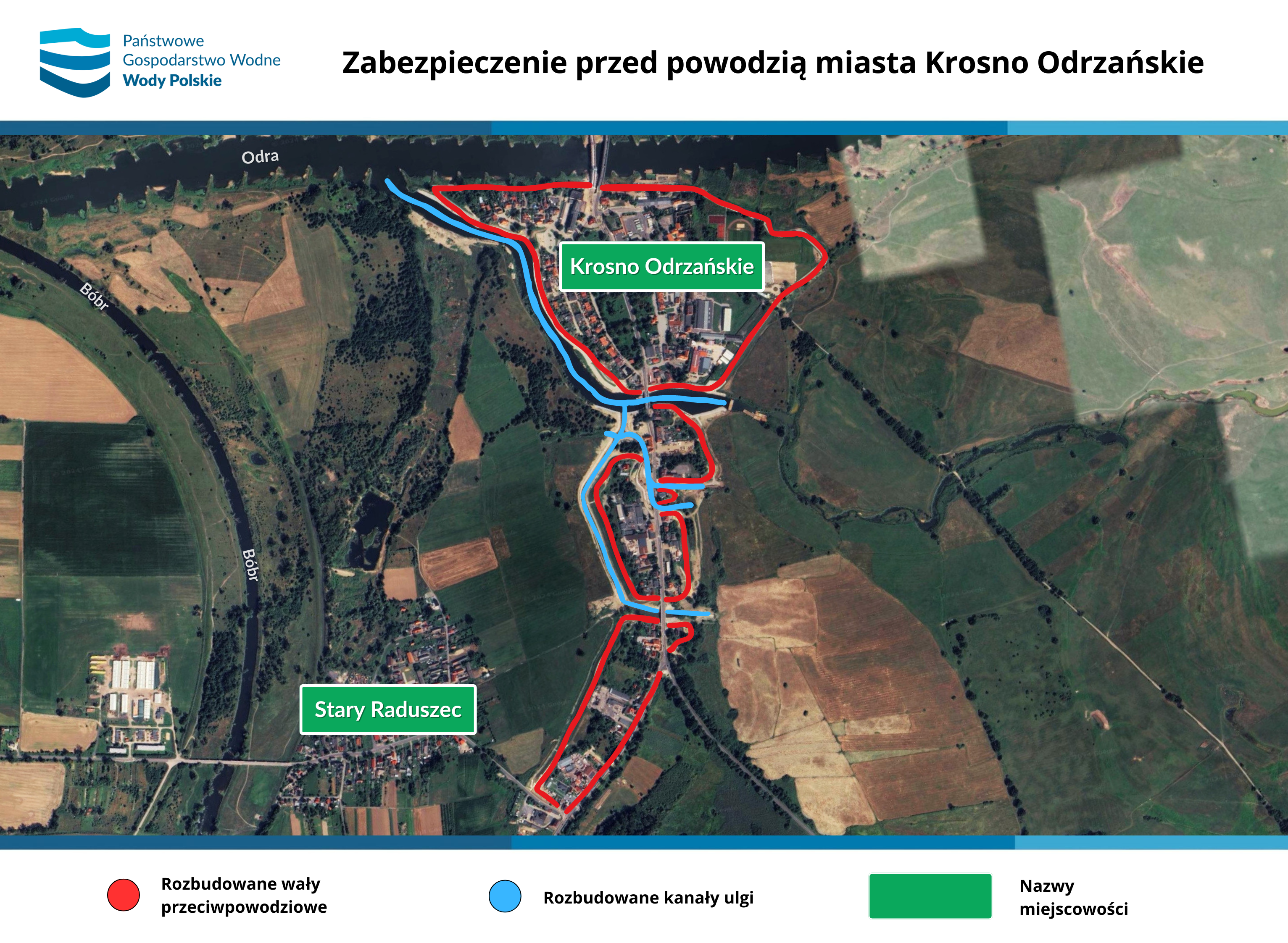Wody Polskie Regionalny Zarząd Gospodarki Wodnej we Wrocławiu zakończyły rozbudowę kolejnych zabezpieczeń przeciwpowodziowych wzdłuż Odry w województwie lubuskim. Dzięki budowie blisko 6 kilometrów nowych wałów oraz rozbudowie i udrożnieniu kanałów ulgi na odcinku prawie 3 kilometrów, w sposób kompleksowy chronionych przed powodzią jest kilka tysięcy osób mieszkających i pracujących na obszarze 60 hektarów lewego brzegu Odry w Krośnie Odrzańskim. Zabezpieczona jest również lokalna infrastruktura i dziedzictwo kulturowe, w tym zabudowa okolic Traktu Książęcego, zabytkowy Zamek Piastowski, kościół parafialny pw. Świętej Jadwigi Śląskiej czy Ośrodek Sportu i Rekreacji.