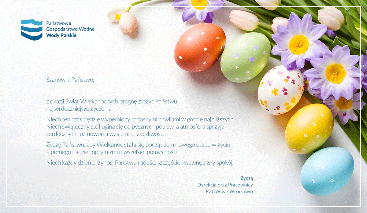 Niech nadchodzące święta Wielkiej Nocy napełnią wszystkich nas wiarą, nadzieją i miłością, a najbliższe dni będą okazją do spędzenia samych radosnych chwil w gronie najbliższej rodziny. Zdrowych, spokojnych i pięknych świąt oraz niezmiennej dbałości o dobro gospodarki wodnej w całym regionie – wszystkim klientom, partnerom i współpracownikom życzą Dyrekcja oraz Pracownicy RZGW we Wrocławiu.