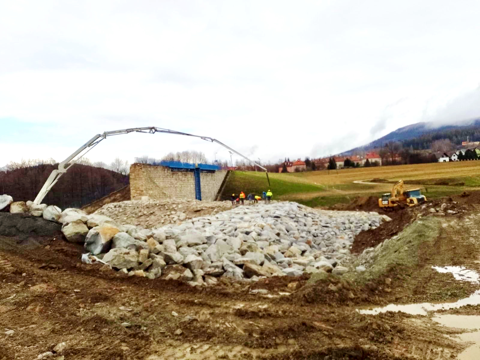 Następnie na miejsce prac budowlanych prowadzono dostawy kruszywa i transport kamienia hydrotechnicznego o wymiarach 50x100 cm, który następnie posłużył do formowania grodzy. W kolejnych fazach odbywało się formowanie lewobrzeżnej części zapory ziemnej w celu zabezpieczenia budowli przed dalszą degradacją, a także formowanie grodzy kamienno-betonowej wraz z wykonaniem ubezpieczenia odsłoniętej części sekcji przelewowej.