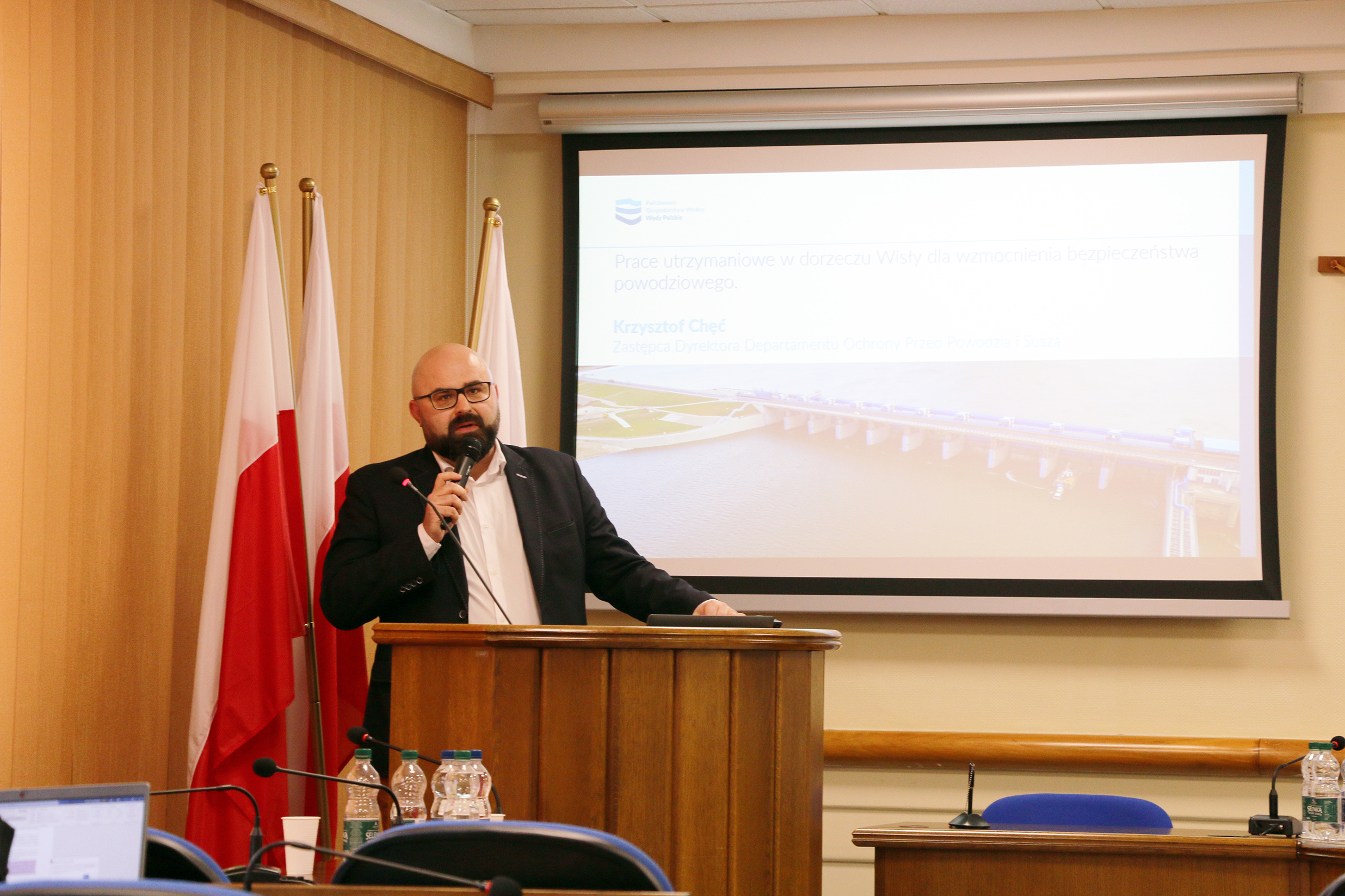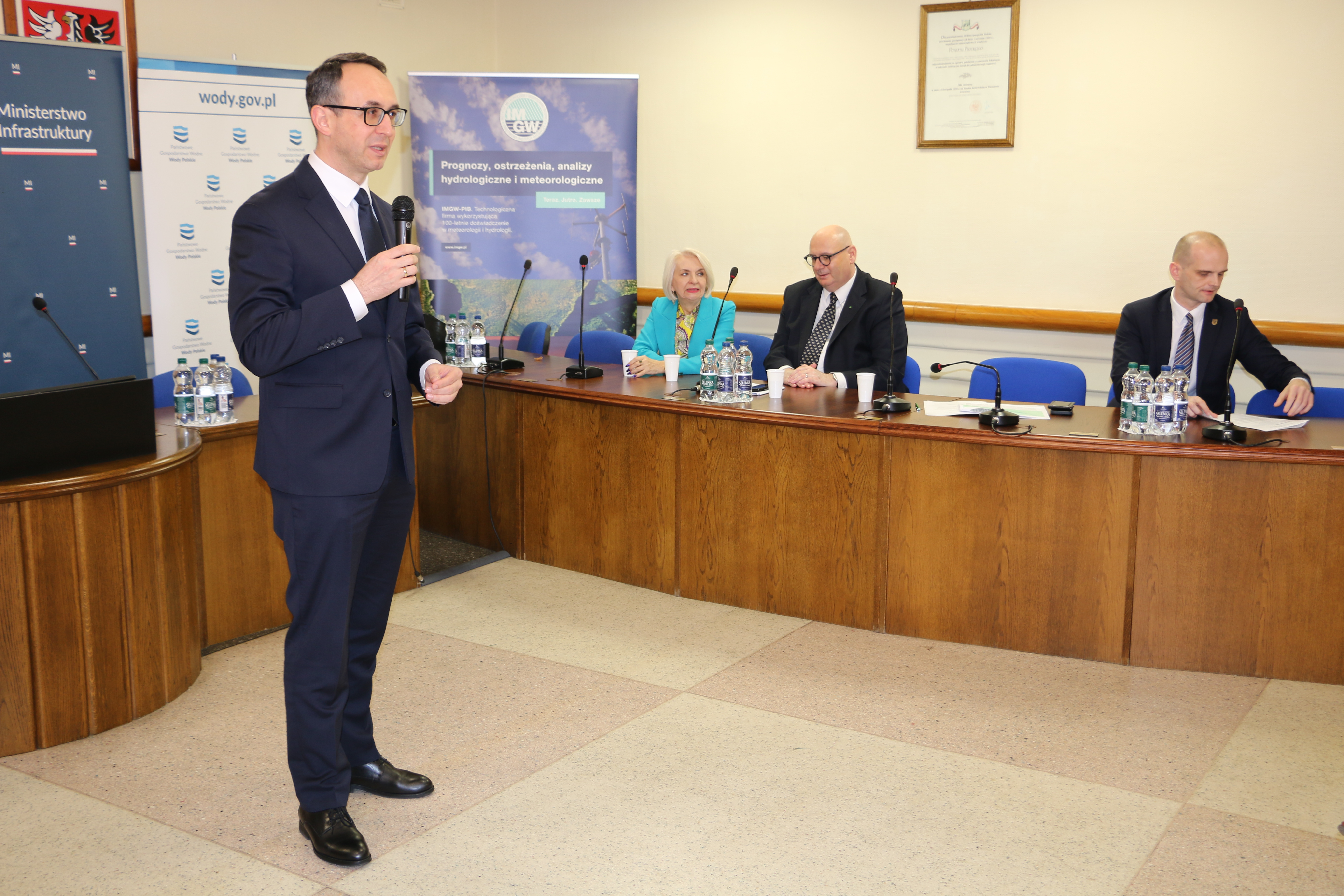 Paweł Przygrodzki – Dyrektor Centrum Hydrologicznej Osłony Kraju, nakreślił wpływ zmiany klimatu na zagrożenie hydrologiczne w Polsce. Następnie zaznaczył rolę prognozowania i ostrzegania hydrologicznego w dobie zmiany klimatu i przybliżył temat hydrologicznej osłony kraju prowadzonej przez IMGW-PIB. Paweł Przygrodzki stwierdził, że odświeżony serwis hydrologiczny hydro.imgw.pl to nowa jakość w osłonie hydrologicznej kraju. Dzięki niemu dane i produkty hydrologiczne będą prezentowane w sposób bardziej kompleksowy. To zapewni monitorowanie zjawisk, prognozowanie i ostrzeganie hydrologiczne w IMGW-PIB na jeszcze wyższym poziomie.