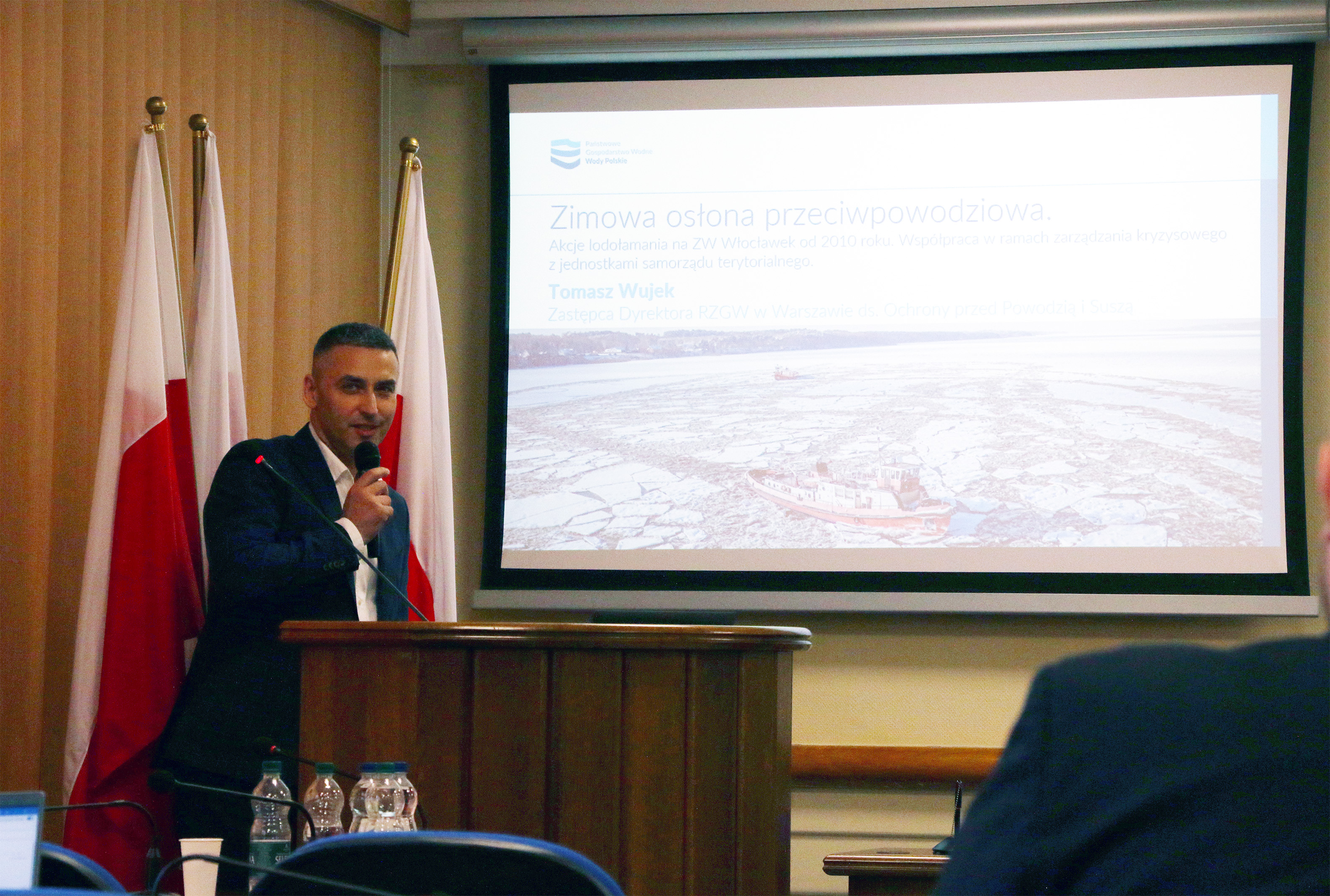 Tomasz Wujek - Zastępca Dyrektora Departamentu Ochrony Przed Powodzią i Suszą w Regionalnym Zarządzie Gospodarki Wodnej w Warszawie, opowiedział o zimowej osłonie przeciwpowodziowej na Zbiorniku Wodnym Włocławek. Tomasz Wujek zaznaczył, że w bazie we Włocławku stacjonuje 8 lodołamaczy, w tym 2 nowoczesne jednostki, które pozostają w gotowości do lodołamania od grudnia do marca. Następnie przedstawił zasady i warunki prowadzenia akcji lodołamania.