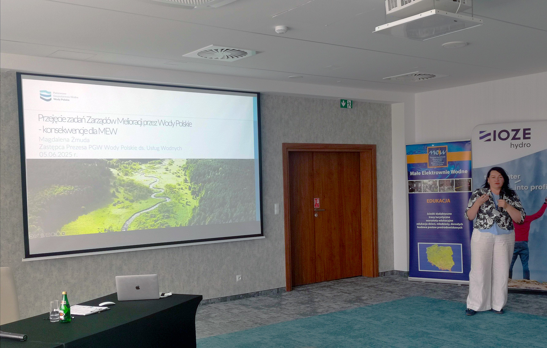 Wątek współpracy Wód Polskich z branżą małych elektrowni wodnych, zwłaszcza w warunkach przejmowania zadań od dawnych Zarządów Melioracji, prezes Magdalena Żmuda poruszyła na forum kongresu, szczegółowo omawiając również rolę Wód Polskich, które są partnerem dla branży jako podmiot gospodarujący mieniem Skarbu Państwa, niezbędnym dla funkcjonowania i rozwoju elektrowni wodnych.