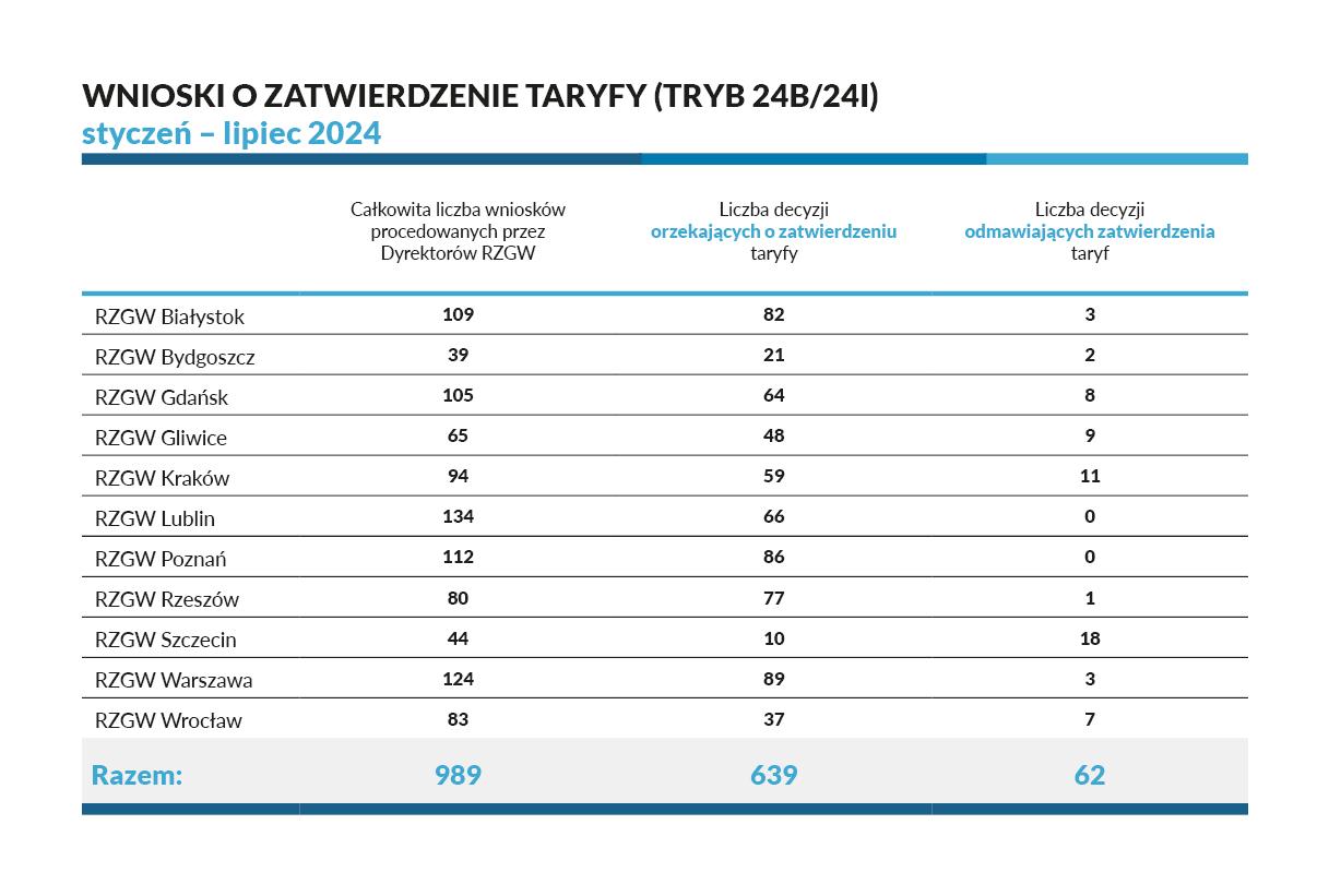 W okresie 7 miesięcy 2024 roku do Dyrektorów RZGW wpłynęło łącznie 1312 wniosków w dwóch trybach taryfowych: