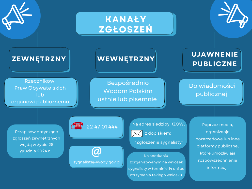 Realizacja obowiązek ustawowy, Państwowe Gospodarstwo Wodne Wody Polskie ustaliło wewnętrzną procedurą dokonywania zgłoszeń wewnętrznych i podejmowania działań następczych Zarządzeniem nr 41/2024 Prezesa Państwowego Gospodarstwa Wodnego Wody Polskie z dnia 17.09.2024 r. w sprawie wprowadzenia wewnętrznej procedury dokonywania zgłoszeń naruszeń prawa i podejmowania działań następczych w Państwowym Gospodarstwie Wodnym Wody Polskie.