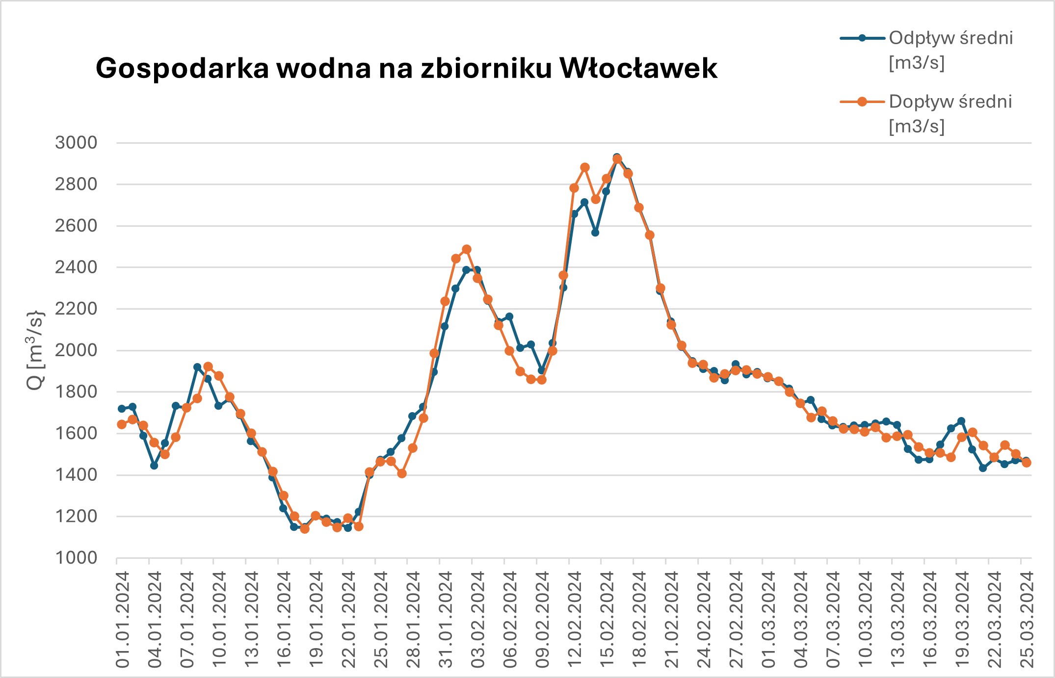 Na Zbiorniku Włocławek w ostatnim kwartale wystąpiło kilkukrotne przejście kulminacji wezbrań – pierwsze w grudniu, później niewielkie na początku stycznia, a następnie dwie wyższe na przełomie stycznia i lutego oraz w połowie lutego. Najwyższy dopływ do zbiornika zaobserwowany został w dniu 16.02.2024 r. i wynosił ok. 2920 m3/s.