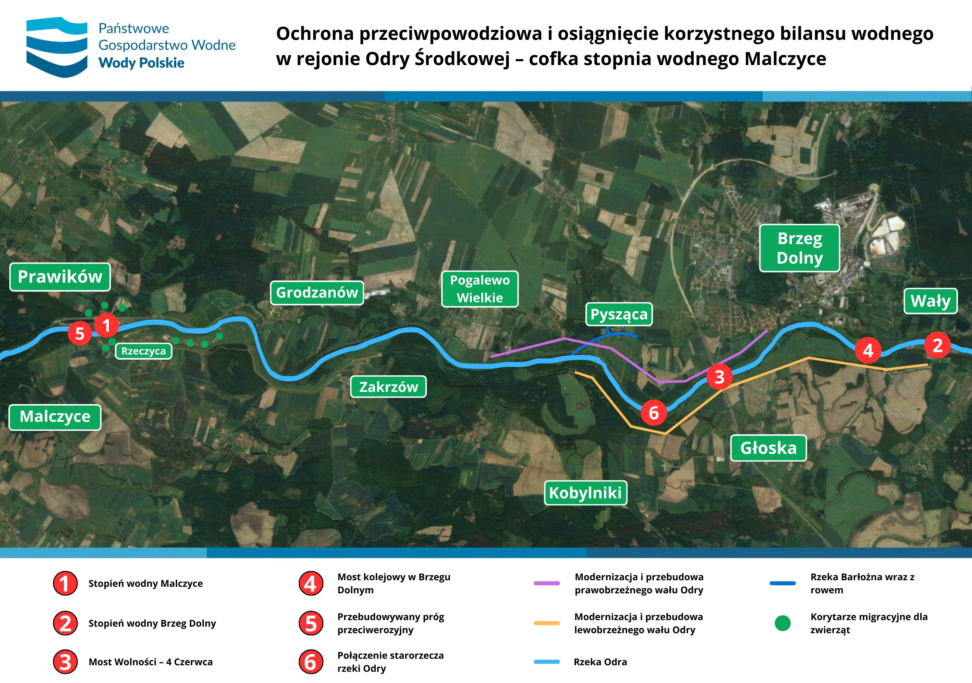 Rozbudowane i zmodernizowane wały przeciwpowodziowe Odry w rejonie Brzegu Dolnego, renaturyzacja fragmentu rzeki Barłożna i sąsiedniego rowu i nowe korytarze migracyjne dla zwierząt. Taki m.in. będzie efekt prac w cofce stopnia wodnego Malczyce na Odrze, które Wody Polskie rozpoczęły w tym roku. Dzięki temu zwiększy się bezpośrednia ochrona przed powodzią kilku tysięcy mieszkańców Brzegu Dolnego, Pyszącej, Pogalewa Małego i Wielkiego, Grodzanowa, Głoski, Zakrzowa i Rzeczycy w województwie dolnośląskim.