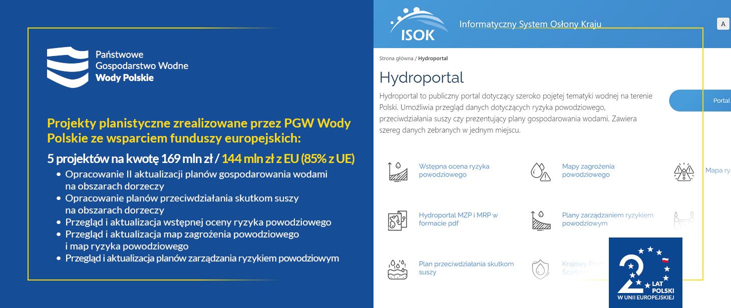 Pierwszym z nich jest ISOK, czyli Informatyczny System Osłony Kraju. Podstawowym celem projektu jest konsolidacja informacji o zagrożeniach i umieszczenie ich w profesjonalnym systemie informatycznym, wykorzystującym zintegrowaną bazę danych oraz nowoczesny moduł rozpowszechniania informacji do użytkowników, zapewniając dostęp zarówno dla administracji, jak i indywidualnego obywatela. Projekt ukończyły Wody Polskie we współpracy z Głównym Urzędem Geodezji i Kartografii, Instytutem Meteorologii i Gospodarki Wodnej - PIB, Instytutem Łączności - PIB oraz, w roli partnera, Rządowym Centrum Bezpieczeństwa. Funkcjonalność ISOK-a można sprawdzić na stronie: https://wody.isok.gov.pl