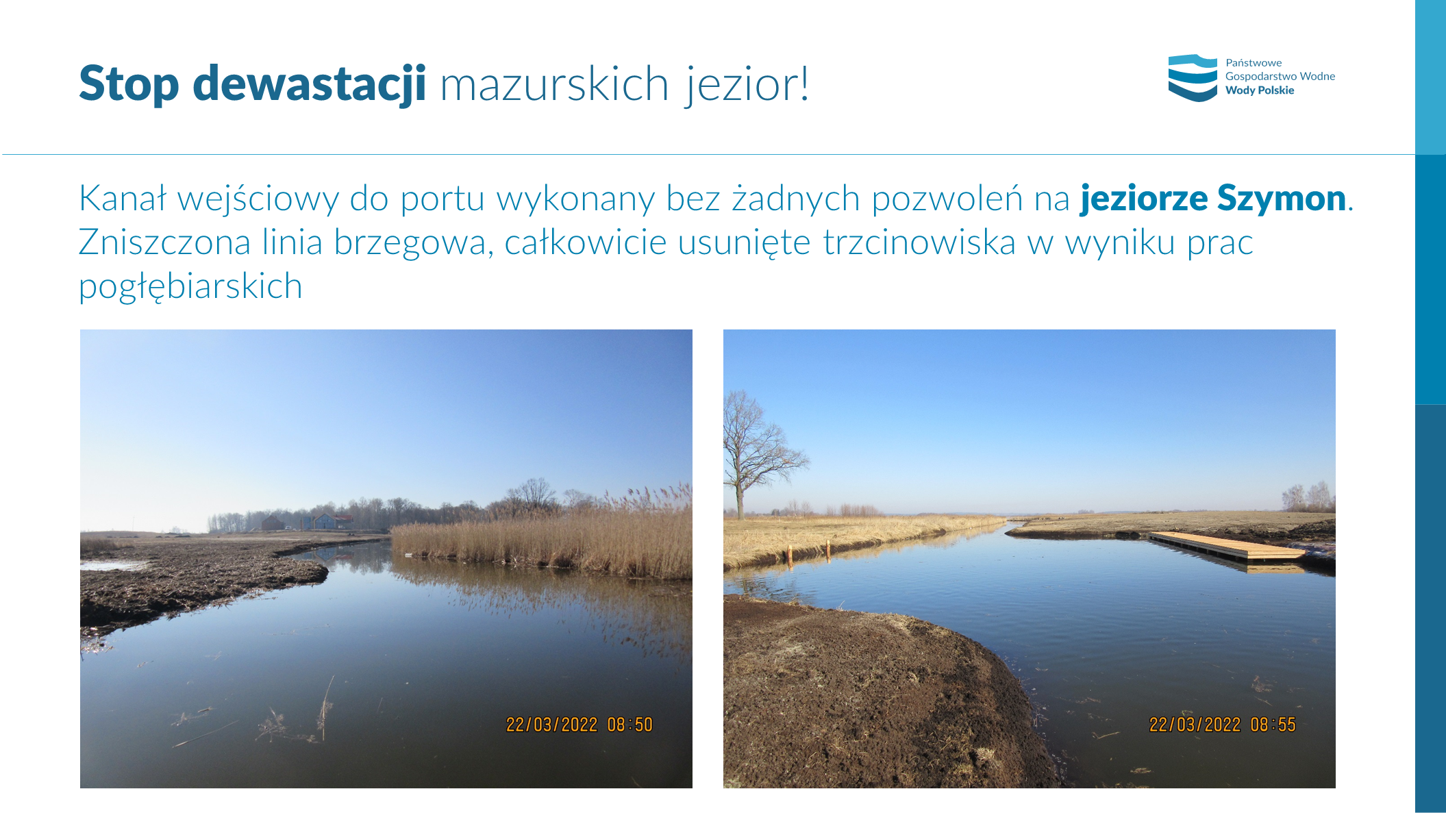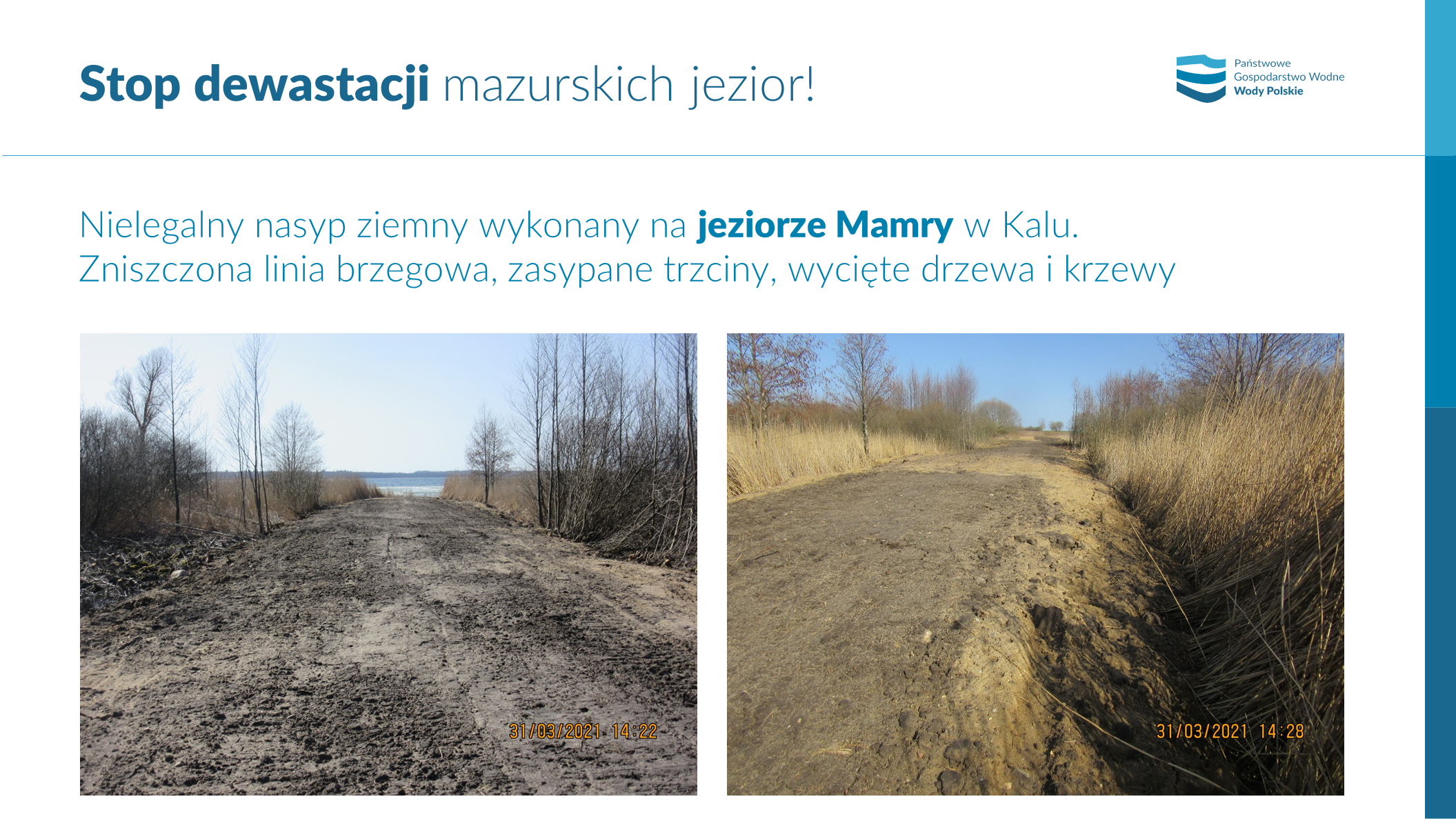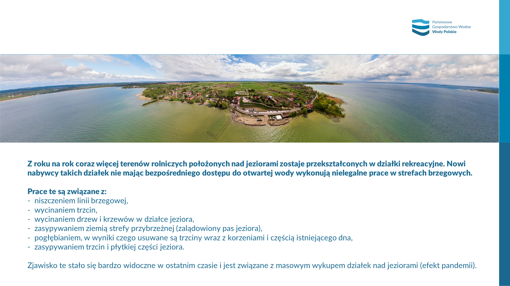 Nielegalne prace najczęściej polegają na pogłębianiu jezior, niszczeniu przybrzeżnej zabudowy roślinnej, głównie wycince trzcin i zadrzewień nadwodnych, budowie pomostów i wykonywaniu umocnień brzegów. Na wszystkie tego typu działania wymagane jest uzyskanie zgody wodnoprawnej. Jeśli prace odbywają bez uzgodnień sprawa kierowana jest do organów ścigania. Zgodnie z art. 475 ustawy Prawo wodne za niszczenie lub uszkadzanie brzegów wód śródlądowych grozi kara grzywny, ograniczenia wolności lub kara pozbawienia wolności do roku.