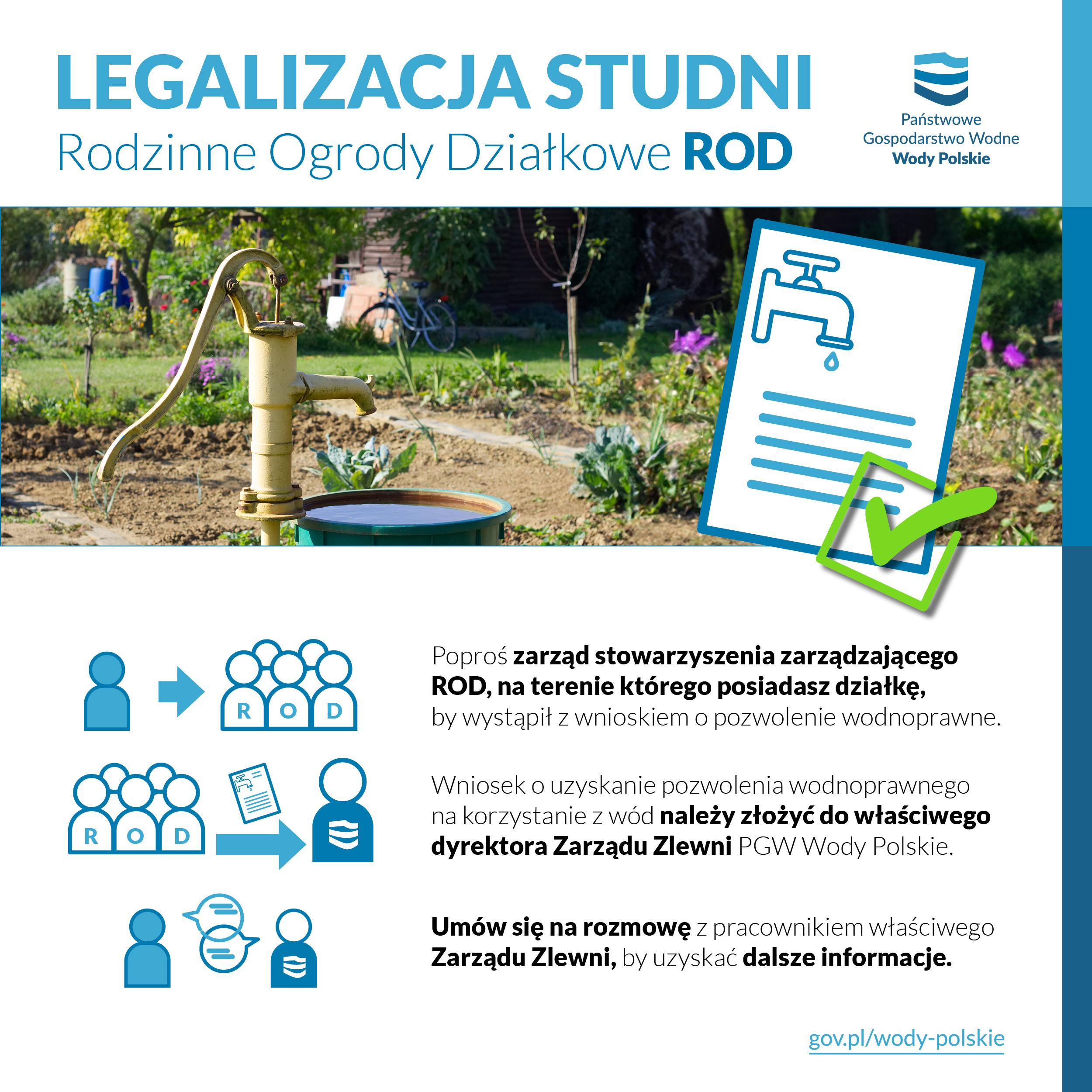 Natomiast każdy właściciel działki, na terenie której znajduje się studnia, musi ją zalegalizować. Przypominamy jednocześnie, że pozwolenia wodnoprawne wydawane są stowarzyszeniom ogrodowym zarządzającym ROD, a nie poszczególnym członkom stowarzyszenia. To na zarządzie stowarzyszenia ROD spoczywa obowiązek legalizacji korzystania z wód poprzez wystąpienie o pozwolenie wodnoprawne.
