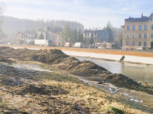 W obrębie miasta prowadzone są prace związane z transportowaniem rumoszu z koryta rzeki na potrzeby zabudowy wyrwy zlokalizowanej na lewym brzeg rzeki. Równocześnie materiałem pozyskanym z koryta rzecznego zabezpieczono podmyte fundamenty muru oporowego, znajdującego się na prawym brzegu rzeki. Trwają też działania w zakresie montażu ścianki szczelnej odbudowywanego wału przeciwpowodziowego.