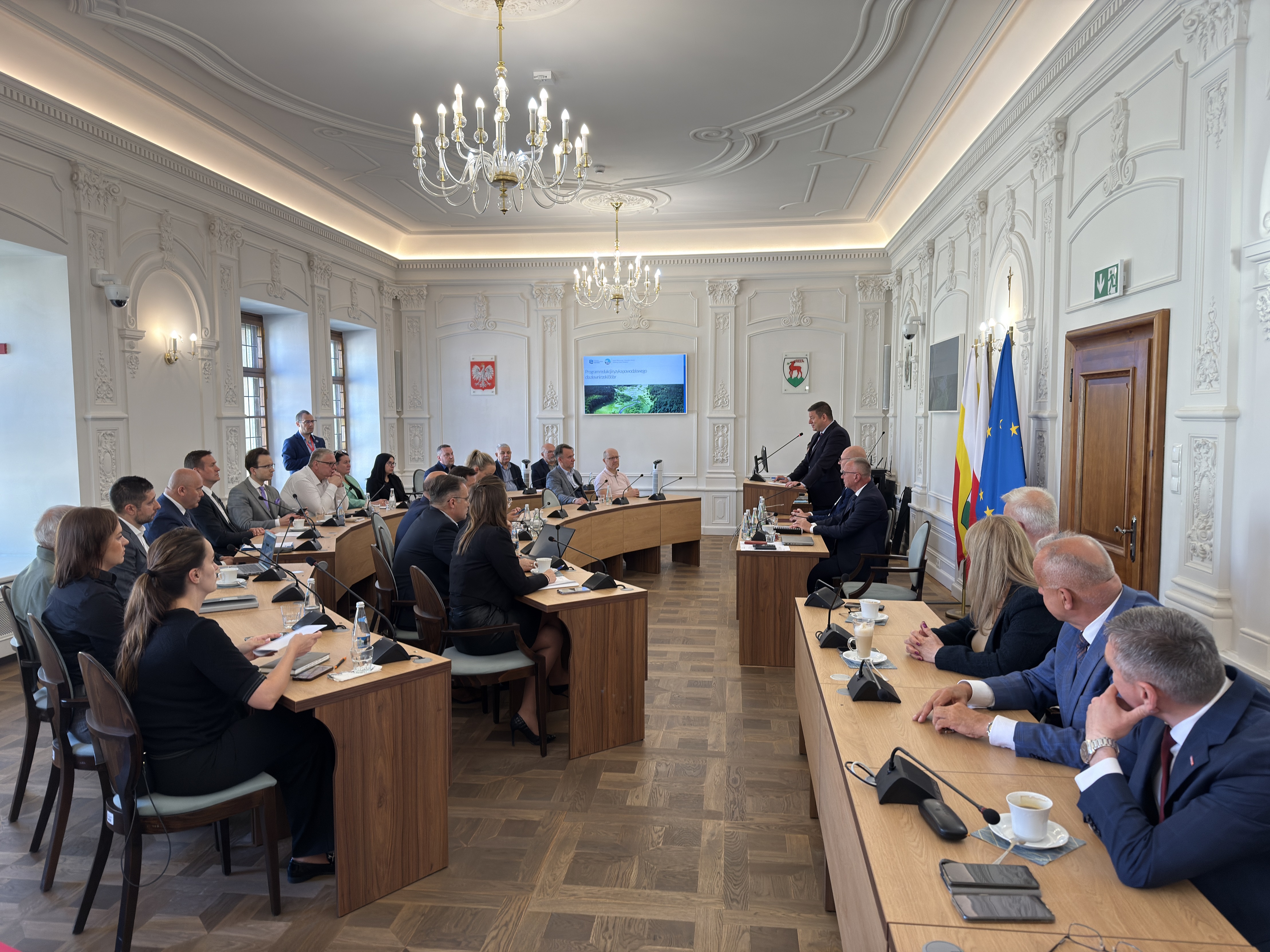 Część prezentacyjna rozpoczęła się od przedstawienia skali powodzi z września 2024 r., istotne awarie infrastruktury i dotychczas podjęte działania. Omówiono aktualne dokumenty planistyczne na bazie modeli hydraulicznych, inwentaryzację i szacowanie skutków oraz strat powodziowych, a także program planowanych inwestycji.