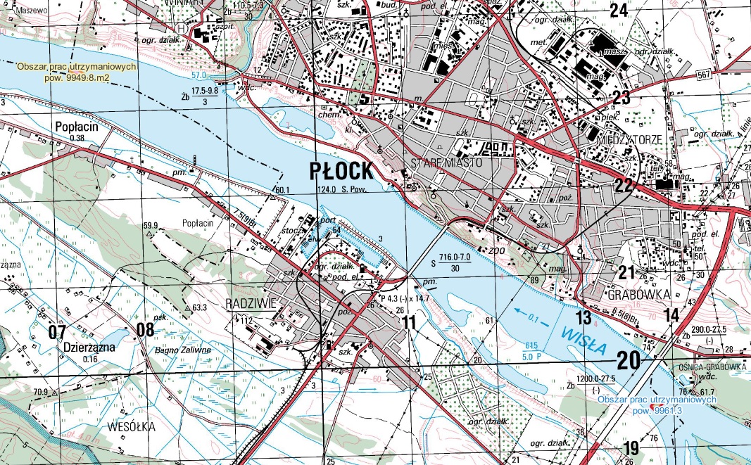 - Lokalizacja nr 1: Radziwie/Płock w km 628+700 – 628+900 na obszarze Zbiornika Włocławskiego na terenie miasta Płock.