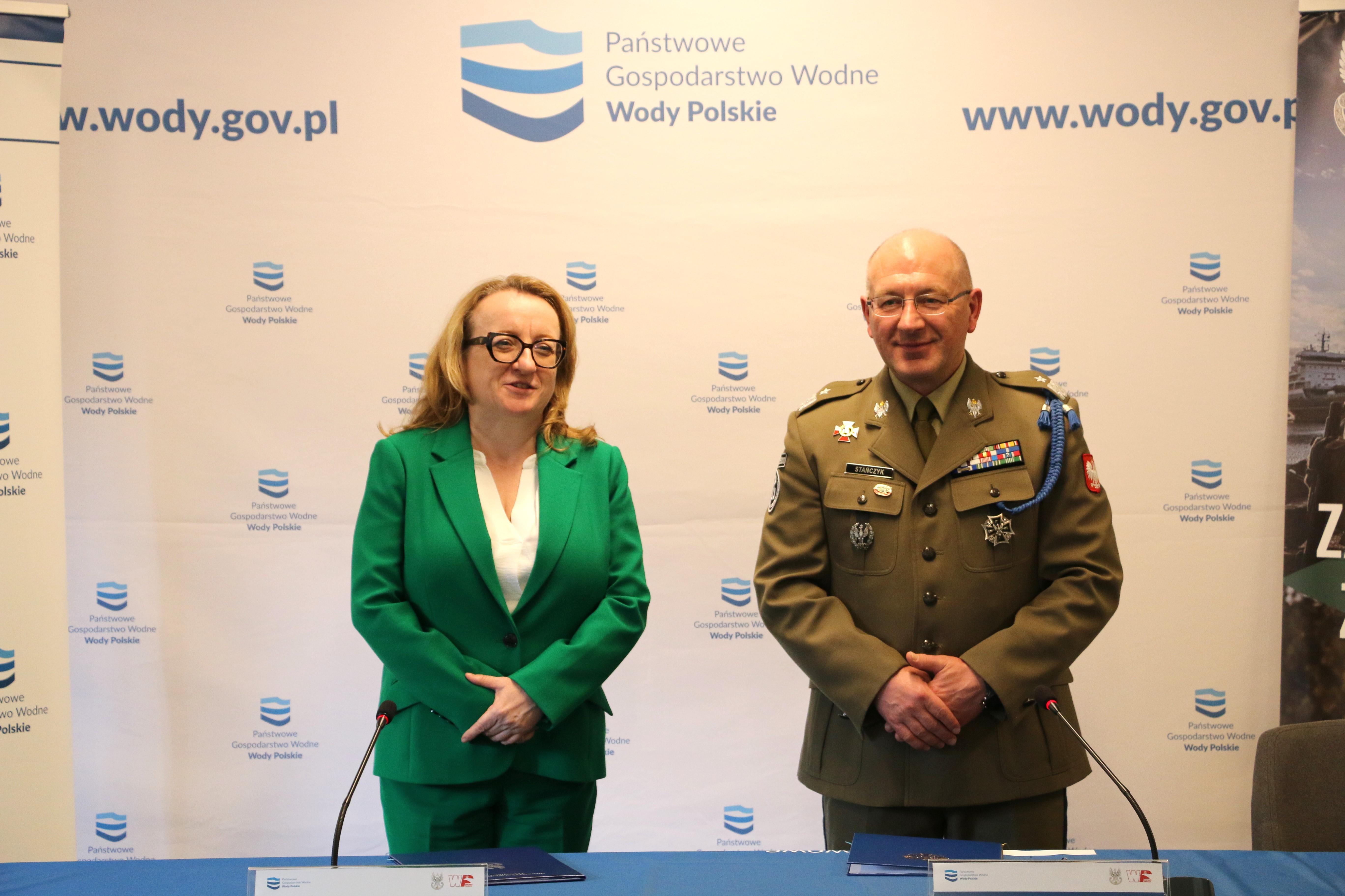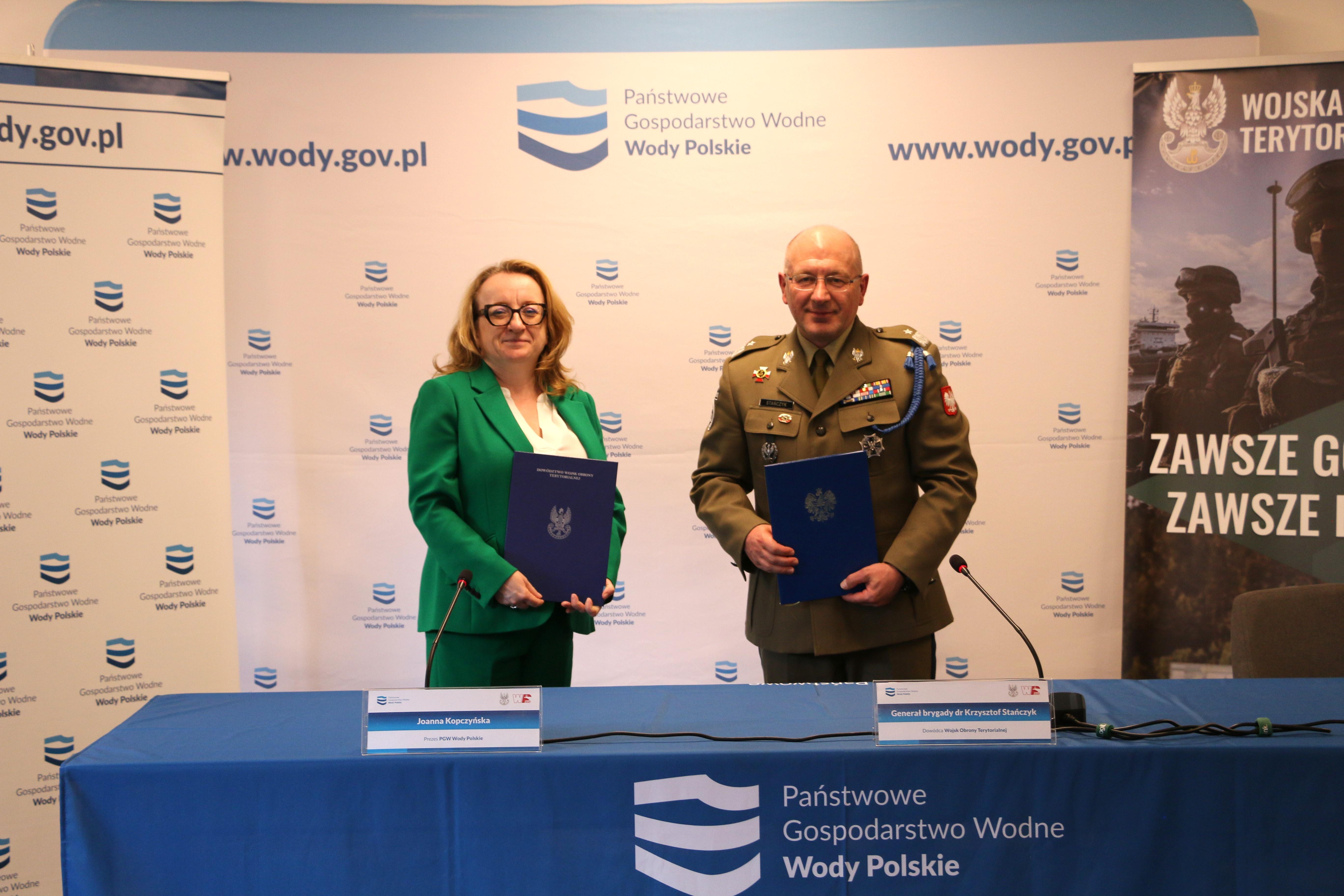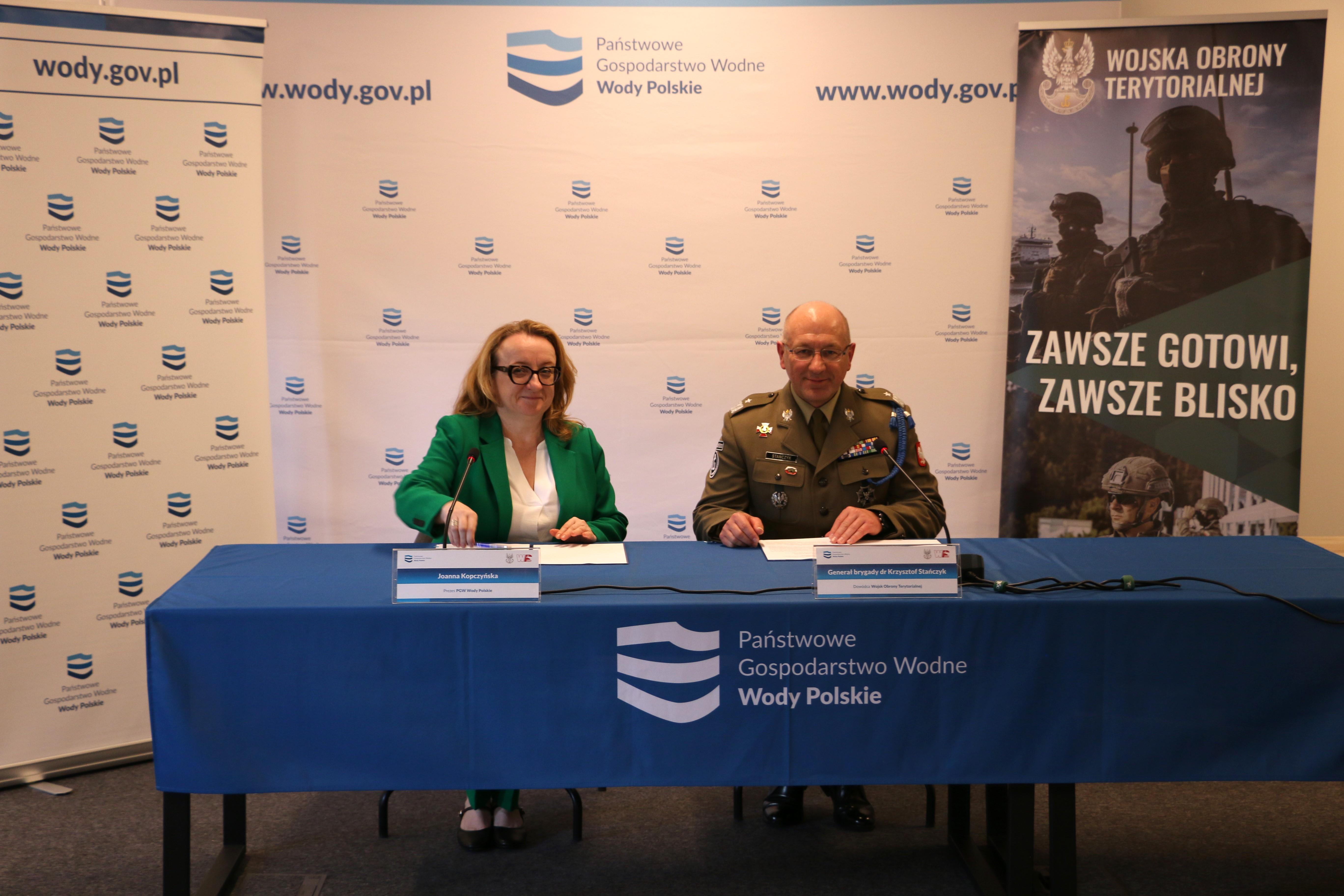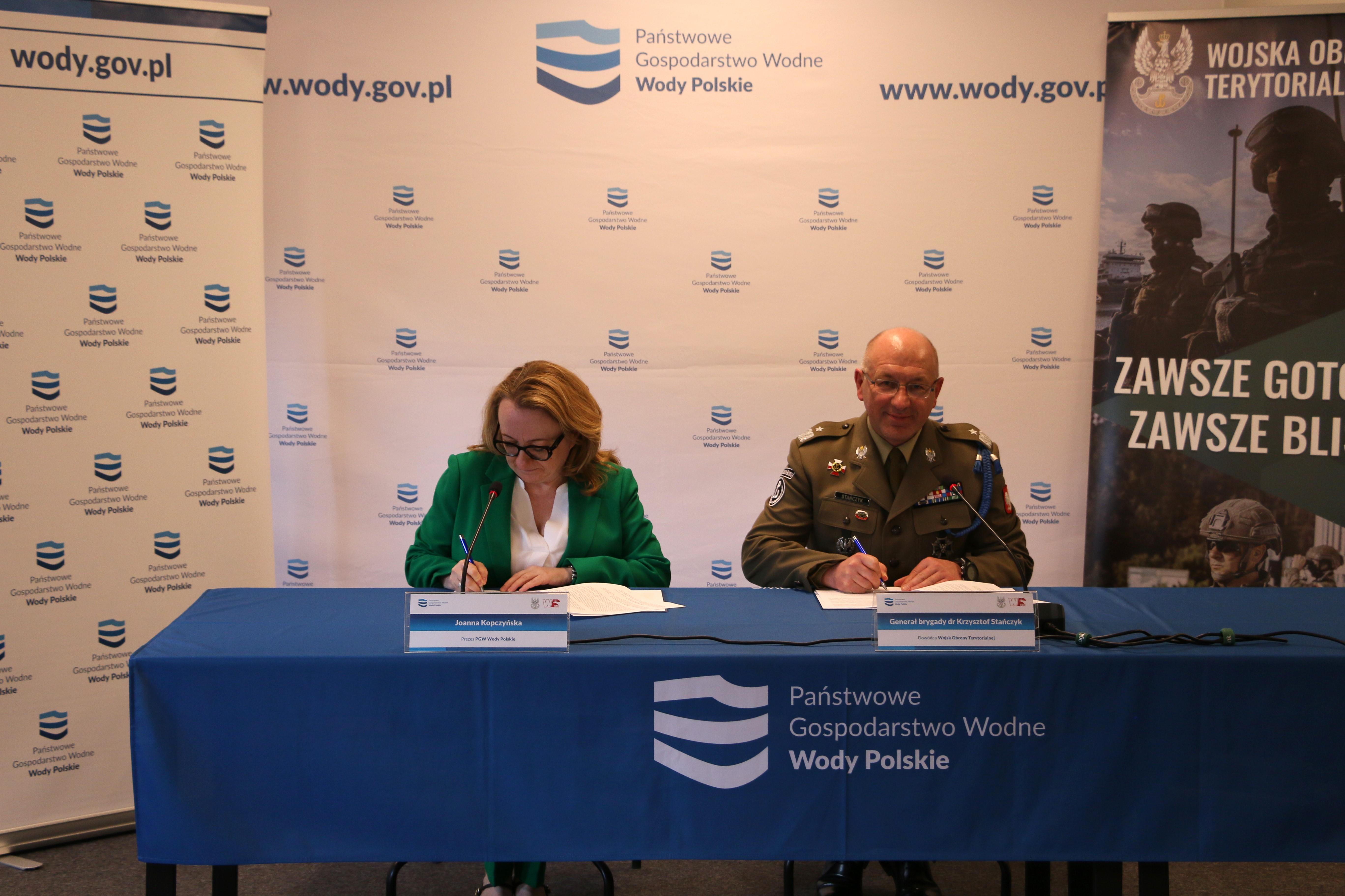 Porozumienie umożliwi pracownikom Wód Polskich uczestnictwo w szkoleniach kształtujących nawyki i umiejętności praktyczne promujące postawy proobronne oraz odpowiednie zachowanie w przypadku wystąpienia zagrożeń. Będzie również podstawą do prowadzenia wspólnych ćwiczeń i wzajemnej promocji naszych instytucji. Dokument podpisała Joanna Kopczyńska - Prezes Wód Polskich oraz gen. bryg. Krzysztof Stańczyk - Dowódca Wojsk Obrony Terytorialnej.