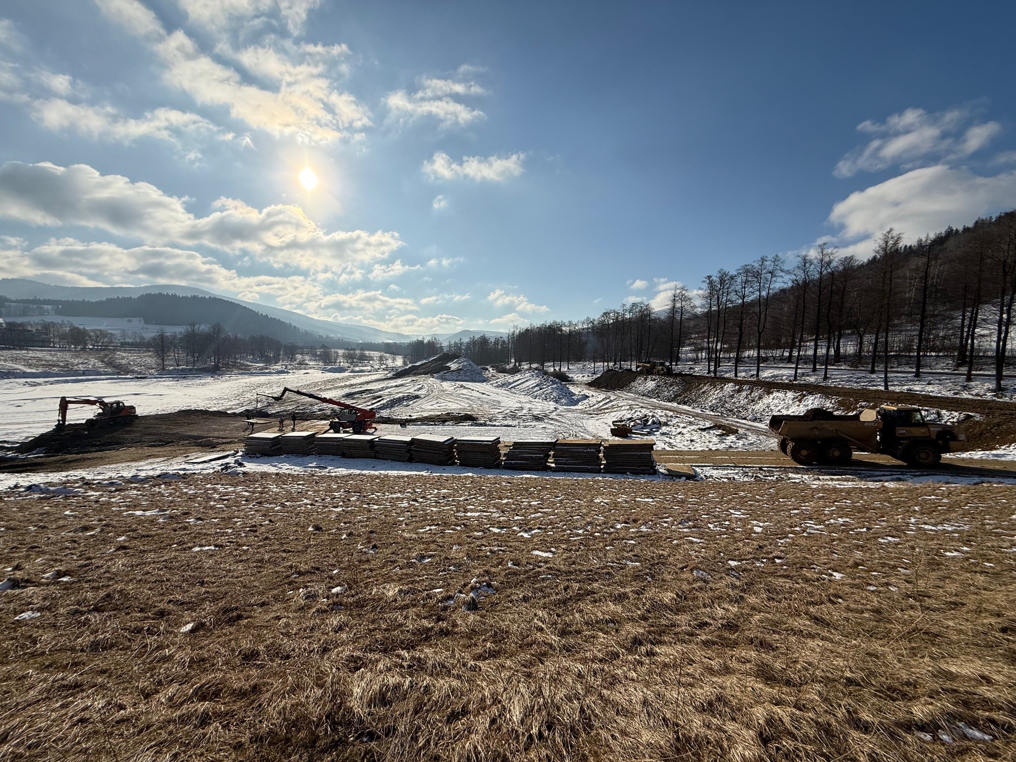 W bieżącym tygodniu roboty budowlane koncentrowały się na kształtowaniu nasypów pod konstrukcję grodzy oraz profilowaniu trasy bocznego przelewu stokowego do koryta rzeki Morawa. Kontynuowano także umacnianie płytami betonowymi dróg technologicznych i tymczasowych placów składowych. Prowadzono również prace związane z kształtowaniem nachylenia skarp lewobrzeżnego wału korpusu zapory. Na miejscu cały czas pracuje ciężki sprzęt wraz z obsługą - koparki, wozidła, ładowarki, spycharki oraz walec.