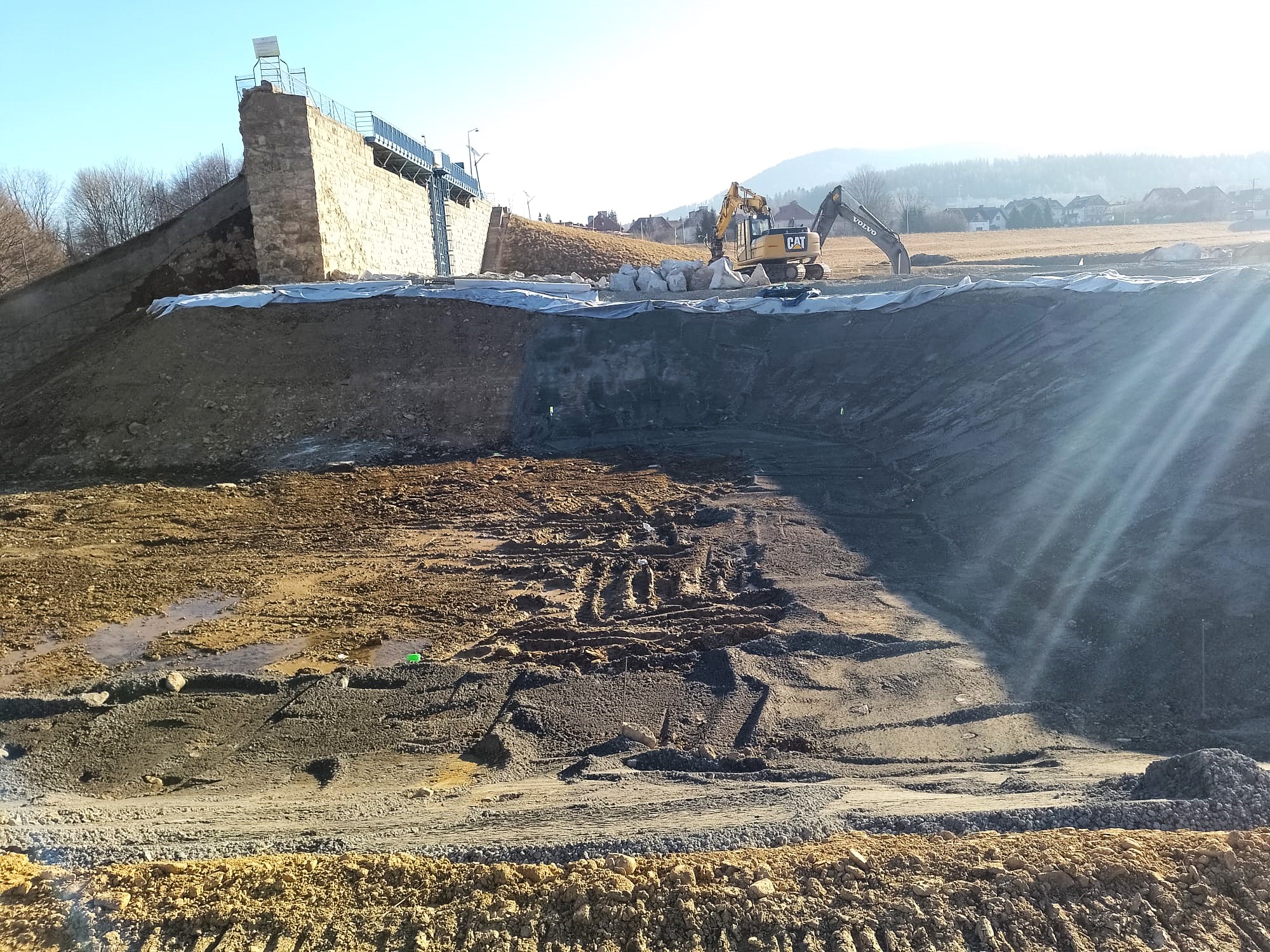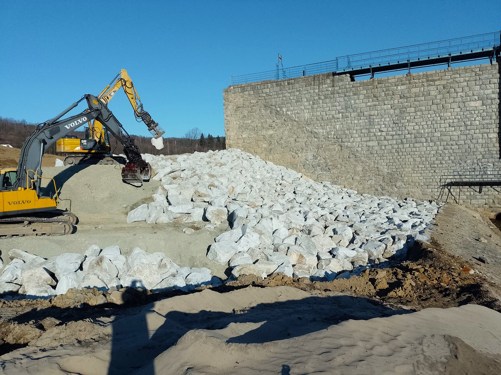 W kolejnych dniach realizowane będą dostawy kamienia hydrotechnicznego i układanie go na korpusie grodzy. W przyszłym tygodniu przewiduje się rozpoczęcie betonowania wykonanego narzutu kamiennego oraz dalsze profilowanie przelewu stokowego.