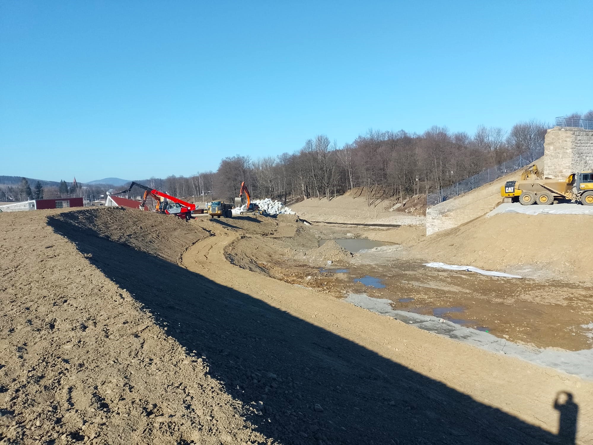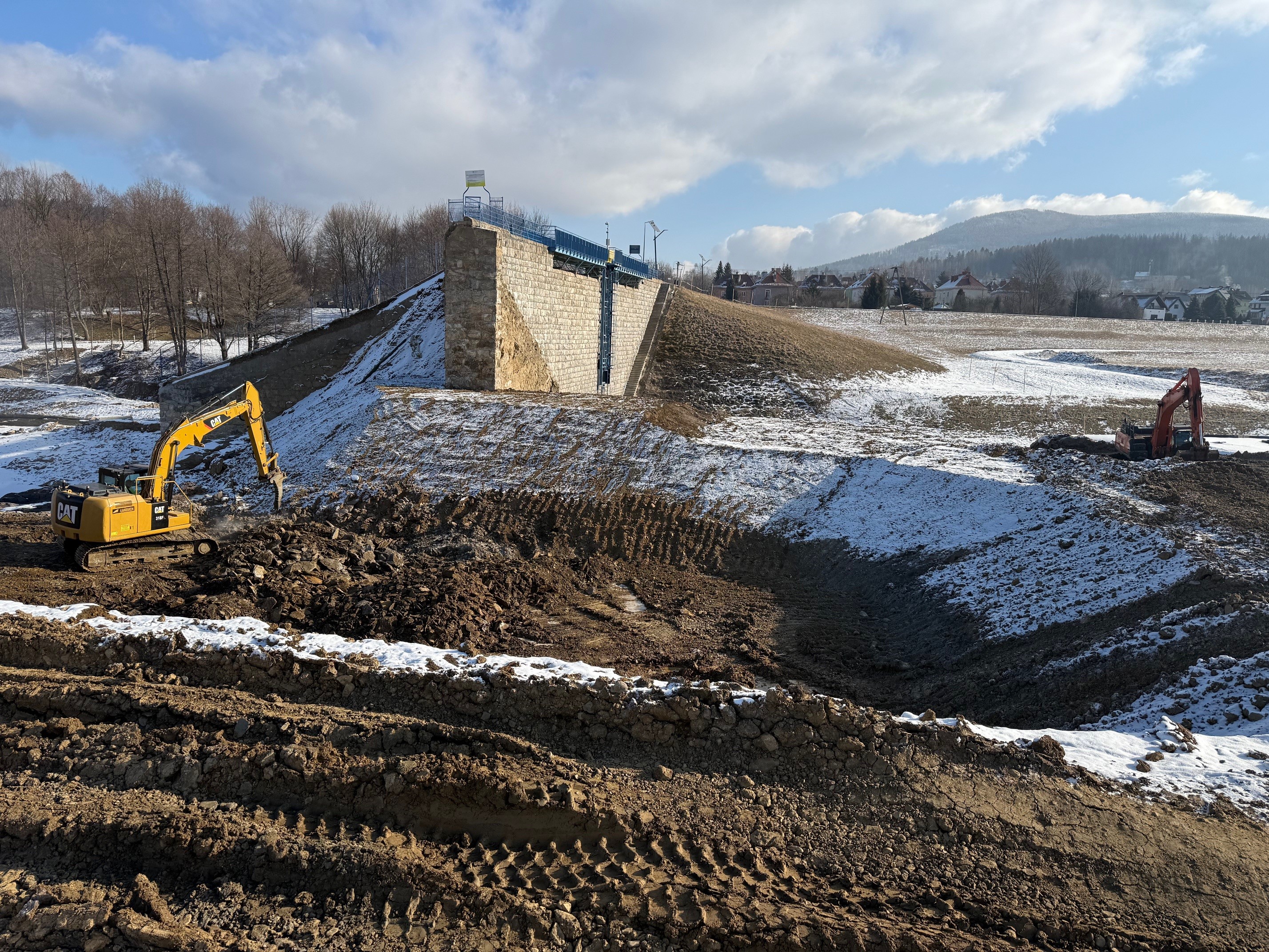 Mimo zimowej pogody i ujemnych temperatur nieustannie trwają prace przy zabezpieczaniu uszkodzonego suchego zbiornik przeciwpowodziowego w Stroniu Śląskim. W bieżącym tygodniu roboty budowlane koncentrowały się na kształtowaniu nasypów pod konstrukcję grodzy oraz profilowaniu trasy bocznego przelewu stokowego do koryta rzeki Morawa.