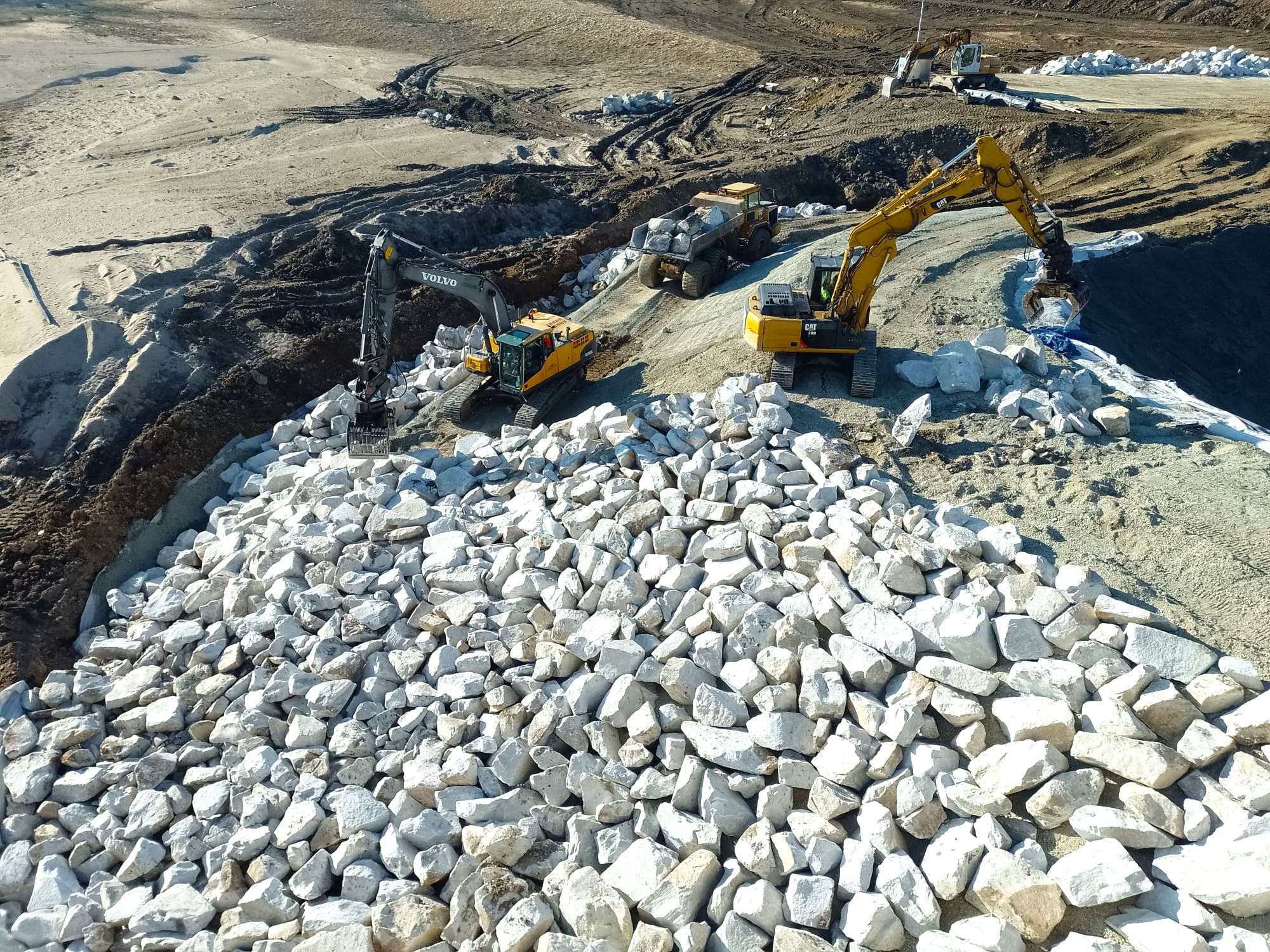 Rozpoczęto również prowadzenie dostaw kruszywa i kamienia hydrotechnicznego o wymiarach 50x100 cm, który następnie posłuży do formowania grodzy. Na miejscu cały czas pracuje ciężki sprzęt wraz z obsługą - koparki, wozidła, ładowarki, spycharki oraz walec.