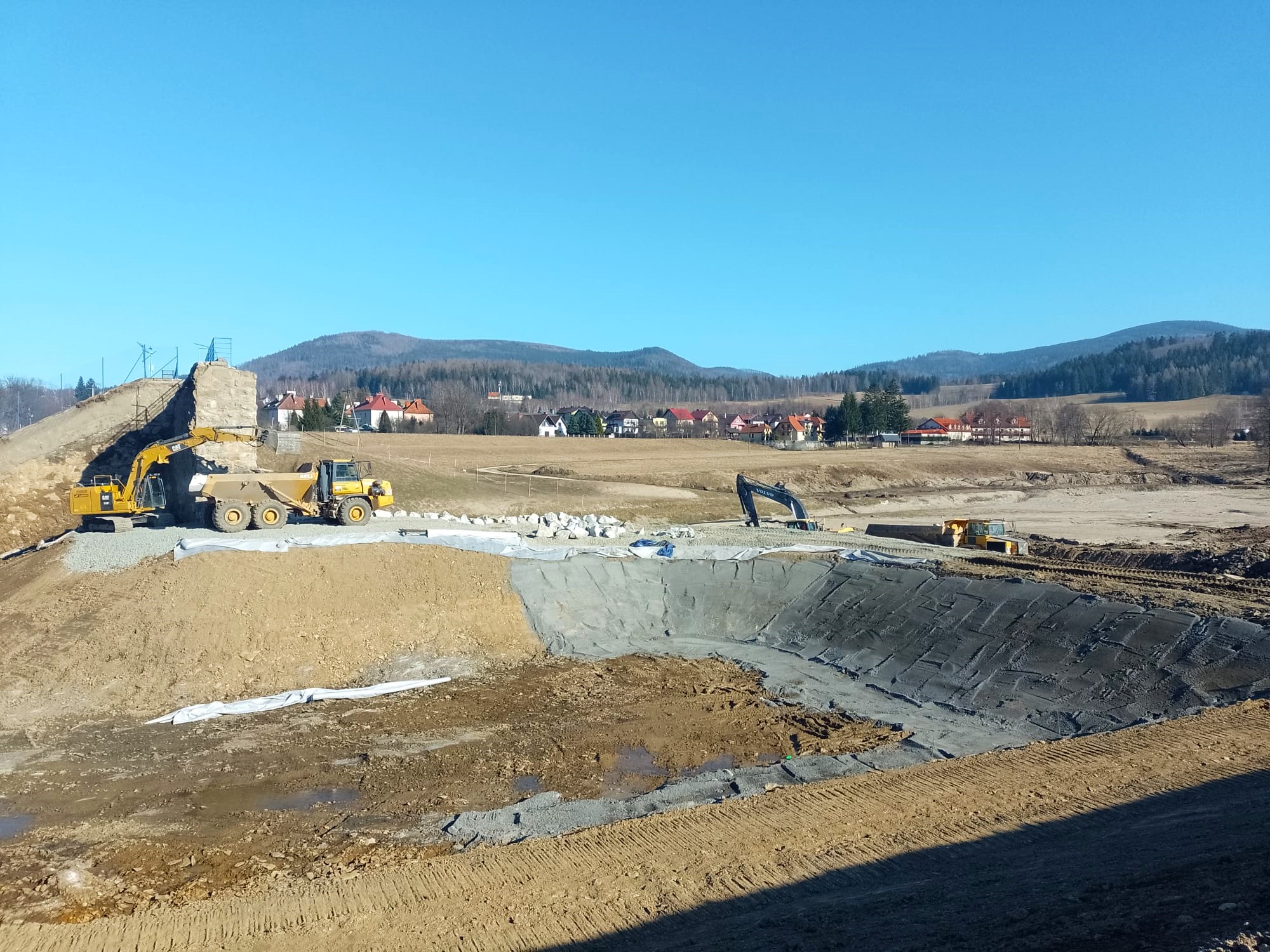 W ostatnim tygodniu lutego roboty budowlane koncentrowały się na dostawach kamienia hydrotechnicznego oraz kruszywa na obsypkę bentomaty oraz wykonywaniu wykopu pod ubezpieczenie kamienne, a także układaniu bentomaty wraz z warstwą ochronną z geowłókniny i z kruszywa. Działania obejmowały także kształtowanie nasypów pod konstrukcję grodzy oraz profilowaniu trasy bocznego przelewu stokowego do koryta potoku Morawka. Na miejscu cały czas pracuje ciężki sprzęt wraz z obsługą - koparki, wozidła, ładowarki, spycharki, wywrotki, ciągniki siodłowe oraz walec.