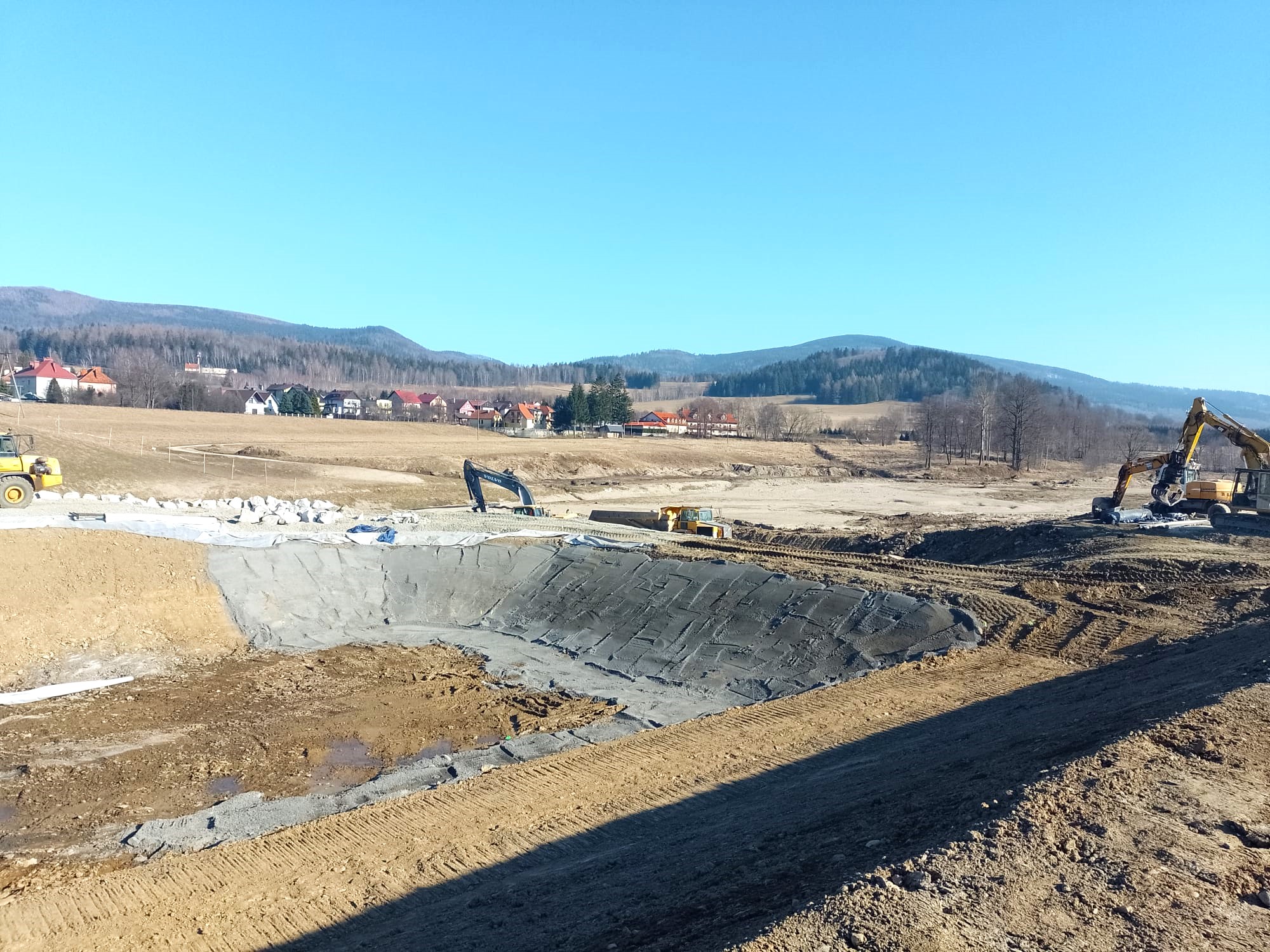 W bieżącym tygodniu prace nad zabezpieczenie zbiornika weszły w kolejny etap. Z powodzeniem zakończono prace ziemne nad kształtowaniem nasypu grodzy i przykryto go matami zabezpieczającymi. Dzięki temu możliwe było rozpoczęcie układania ciężkiego narzutu kamiennego. Prowadzone były również prace ziemne związane z kształtowaniem powierzchni przelewu stokowego i połączeniem go z korytem rzeki Morawka.