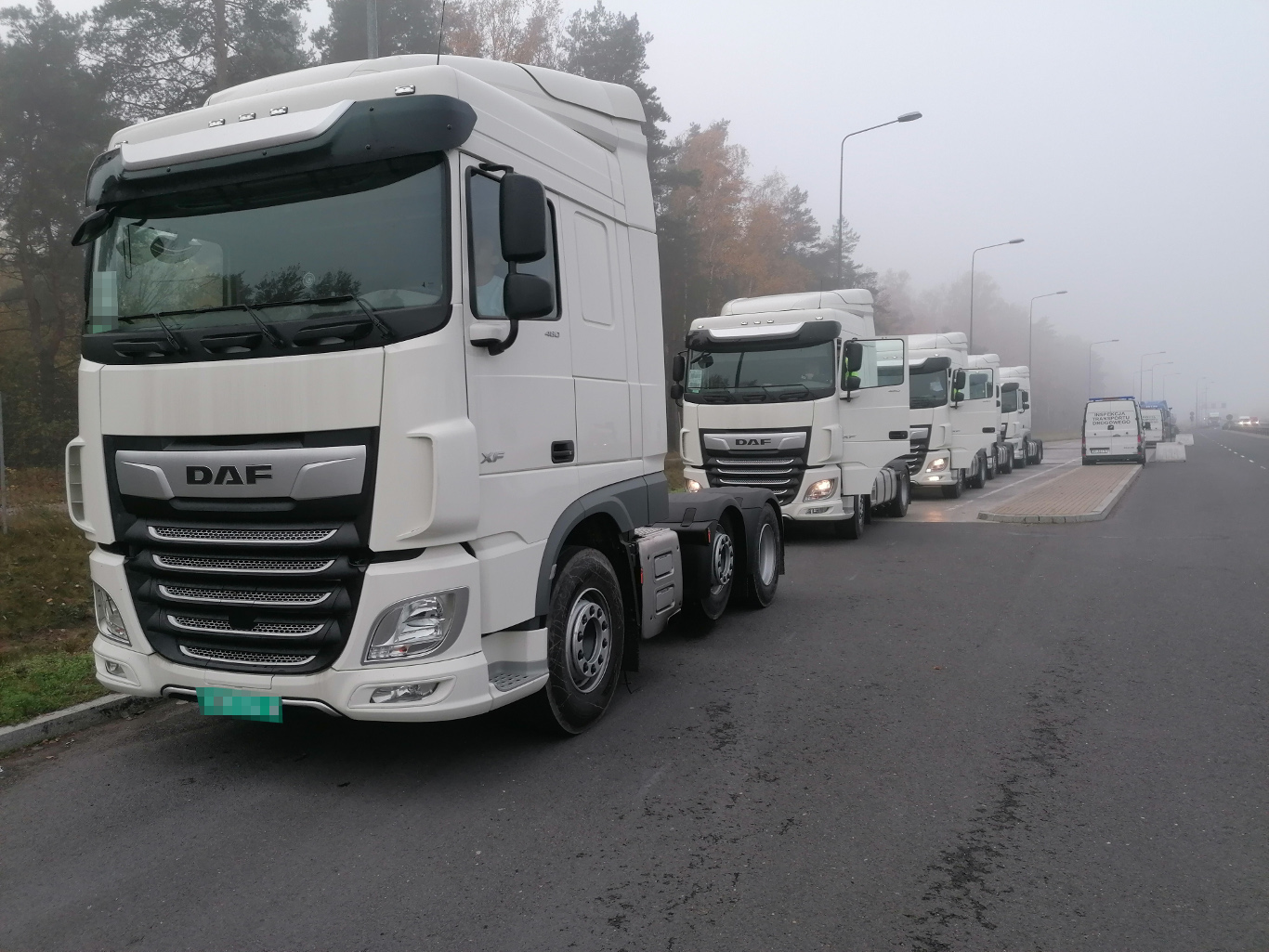 Inspektorzy zatrzymali 5 ciągników siodłowych na próbnych numerach austriackich poruszających się na trasie Niderlandy – Kazachstan prowadzonych przez obywateli Białorusi na rzecz przewoźnika gruzińskiego. Wskazania anteny DSRC ujawniły, że każdy z kierowców prowadził pojazd bez karty zalogowanej w tachografie. Uzyskane do kontroli dokumenty przewozowe potwierdziły wykonywanie przewozu drogowego. Ustalono, że żaden z kierujących nie posiada własnej karty kierowcy pomimo zatrudnienia na stanowisku kierowcy przez kontrolowany podmiot gruziński. W takiej sytuacji nie powinni prowadzić pojazdów wyposażonych w tachografy cyfrowe.