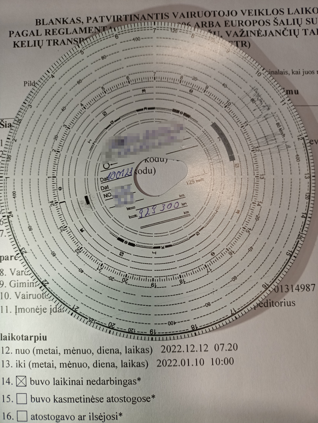 Podczas kontroli odczytano bieżący stan liczydła kilometrażu samochodu i zapisy czasu pracy kierowcy na wykresówce uzyskanej z tachografu. Wątpliwości inspektorów wzbudziła znaczna rozbieżność między zadeklarowanym miejscem włożenia tarczy, a miejscem zatrzymania do kontroli. Dystans między Valaviciai (LT) a miejscem kontroli wynosił ok.210 km, lecz zapis na wykresówce wskazywał na przejechanie tylko 145 km. Zweryfikowano dodatkowo rozmiar opon osi napędowej jako zgodny z danymi na wklejce z badania okresowego tachografu, brakowało więc zapisu 65 kilometrów.