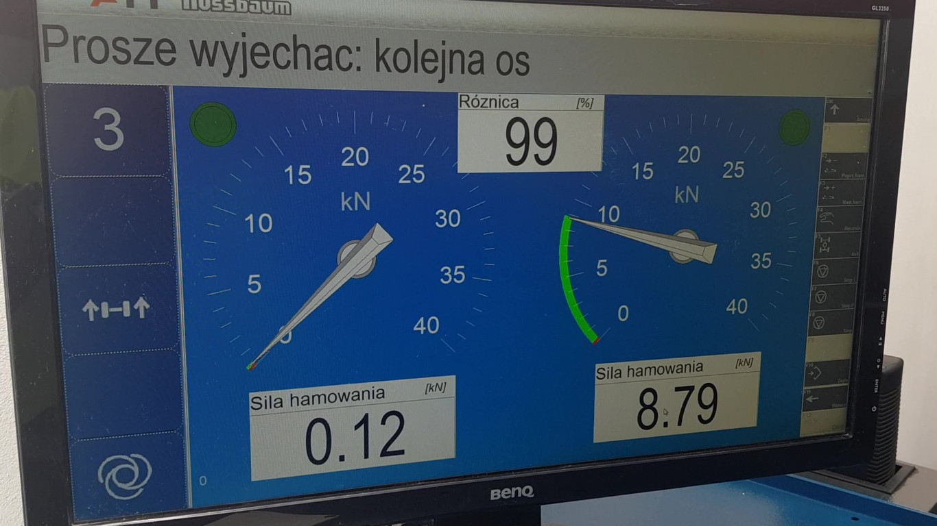 Badanie na urządzeniu rolkowym potwierdziło wcześniejsze przypuszczenia inspektorów. Na lewym kole trzeciej osi nie występowała siła hamowania hamulca roboczego. Na lewym kole drugiej osi siła hamowania hamulca roboczego była zbyt mała. Różnica sił hamowania hamulca roboczego drugiej osi wyniosła 82%.