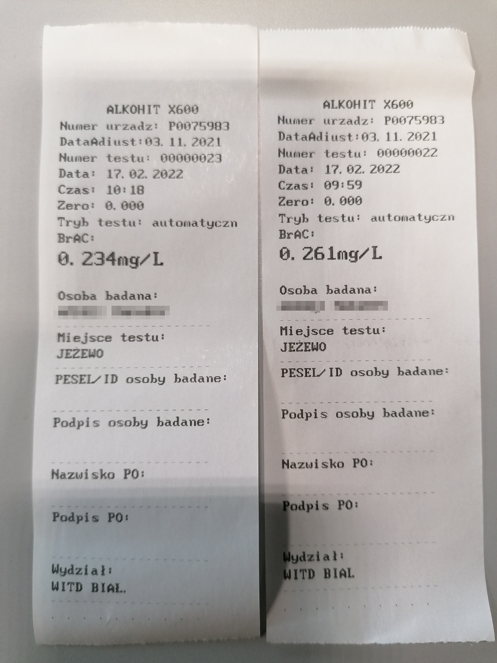 Kierowcę, obywatela Białorusi, poddano badaniu trzeźwości. Pierwszy pomiar na zawartość alkoholu w wydychanym powietrzu wykazał 0,261 mg/l. Drugi pomiar to 0,234 mg/l. Stanowi to blisko 0,5 promila alkoholu w wydychanym powietrzu.