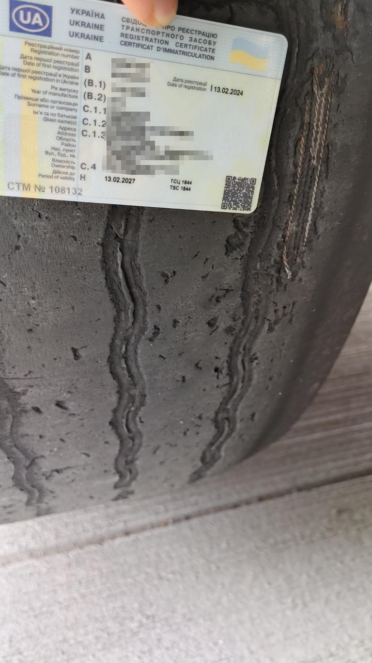Ostatni z przypadków dotyczył przewozu zwykłego nowych opon z Łotwy na Ukrainę realizowany także przez przewoźnika ukraińskiego. Kontrolujący zakwestionowali stan techniczny ogumienia naczepy, wskazując 2 opony w stopniu degradacji spełniającym definicję usterek niebezpiecznych. Postępowanie administracyjne zostało wszczęte na identyczną kwotę jak we wcześniejszych kontrolach na kwotę 2000 zł, a do chwili usunięcia usterek zatrzymano dowód rejestracyjny naczepy.