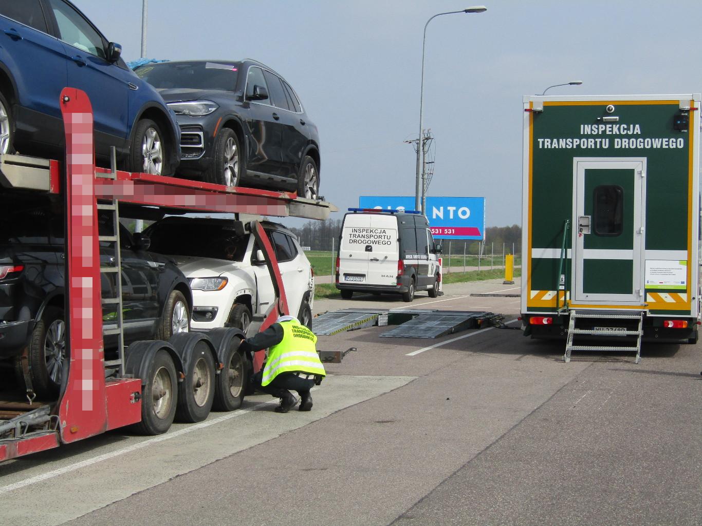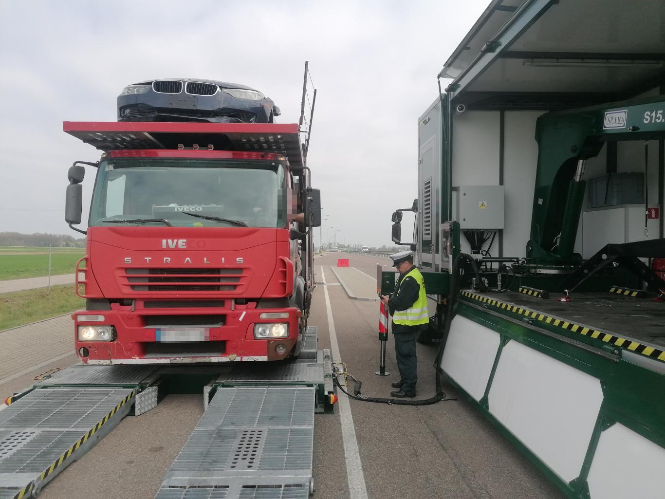 Zestaw specjalistyczny z przyczepą do przewozu samochodów osobowych w pełni załadowany poruszał się na trasie z Litwy na Ukrainę. Wykorzystując stację diagnostyczną inspektorzy przeprowadzili szczegółową kontrolę stanu technicznego.
